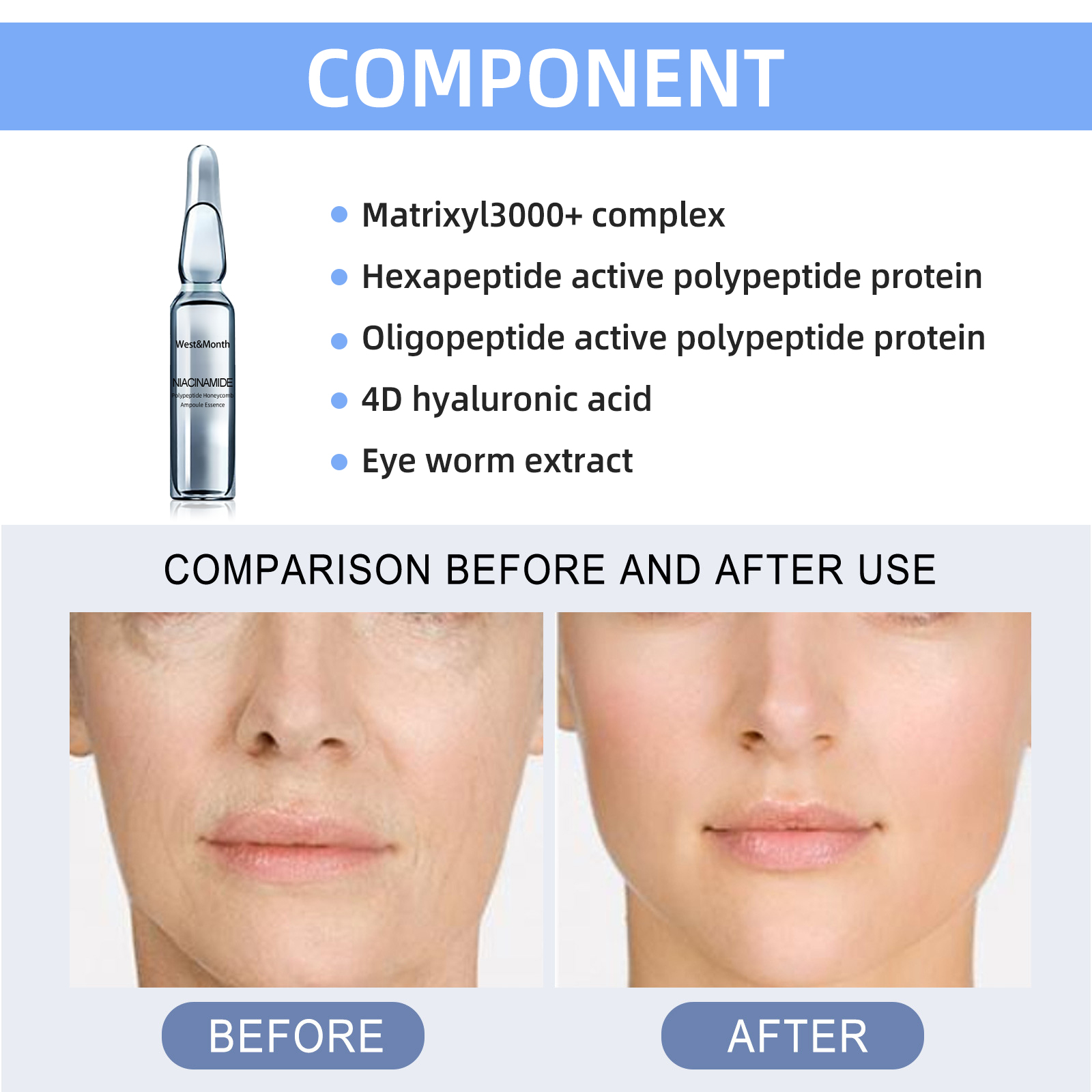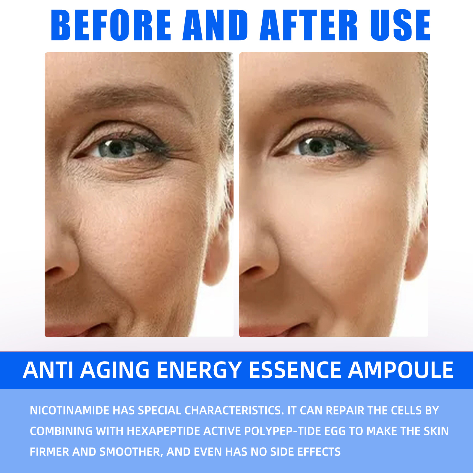 我们的能量精华安瓶含有六肽活性多肽蛋白、寡肽活性多肽蛋白、4D透明质酸、眼虫提取物。它可以修复细胞,使皮肤更紧致光滑,甚至无副作用。它的使用方法很简单:首先洗脸并擦干,然后将本品轻轻涂抹在脸上按圈按摩,直至完全吸收,最后压在上面,并在24小时内使用。并且可以减少细纹和皱纹。