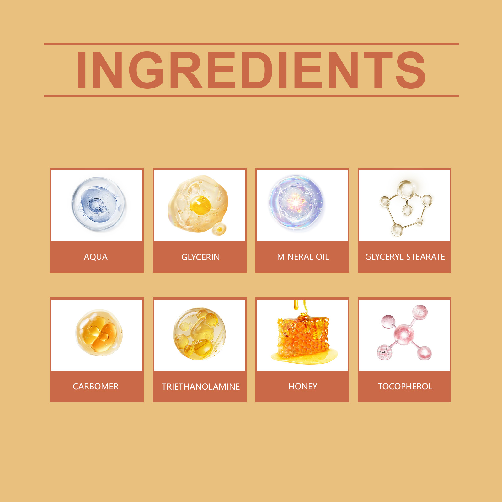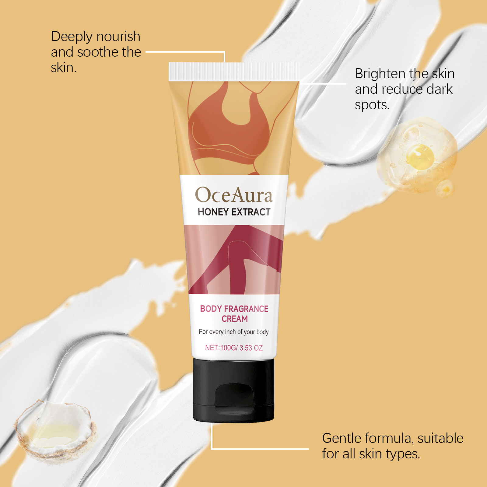 我们的身体护理霜含有三乙醇胺、蜂蜜、维生素E(生育酚)。它可以有效去除狐臭,防止细菌滋生,保持清新。它的使用方法很简单:彻底清洁并擦干皮肤。取适量本品,均匀涂抹于面部、手、脚、腋窝,上唇、背部、胸部、手臂、背部、大腿、臀部、头皮和皮肤私处。轻轻按摩以促进更好的吸收。并且可以减少黑斑,提亮肤色,恢复肌肤光泽。