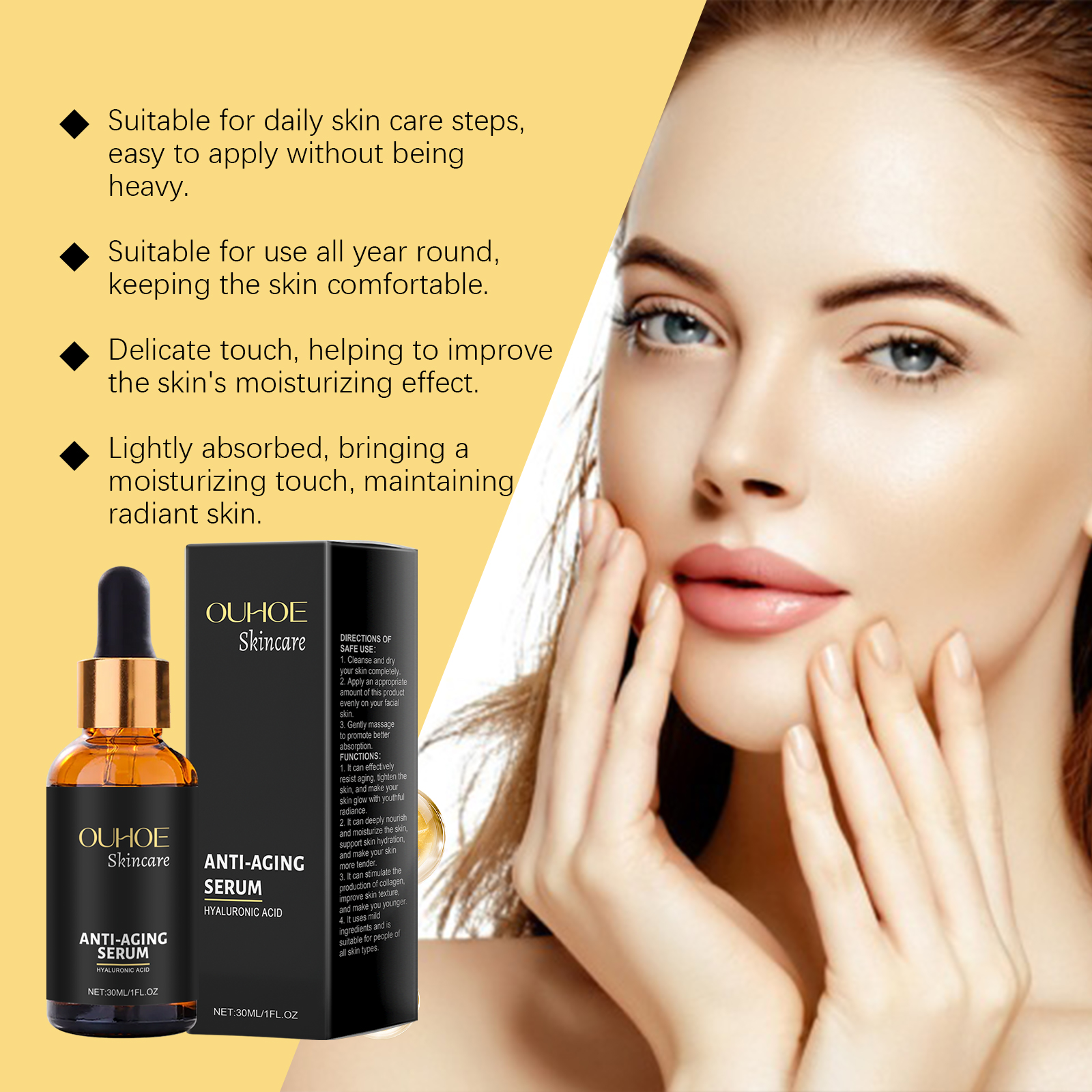 我们的面部保湿精华含有透明质酸、烟酰胺、氢化蓖麻油。它可以改善肤色光泽。它的使用方法很简单:彻底清洁并擦干皮肤。取适量本品均匀涂抹于面部肌肤。轻轻按摩以促进更好的吸收。并且可以减少皱纹和细纹,抚平肌肤。
