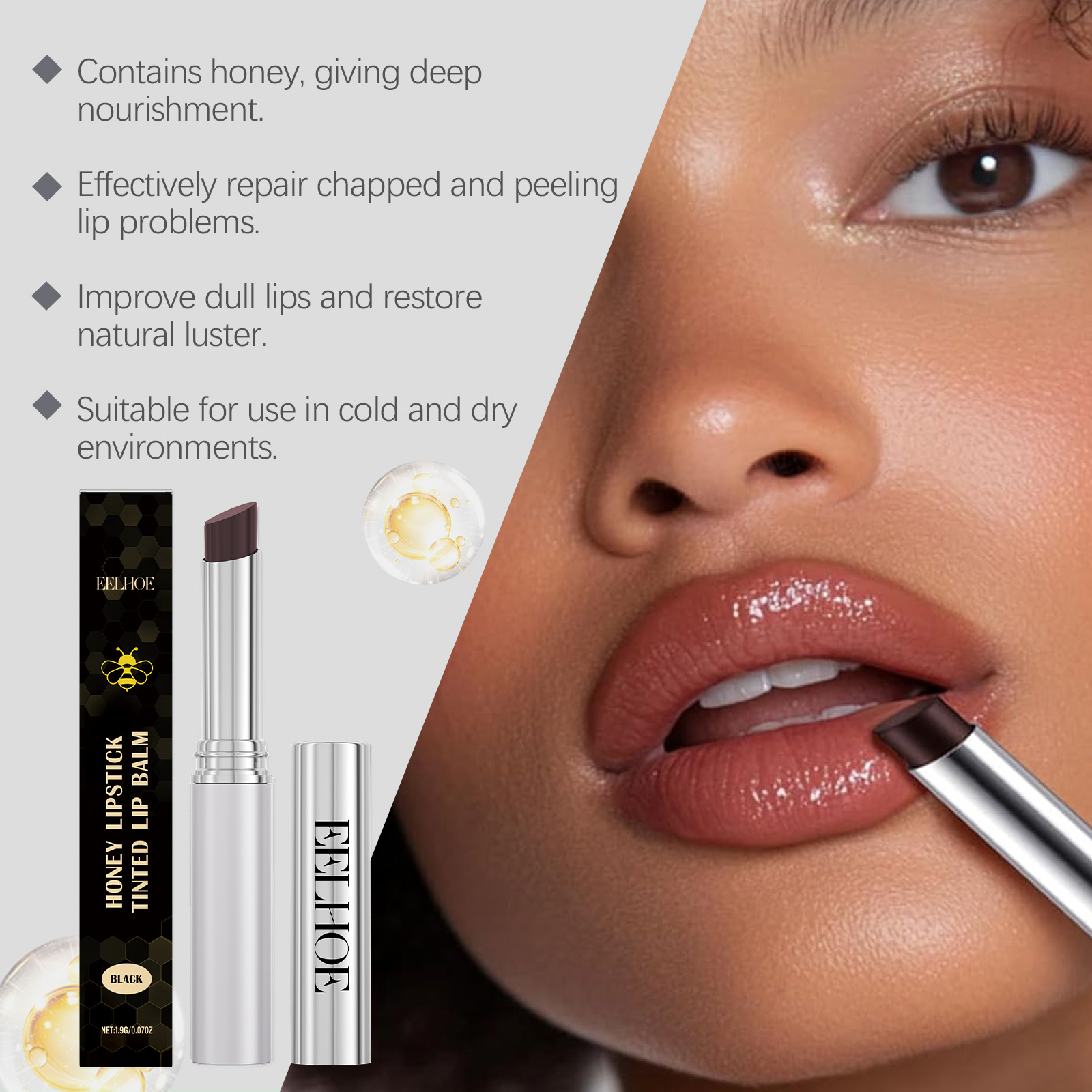 我们的保湿蜂蜜唇膏(黑色)含有白蜂蜡、维生素E、蜂蜜。它可以深层滋养双唇并防止唇部干裂。它的使用方法很简单:用温水轻轻清洁嘴唇,保持嘴唇干燥。取适量本品均匀涂抹于上下唇部,确保覆盖整个唇部。并且采用温和的成分,保护唇部皮肤。