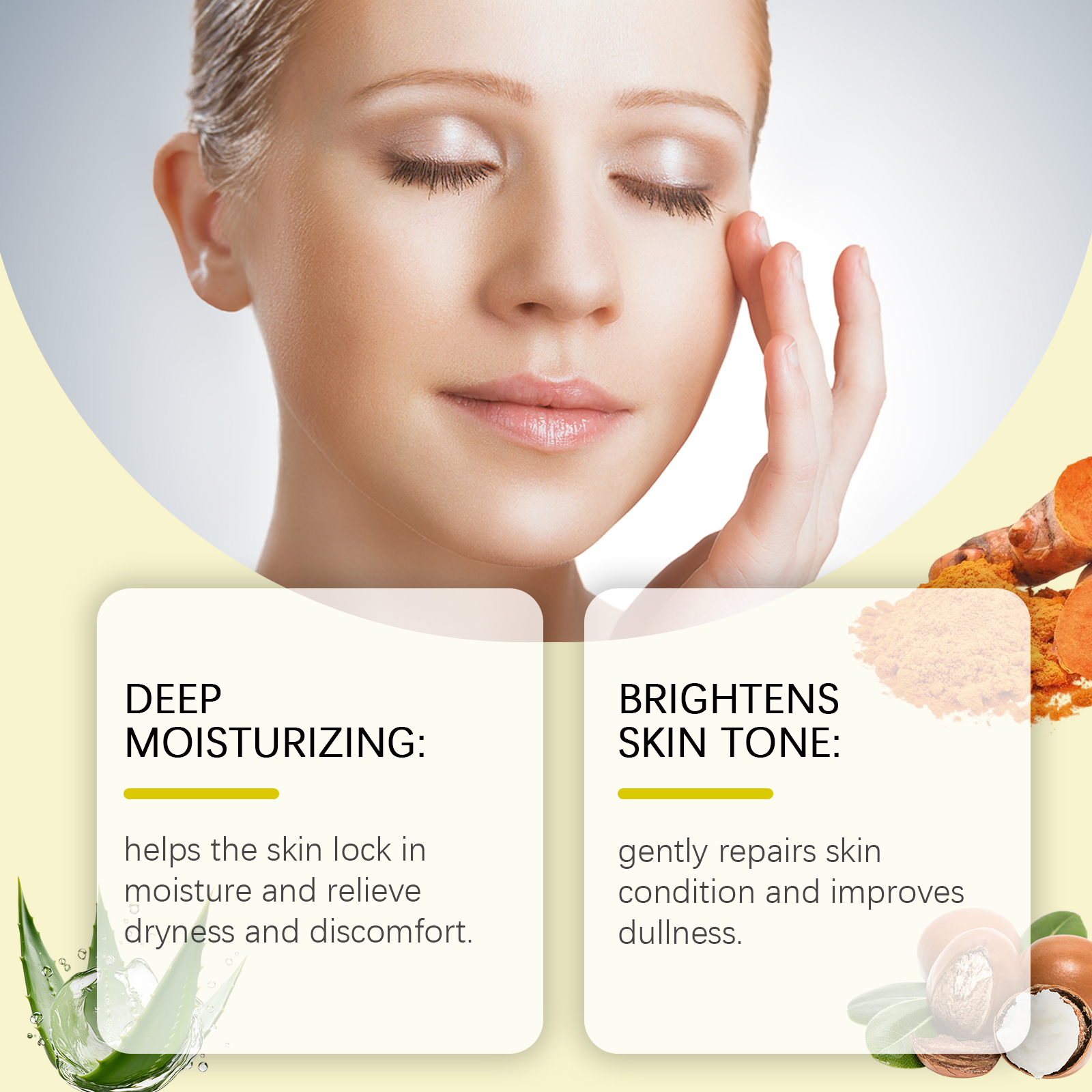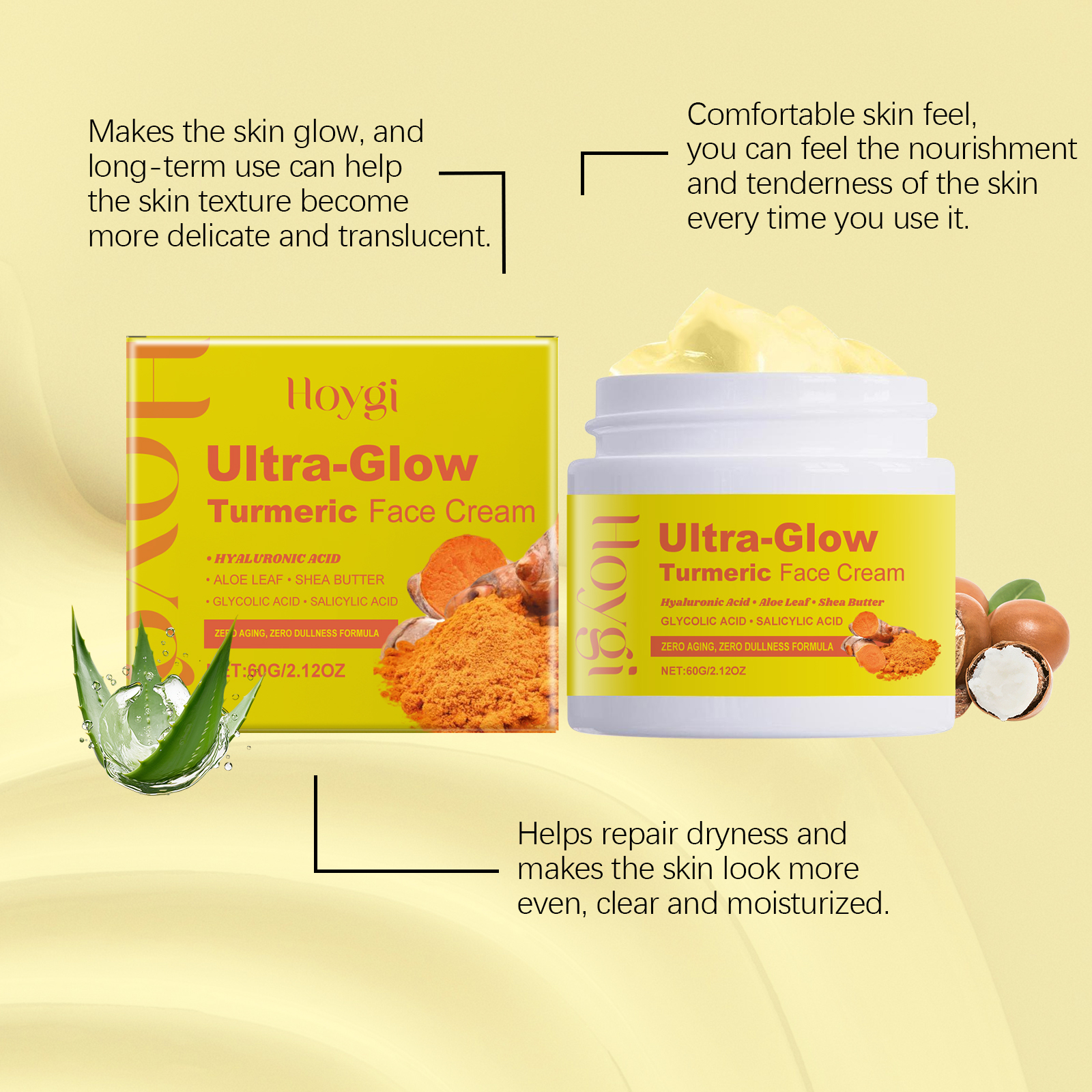 我们的姜黄保湿面霜含有乙醇酸、水杨酸、姜黄根提取物。它可以帮助肌肤锁住水分,缓解干燥和不适。它的使用方法很简单:清洁你的脸并保持干燥。取适量本品均匀涂抹于面部。轻轻按摩直至吸收。并且可以温和修复肌肤状况,改善肤色暗沉。