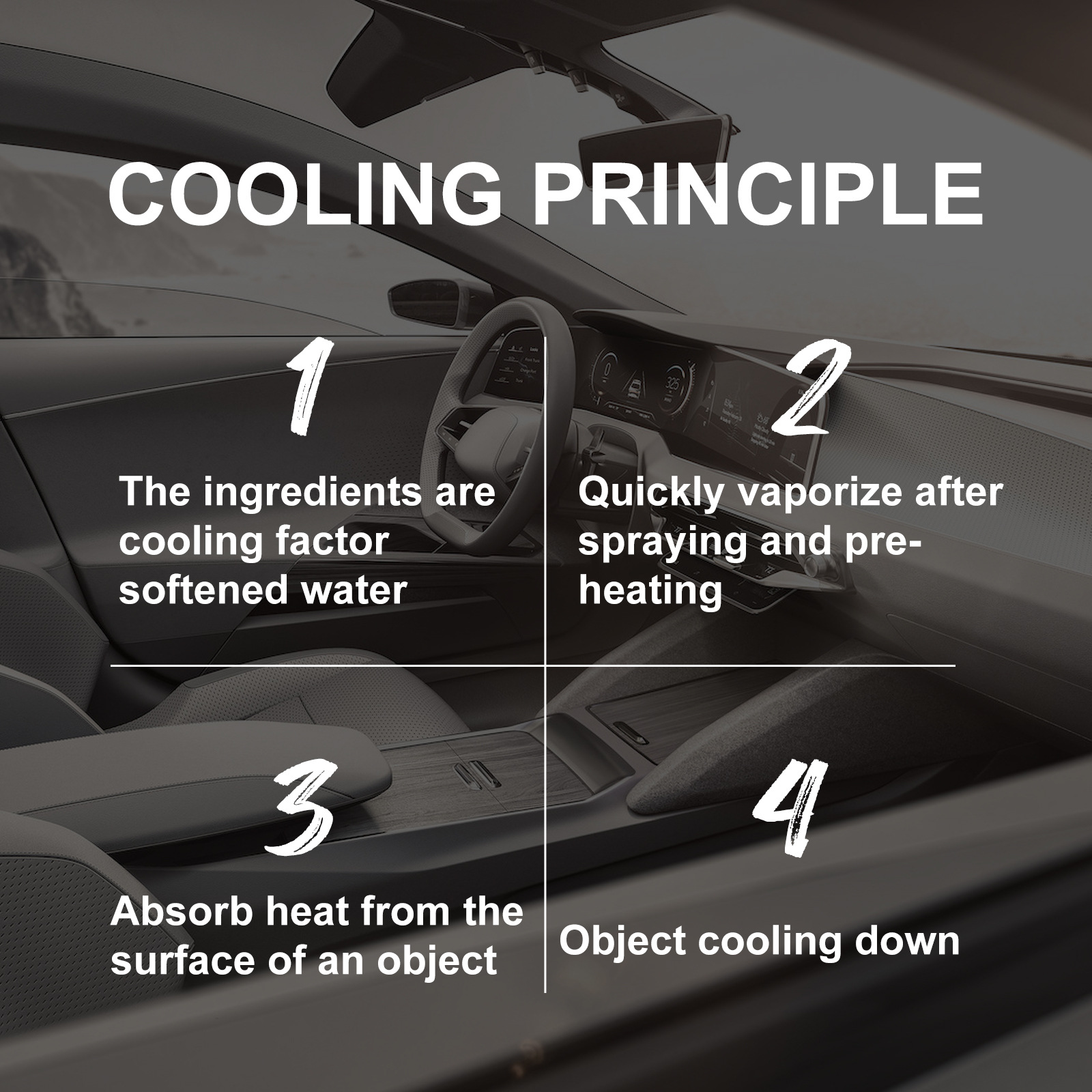 我们的汽车降温喷雾含有丙烷、软化剂、苯氧乙醇。它可以快速降低车内温度,让您在夏天可以舒适凉爽地驾驶。它的使用方法很简单:使用前请将本品均匀摇匀,使用后请保持喷头通畅,用喷嘴均匀连续地喷射到高温部位,如座垫、靠背和方向盘。可以使车内迅速降温。