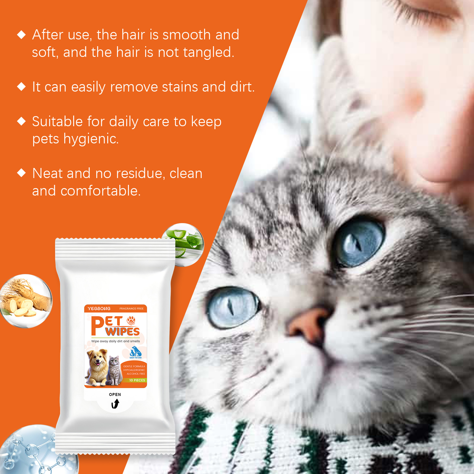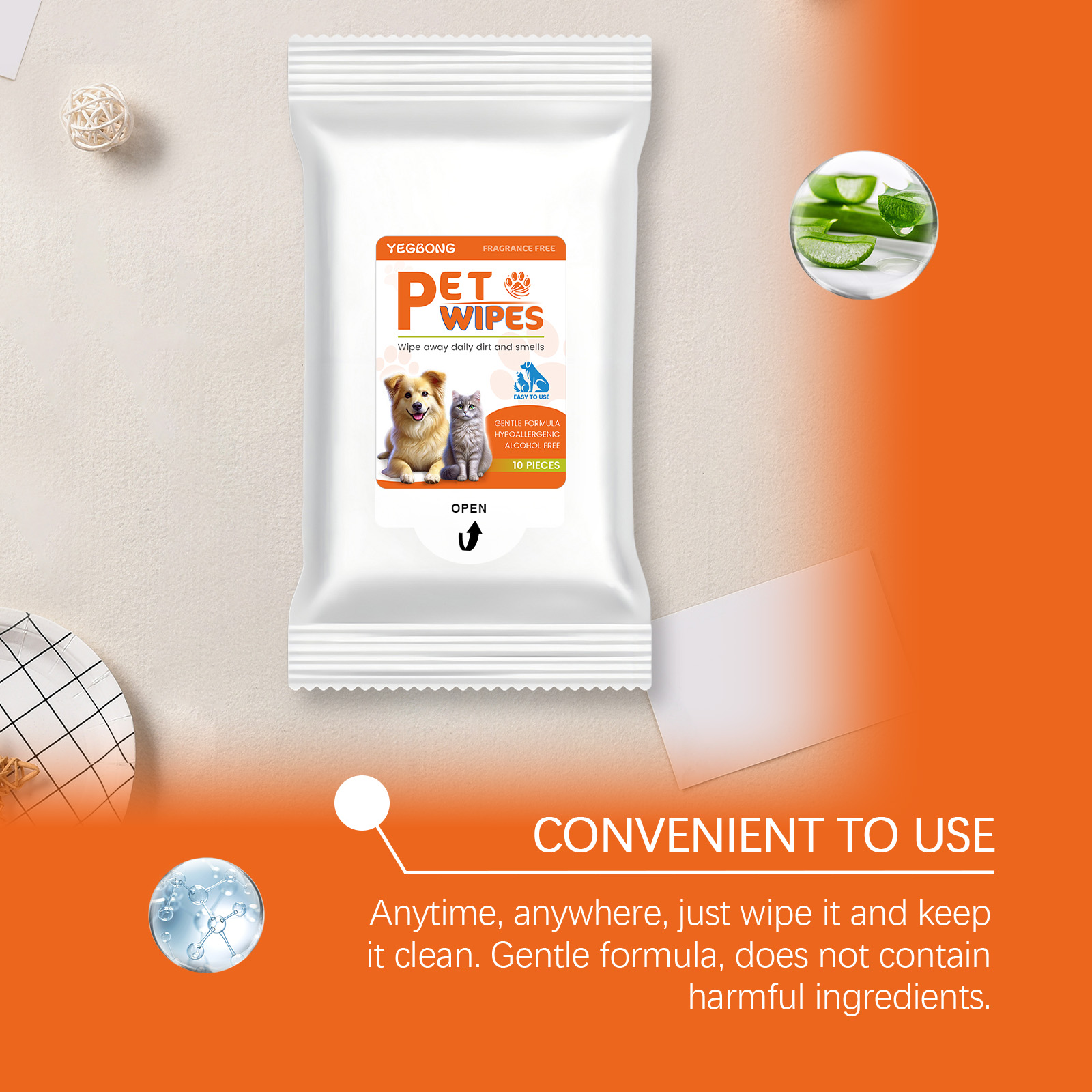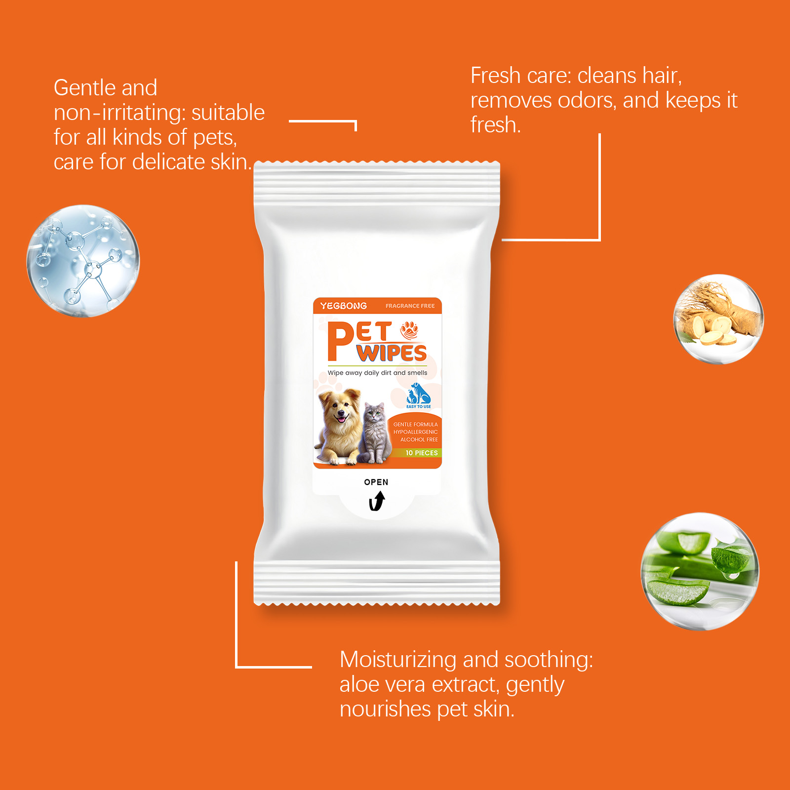 我们的宠物湿巾含有表面活性剂、吸湿剂。它可以有效去除宠物身上的污垢和皮屑,恢复宠物的自然光彩。快速消除异味,留下淡淡的香气,让您的宠物时刻保持清新。它的使用方法很简单:1.打开包装并取出湿巾。2.轻轻擦拭宠物需要清洁的部分。并且可以使用温和无刺激成分,细心呵护宠物娇嫩的肌肤,保持宠物的卫生和健康。