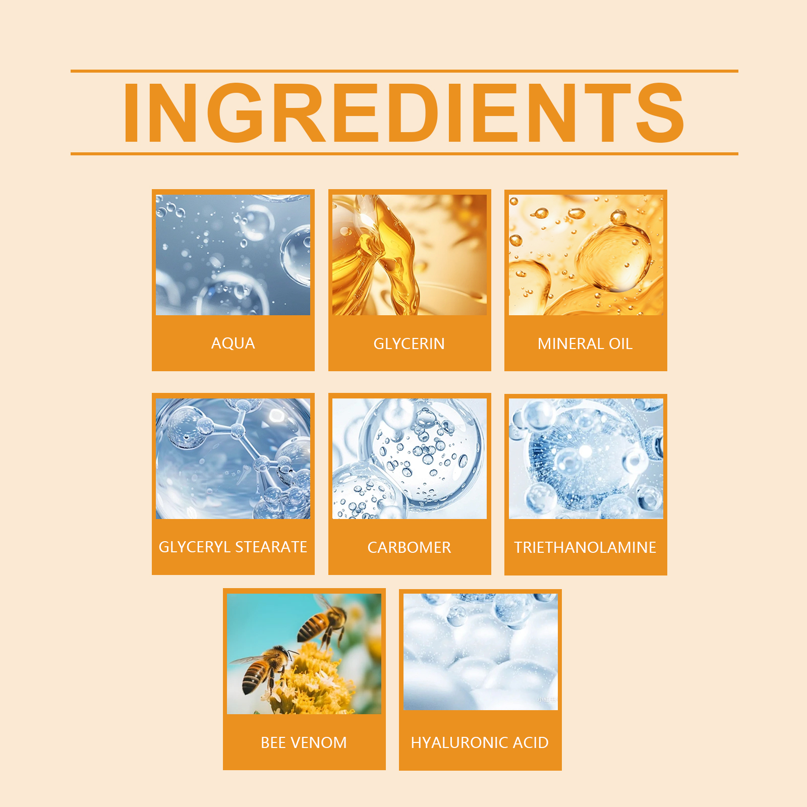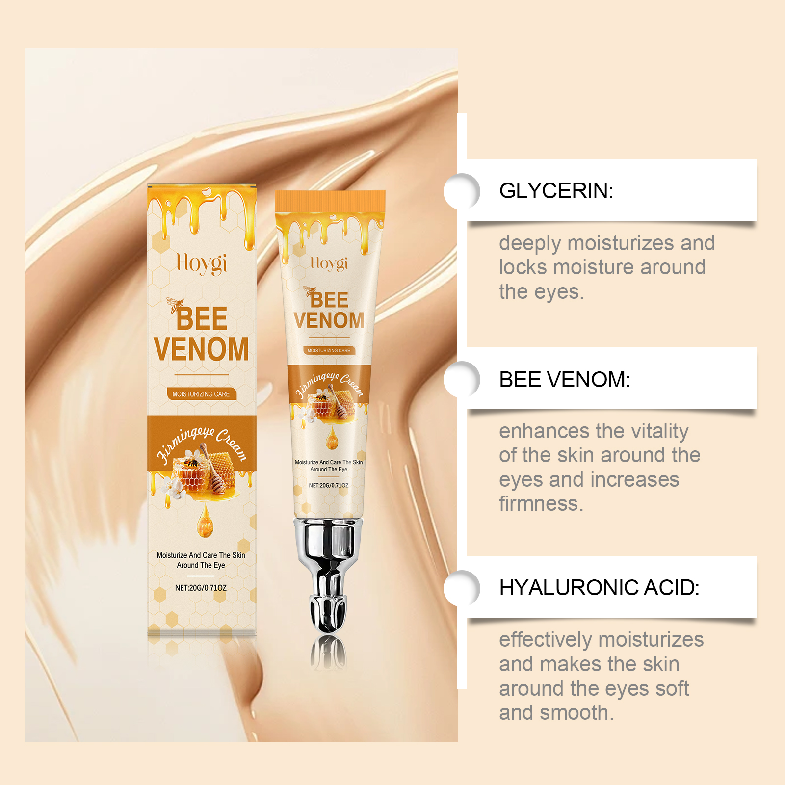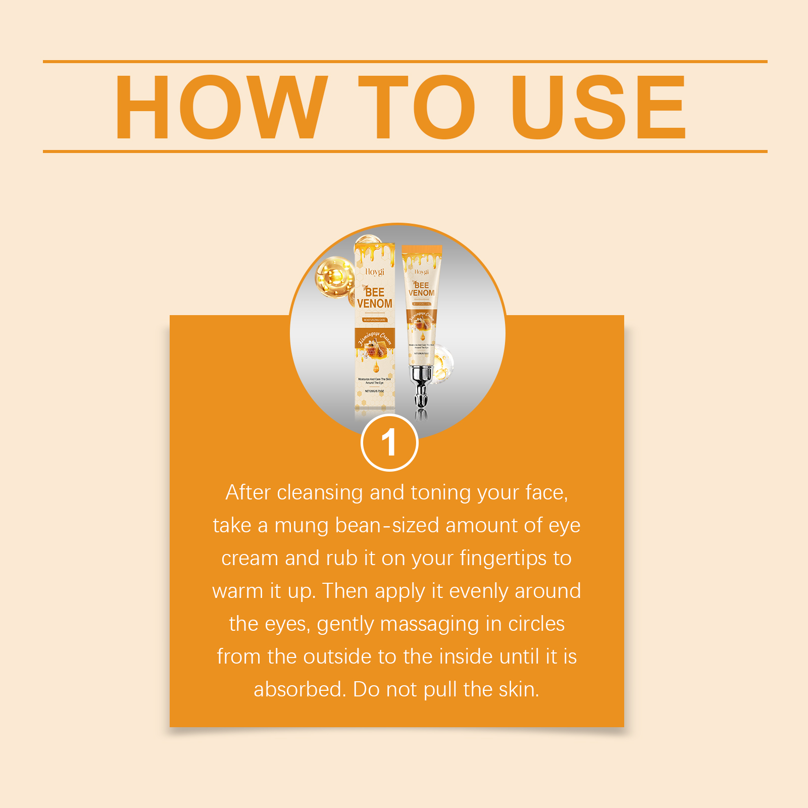 我们的滋润眼霜含有三乙醇胺、蜂毒、透明质酸。它可以促进皮肤紧致并延缓衰老。它的使用方法很简单:洁面爽肤后,取绿豆大小的眼霜,用指尖温热它。然后均匀地涂抹在眼周,从外到内轻轻按摩,直到完全吸收。不要拉扯皮肤。并且可以深层滋润和保湿眼睛周围的皮肤。