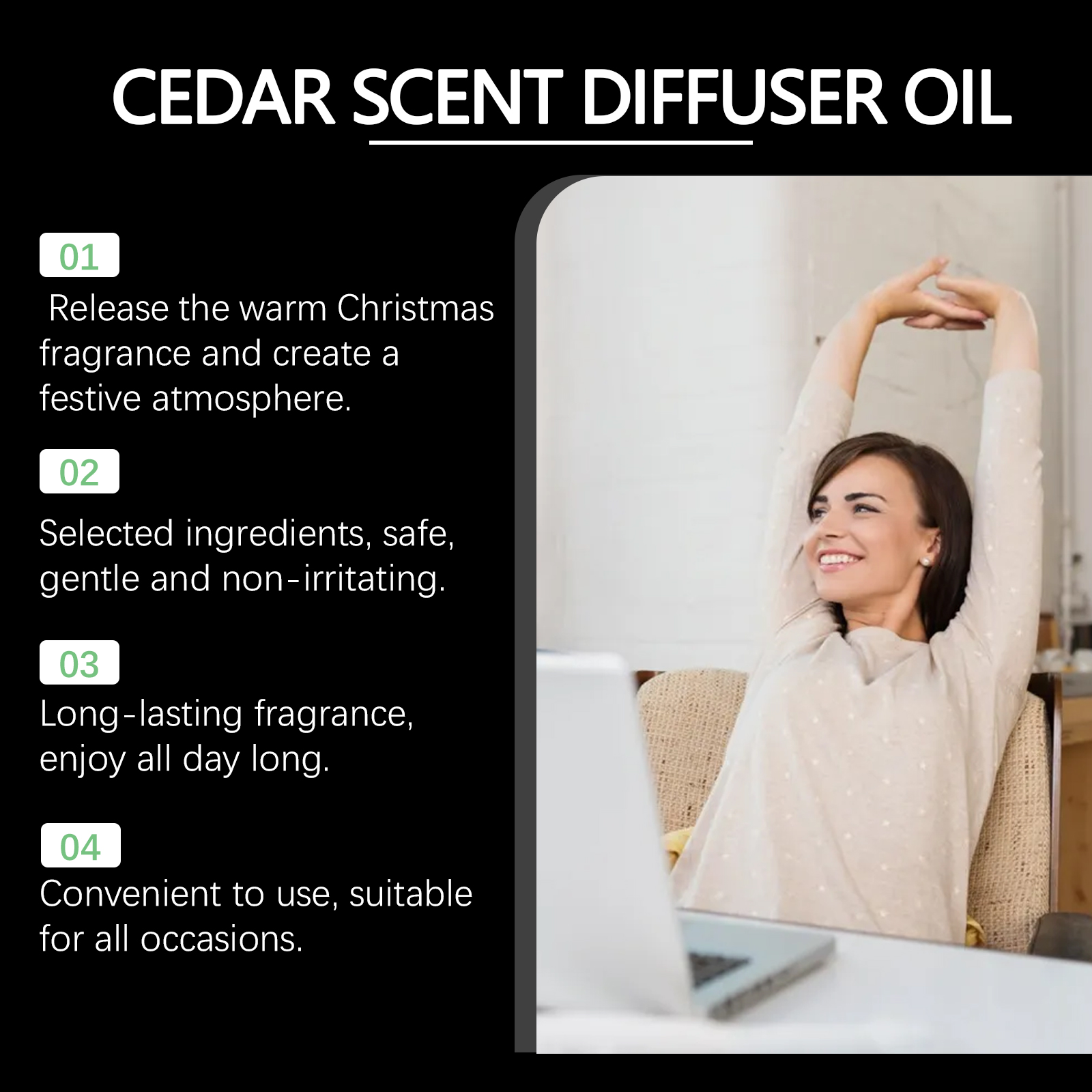 我们的圣诞香薰精油含有甘油、丁二醇。它可以营造一个温馨的节日氛围,为你的家增添温暖。持久的清新木质香气,让你快乐很长时间。它的使用方法很简单:扩散器和加湿器:将适量的精油滴入设备中,以散发香气。喷雾器:将精油与水混合,然后喷洒到空气中或织物上。肥皂或蜡烛制作:将精油添加到肥皂或蜡基中,以制作有香味的产品。并且可以适用于扩散器、加湿器、蜡烛等,以创造温暖的秋季氛围并增强家庭氛围。
