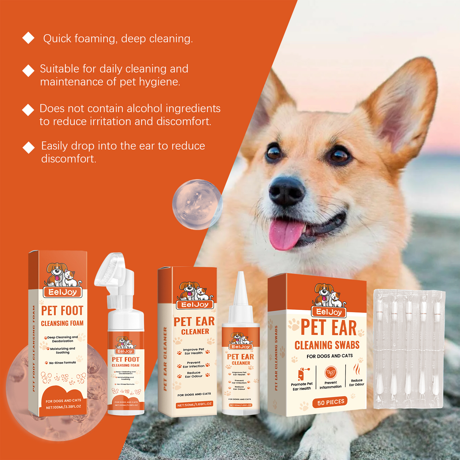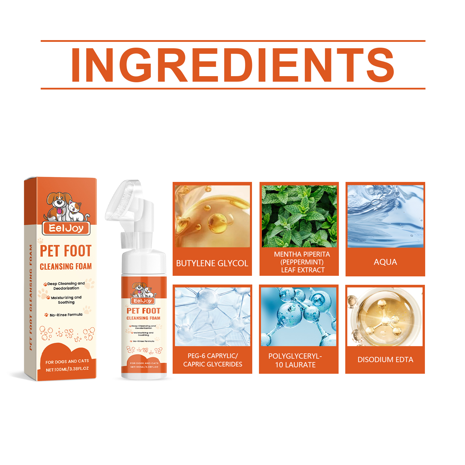 我们的足部泡沫清洁剂含有EDTA 二钠、薄荷提取物。它可以深入难以触及的区域,彻底清洁不留死角,保护宠物的足部健康。它的使用方法很简单:先用泵头激活泡沫;使用柔软的硅胶刷头清洁宠物的爪子;最后,擦干宠物的爪子。并且可以快速清洁,效果显著。