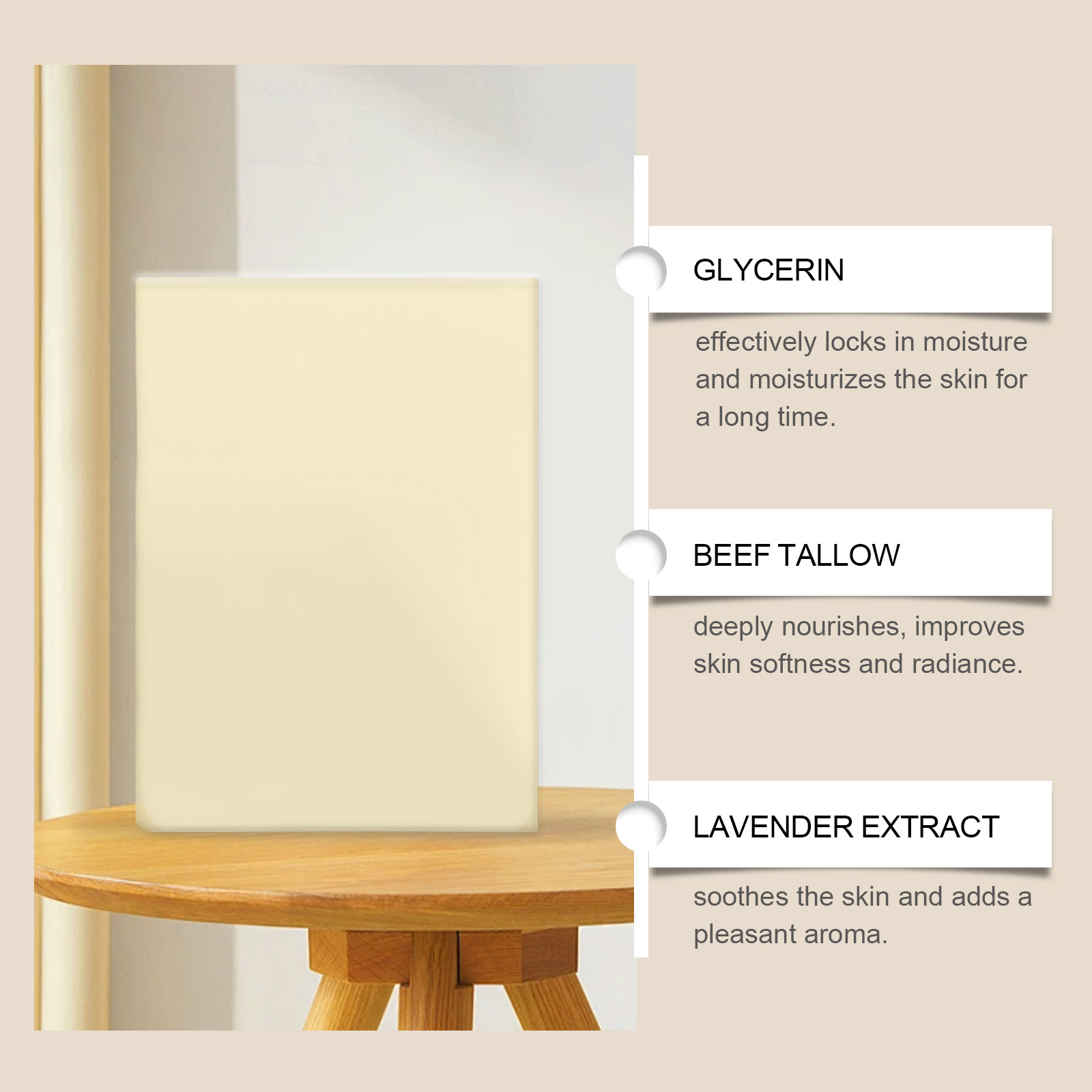 我们的草本牛脂保湿皂,由棕榈油酸钠、硬脂酸精心调配而成。专为长效锁水,持久保湿设计。使用方法极为便捷:用温水润湿皮肤,取适量本品,在手心搓出泡沫,涂抹于皮肤上,按摩约1-2分钟,用清水冲洗。并且可以适合敏感肌肤,日常使用无负担。精选植物提取物,呵护肌肤。
