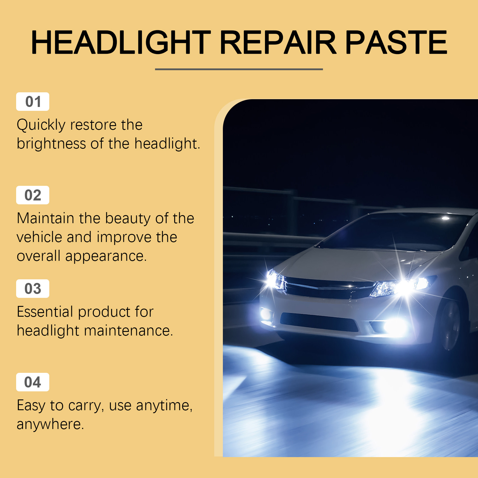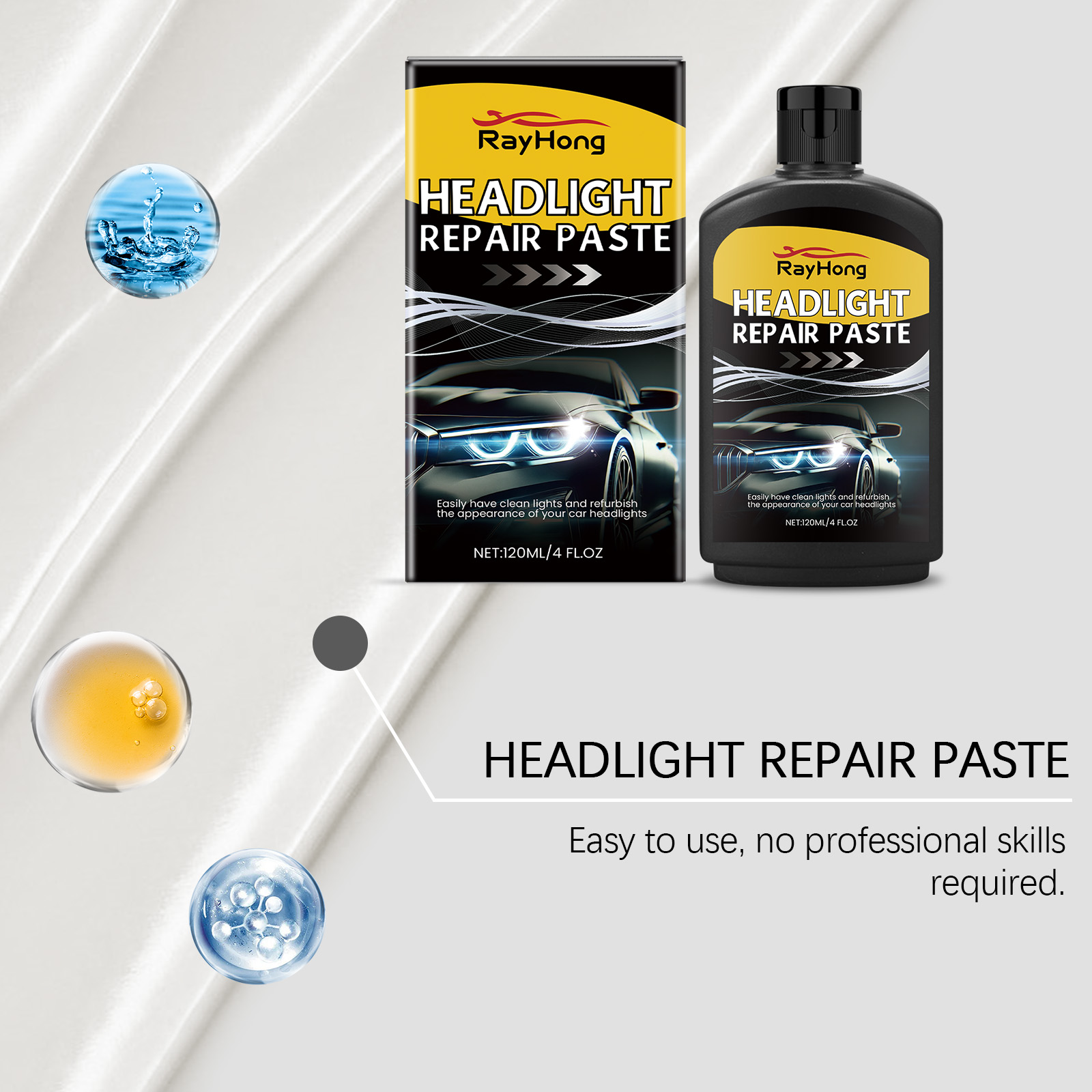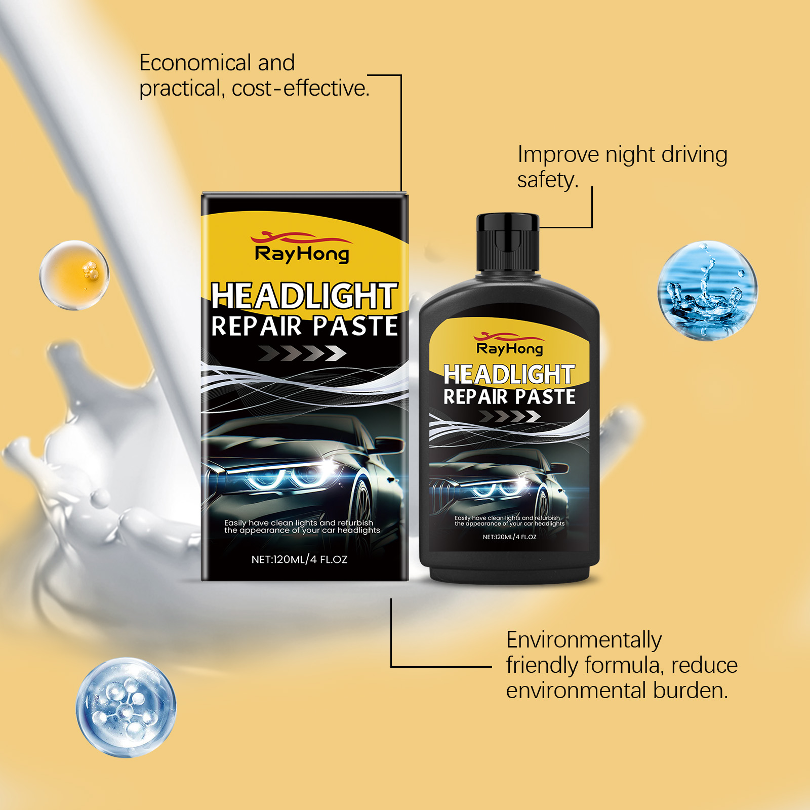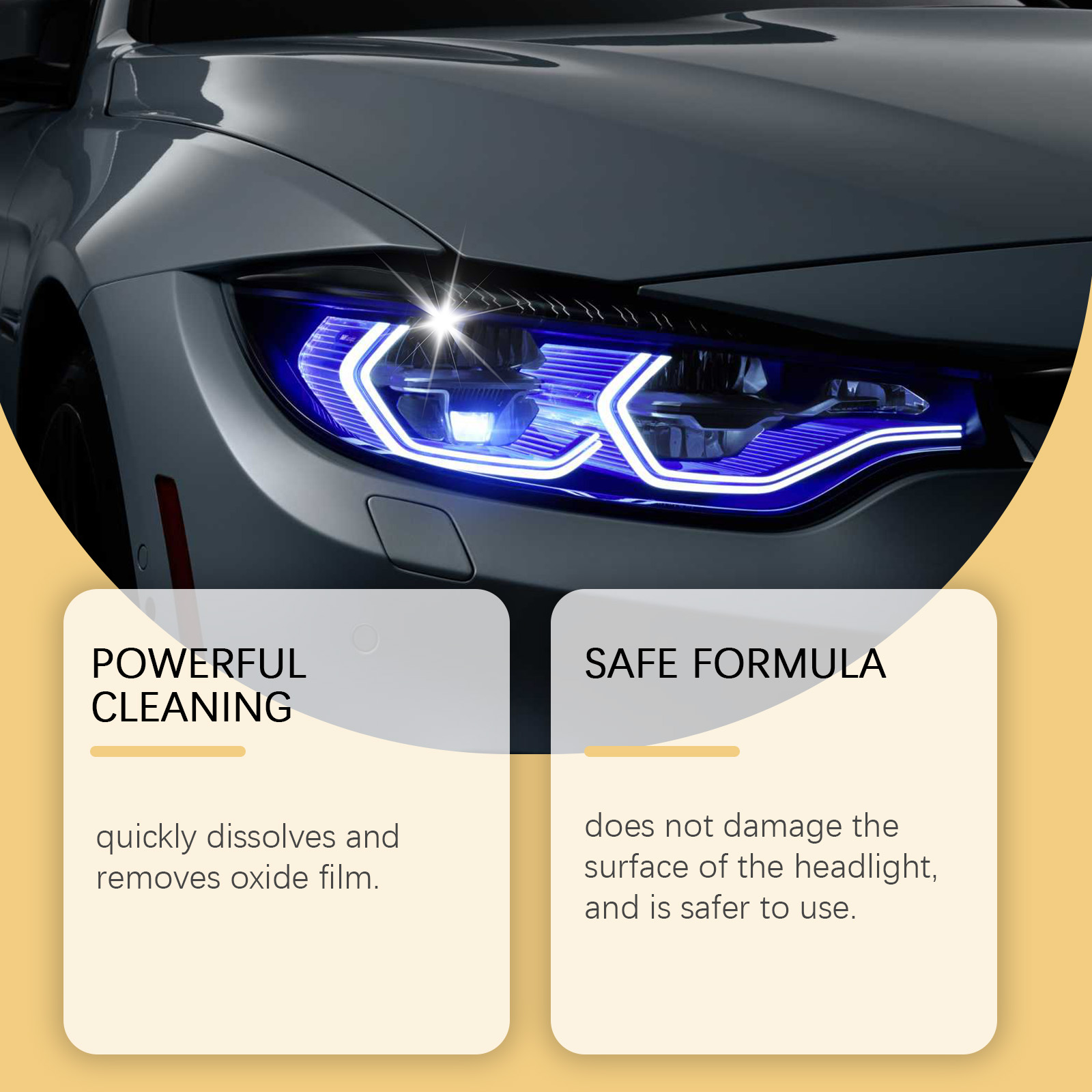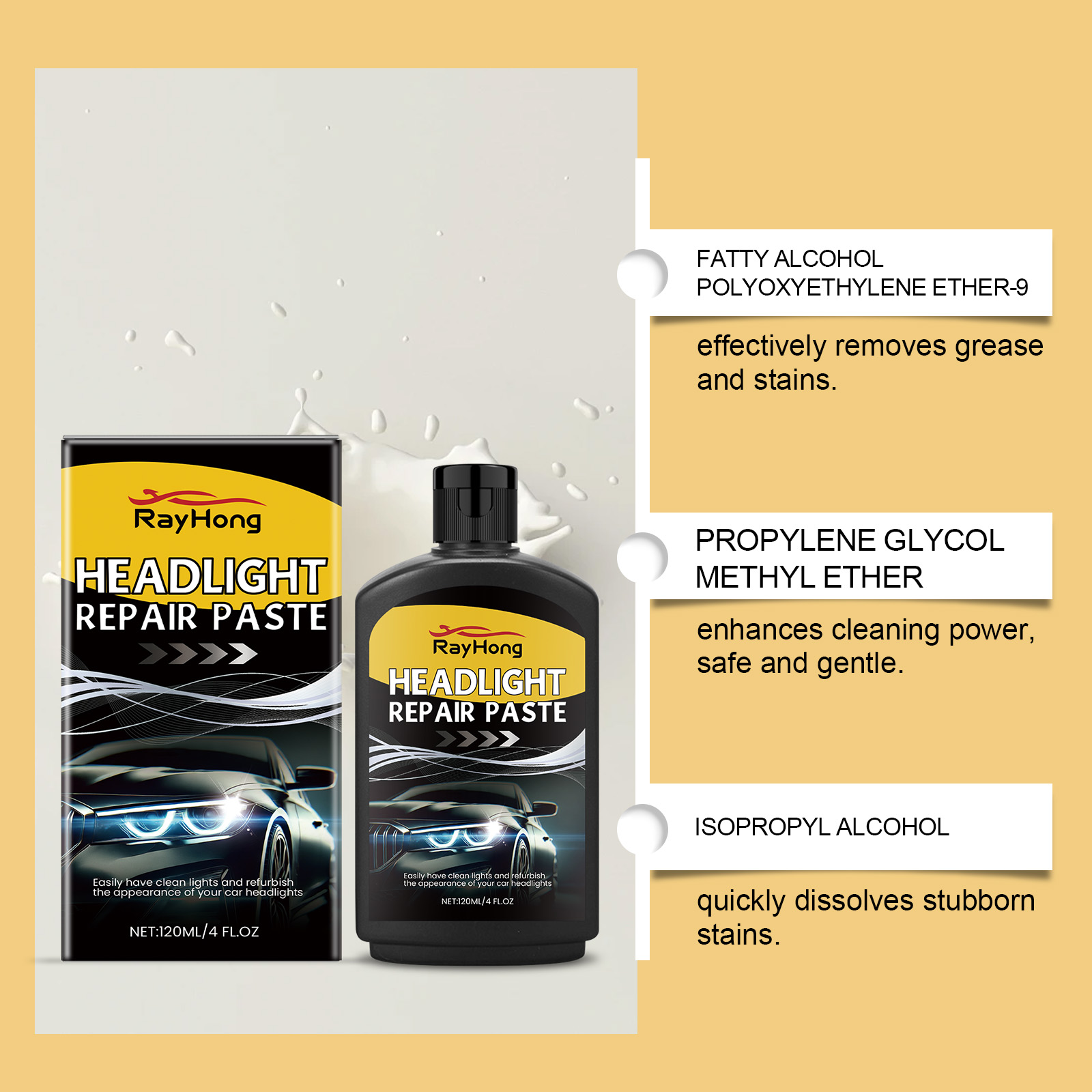 我们的汽车大灯护理剂,由脂肪醇聚氧乙烯醚-9、丙二醇甲醚精心调配而成。专为快速分解氧化物层,恢复前照灯的透光率设计。使用方法极为便捷:清洁灯头区域的灰尘、污垢或其他杂质。取适量本品,均匀涂抹于肌肤表面。连续擦拭前照灯的表面,直到表面被抛光,用毛巾擦掉表面残留物。并且可以快速溶解并去除氧化物膜。不会损坏前照灯的表面,使用更安全。