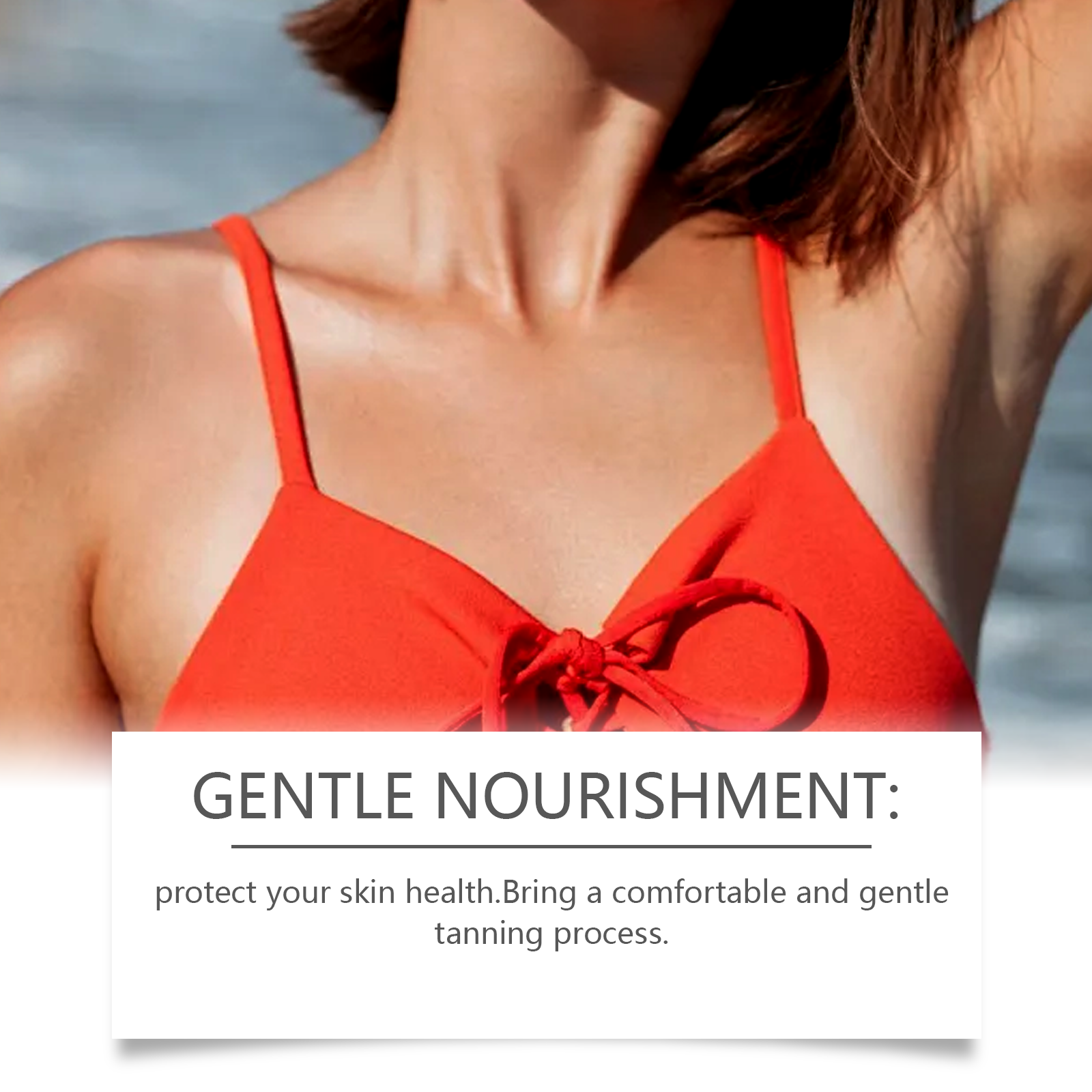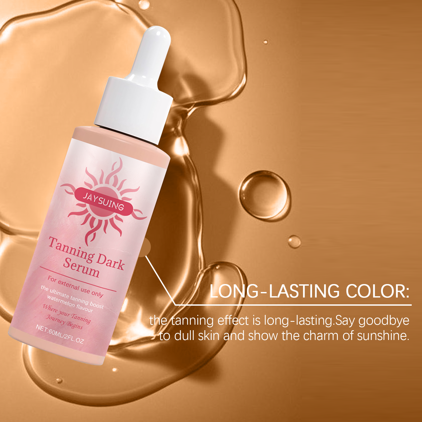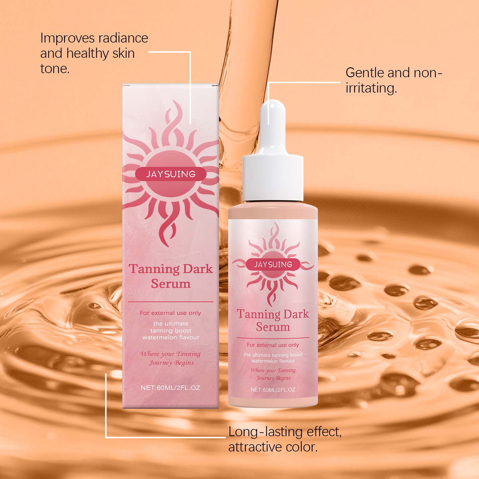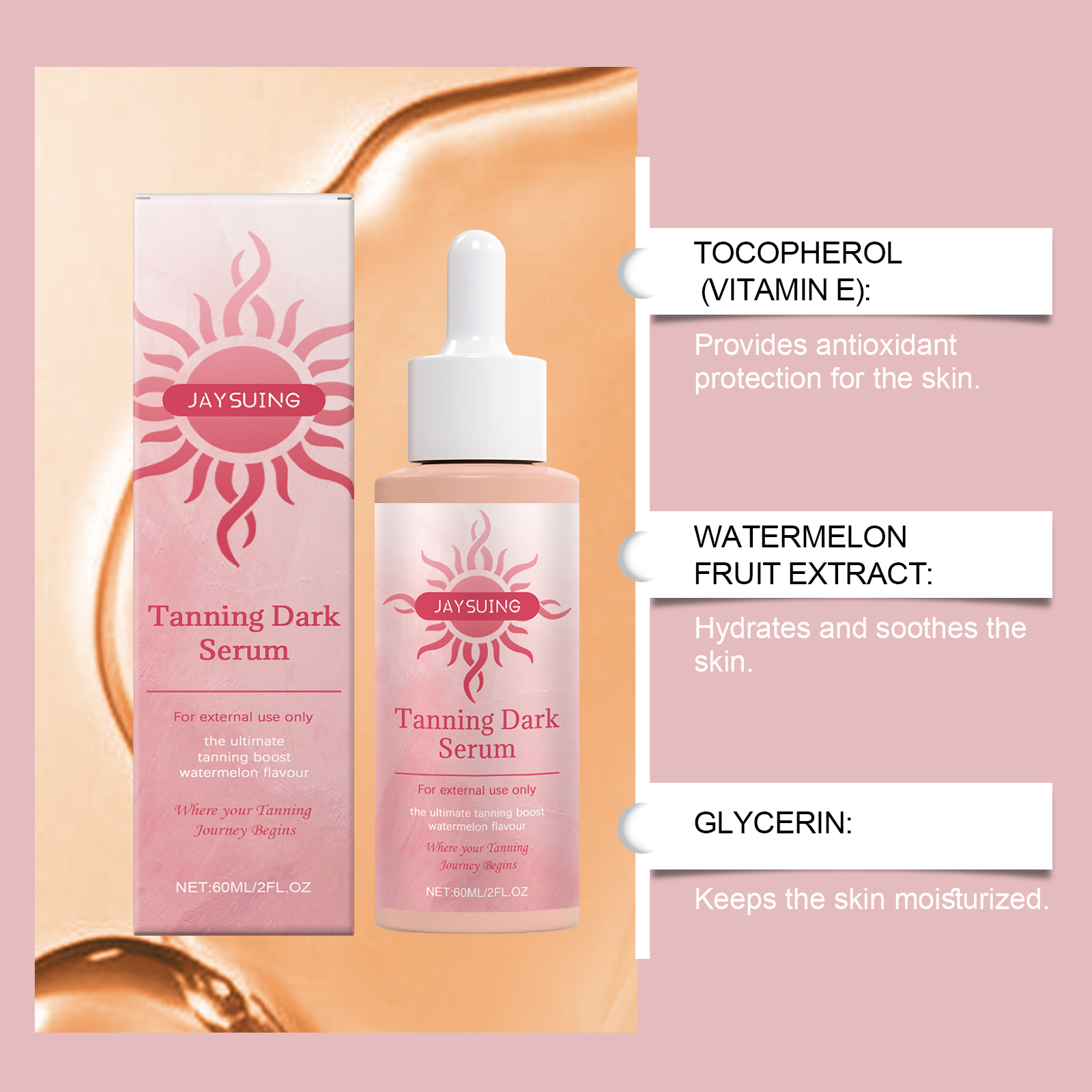 我们的免晒助黑精华液,由甘油、羟乙基纤维素、生育酚(维生素E)精心调配而成。专为保护您的皮肤健康。带来舒适和温和的晒黑过程设计。使用方法极为便捷:清洁身体并保持干燥。将适量的本品均匀涂抹于身体上。轻轻按摩直至完全吸收。并且可以晒黑而不需要长时间曝光。长期使用会大大提高皮肤的光泽度。你的皮肤会焕发光彩。只需几滴精华液,你的皮肤就能轻松拥有古铜色。
