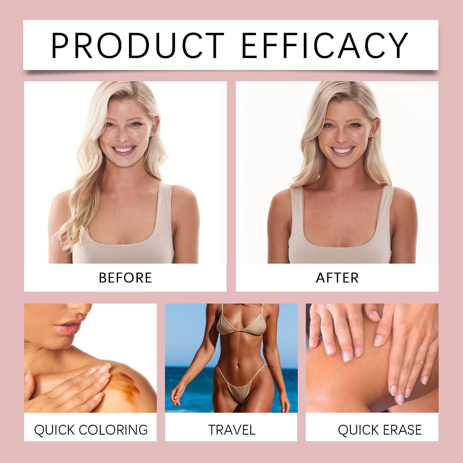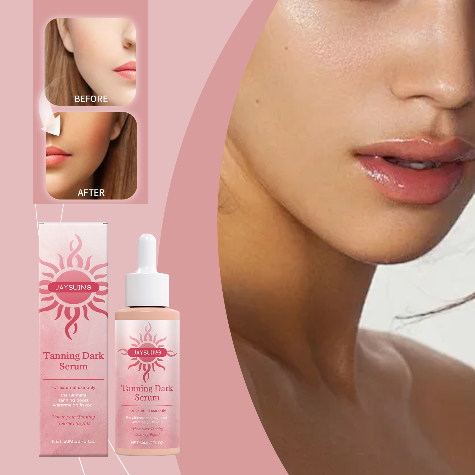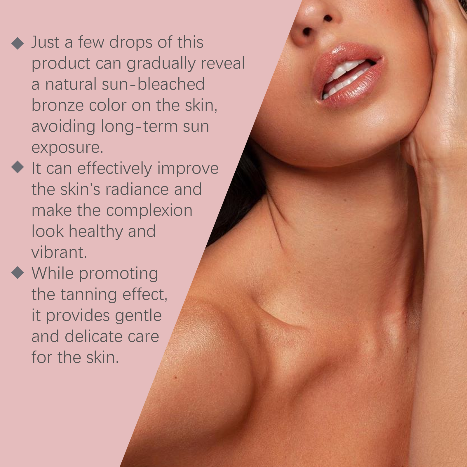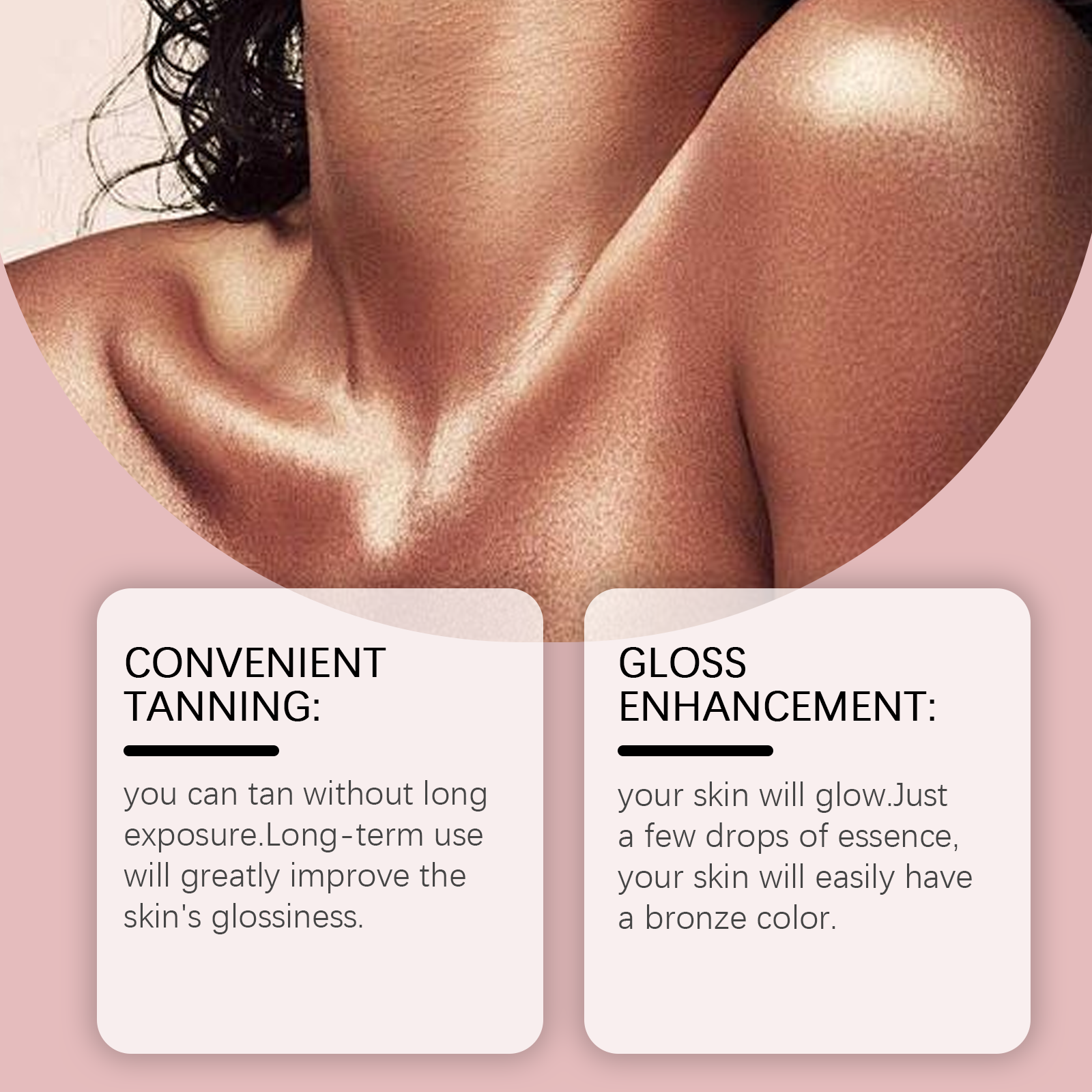 我们的免晒助黑精华液,由甘油、羟乙基纤维素、生育酚(维生素E)精心调配而成。专为保护您的皮肤健康。带来舒适和温和的晒黑过程设计。使用方法极为便捷:清洁身体并保持干燥。将适量的本品均匀涂抹于身体上。轻轻按摩直至完全吸收。并且可以晒黑而不需要长时间曝光。长期使用会大大提高皮肤的光泽度。你的皮肤会焕发光彩。只需几滴精华液,你的皮肤就能轻松拥有古铜色。