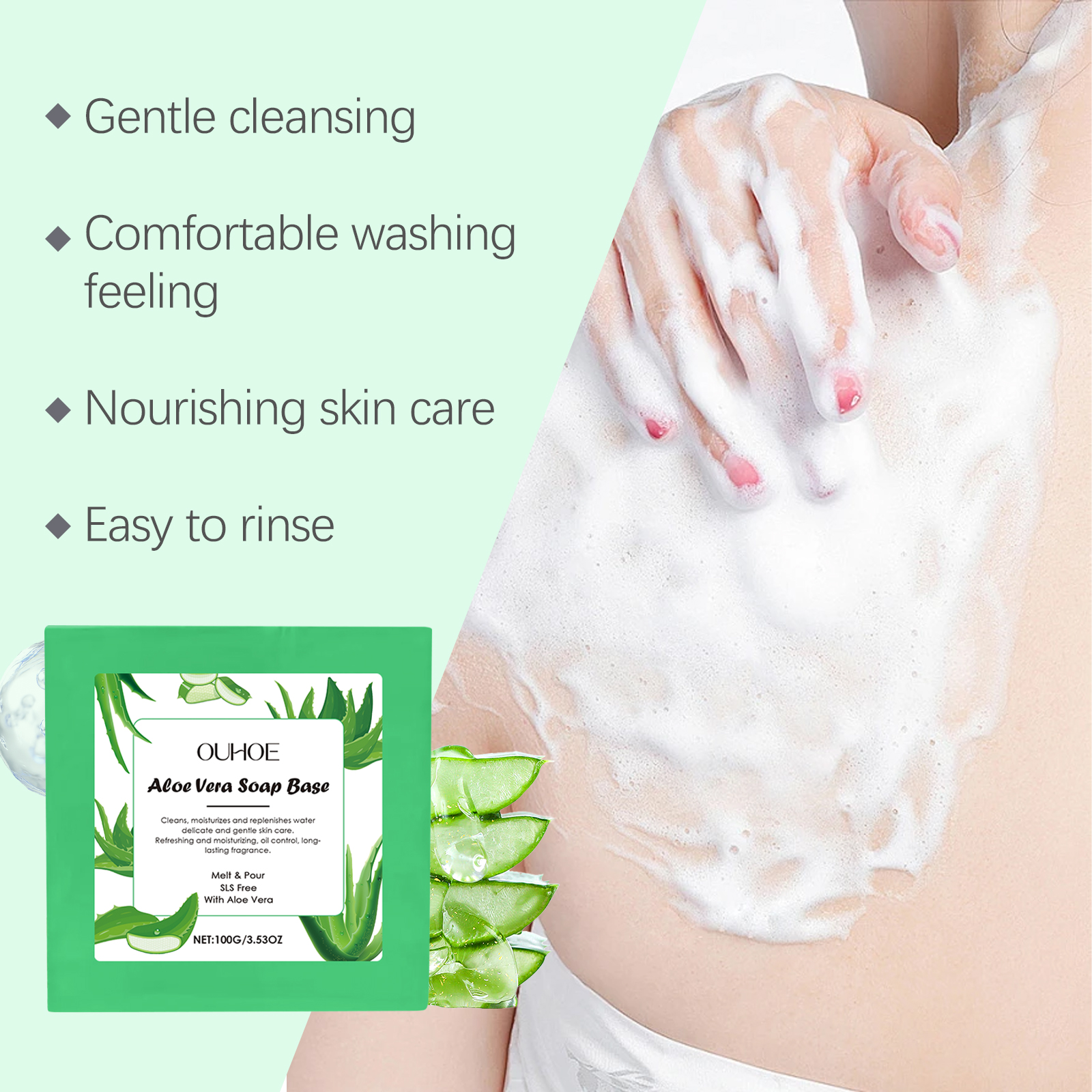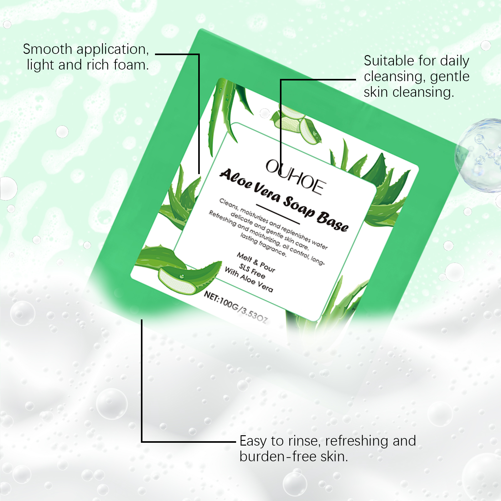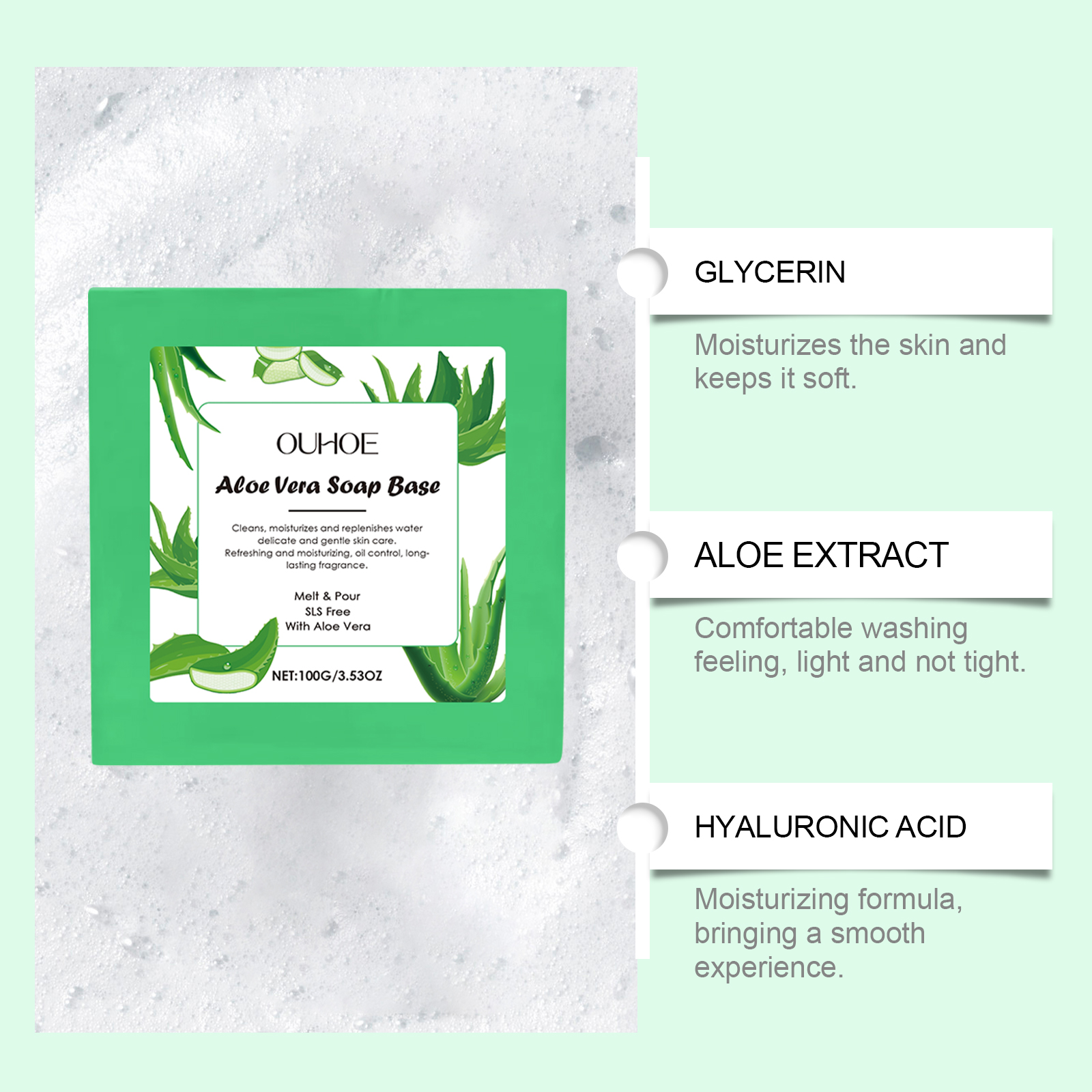 我们的芦荟温和清洁皂,由硬脂酸、甘油、EDTA二钠精心调配而成。专为清洁后皮肤感觉柔软细腻设计。使用方法极为便捷:将肥皂浸泡在水中并轻轻揉搓以产生泡沫。将泡沫均匀涂抹在身体皮肤上,以打圈方式轻柔按摩和清洁2-3分钟。用温水冲洗。并且细腻的泡沫包裹肌肤可以带来清爽体验。轻盈的泡沫触感顺渭清洁更细致。洗后清爽不紧绷,皮肤更加滋润。