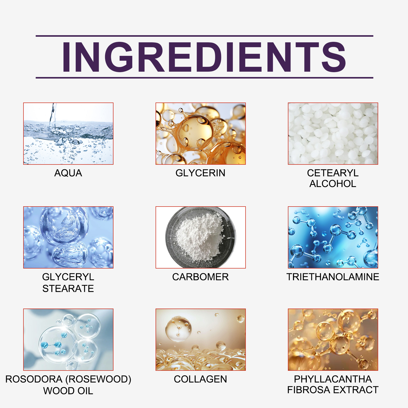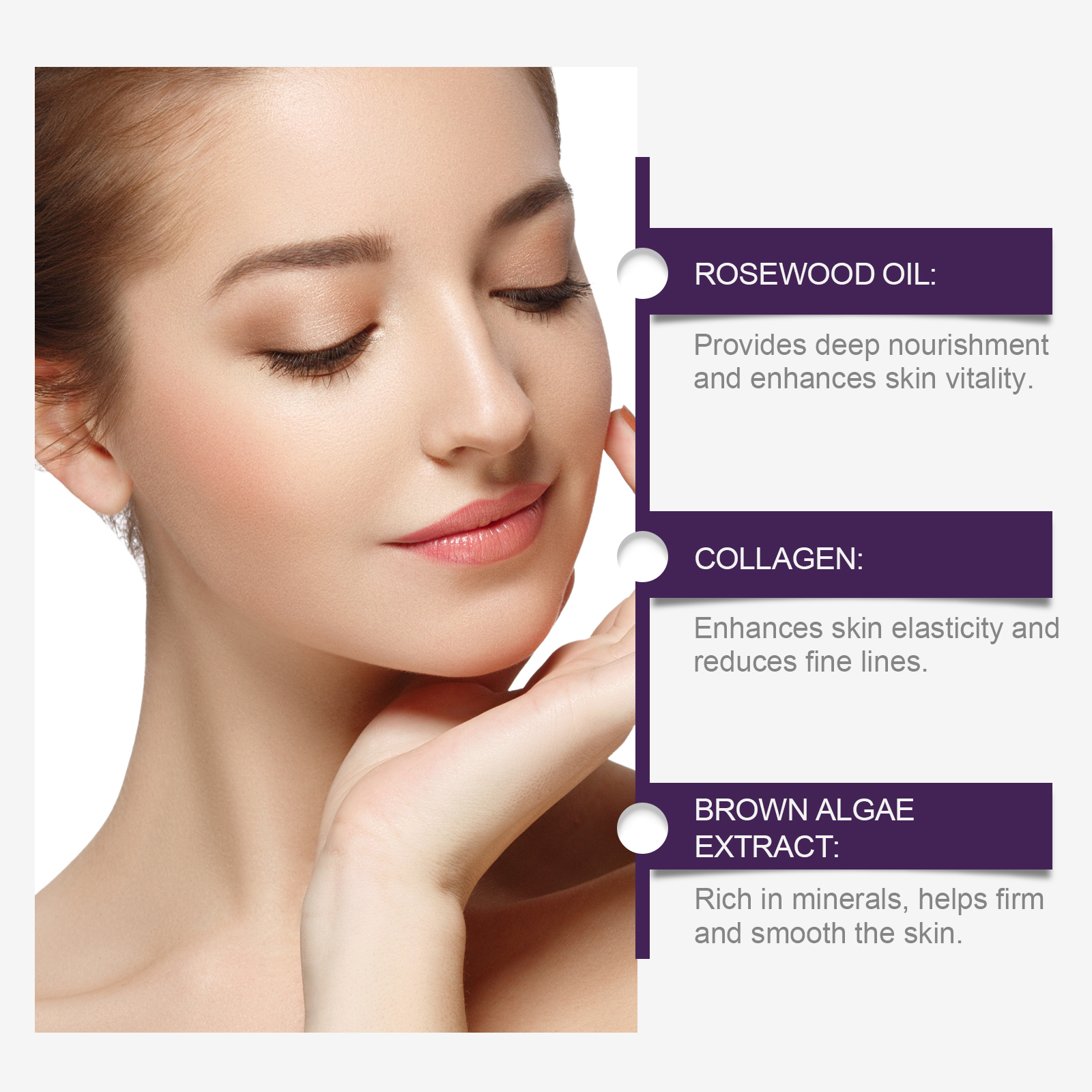 我们的护肤面霜,由甘油、鲸蜡硬脂醇、甘油硬脂酸酯精心调配而成。专为保护皮肤免受外部伤害设计。使用方法极为便捷:清洁面部并拍干。沿下颌线向上按摩。按摩至完全吸收。为了获得最佳效果,请每天早晚使用。并且可以快速提高皮肤紧致度,增强皮肤弹性。玫瑰木油和胶原蛋白深层滋养肌肤。