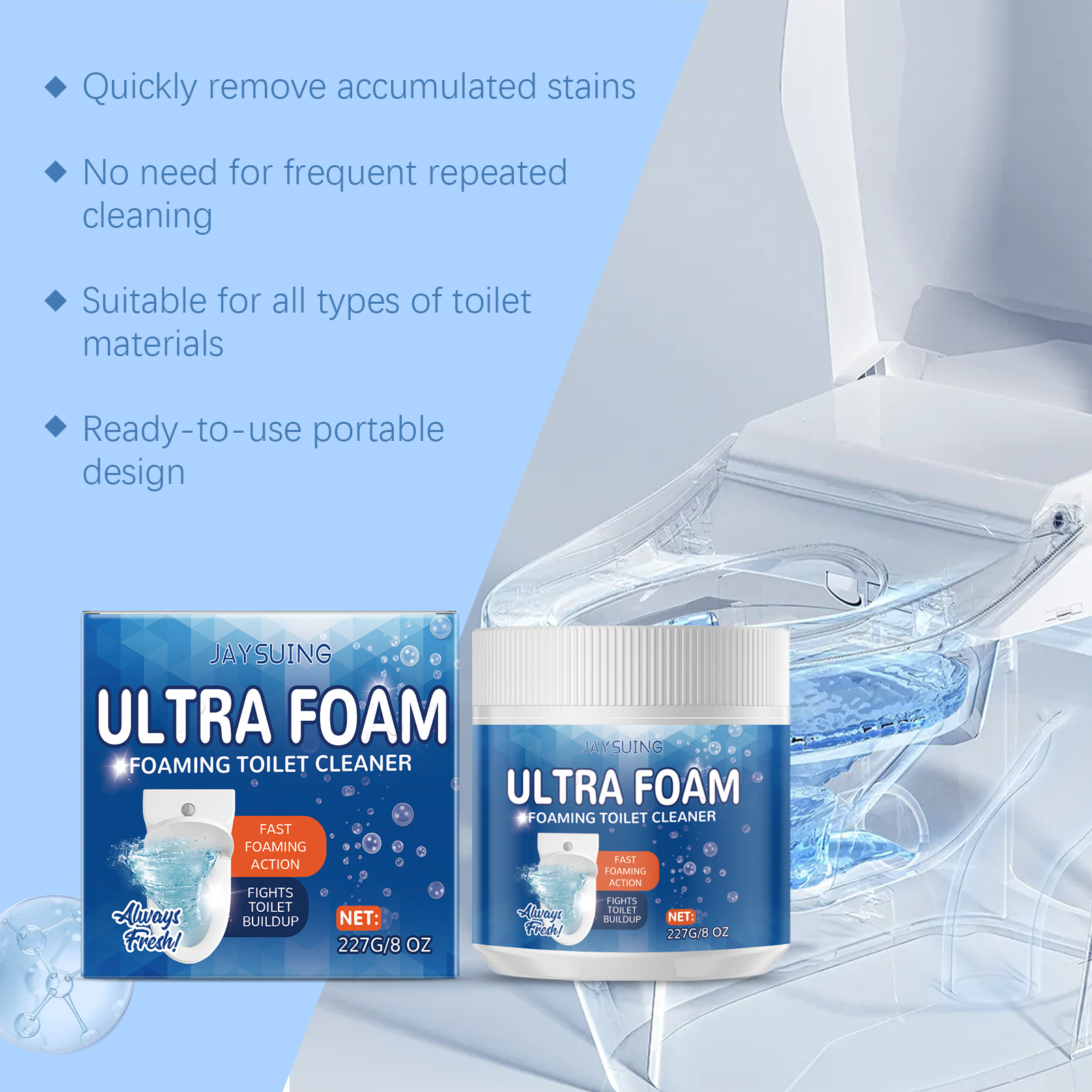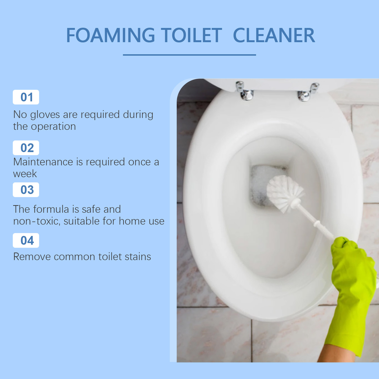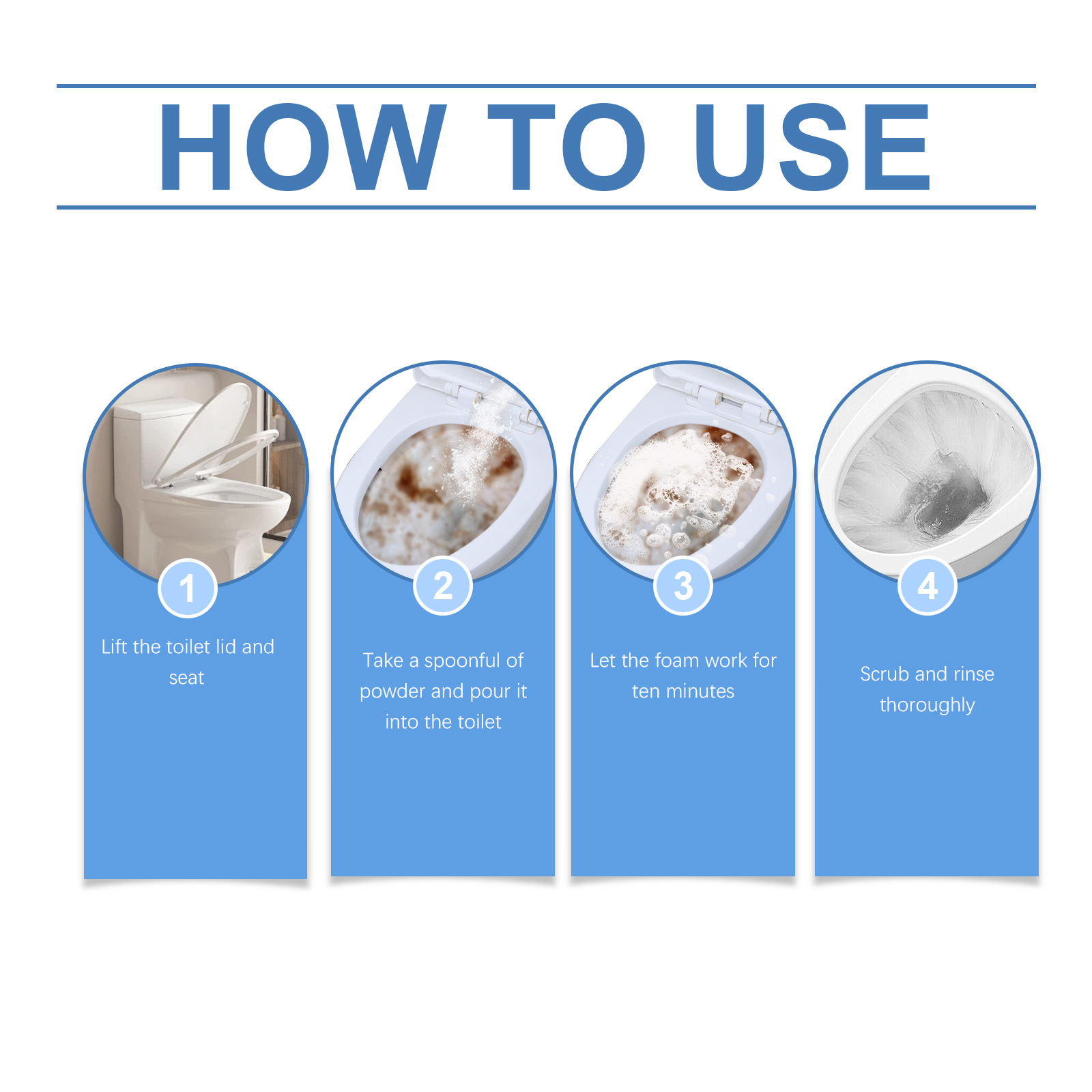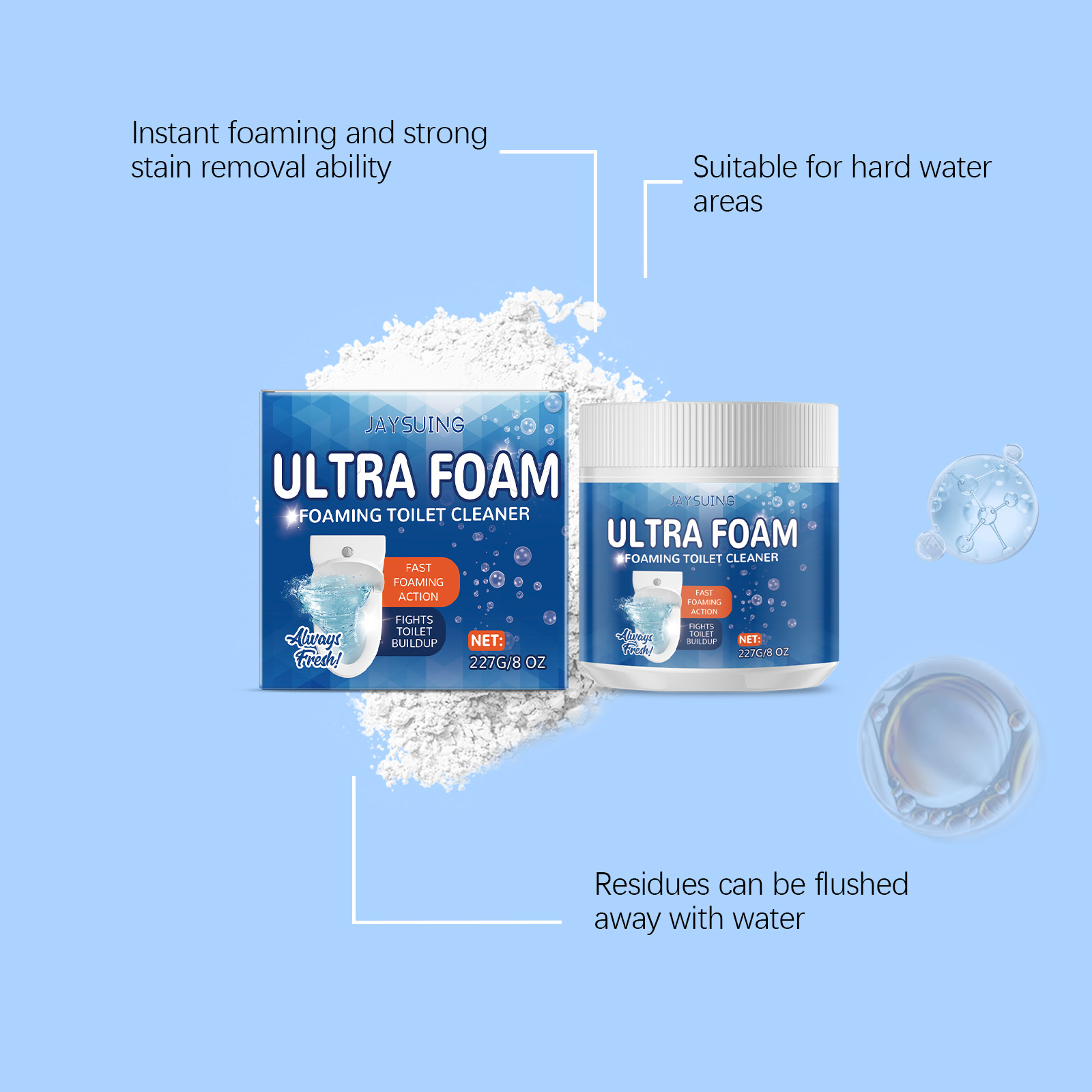 我们的马桶清洁粉,由碳酸氢钠、柠檬酸、十二烷基硫酸钠精心调配而成。专为快速溶解马桶座上的顽固水垢。抑制陶瓷表面新污渍的形成设计。使用方法极为便捷:提起马桶盖和座圈,取一勺粉末倒入马桶,让泡沫作用十分钟彻底擦洗并冲洗。并且浓密的泡沫可以覆盖了马桶里的每一个缝隙且不会损坏釉料和金属配件。