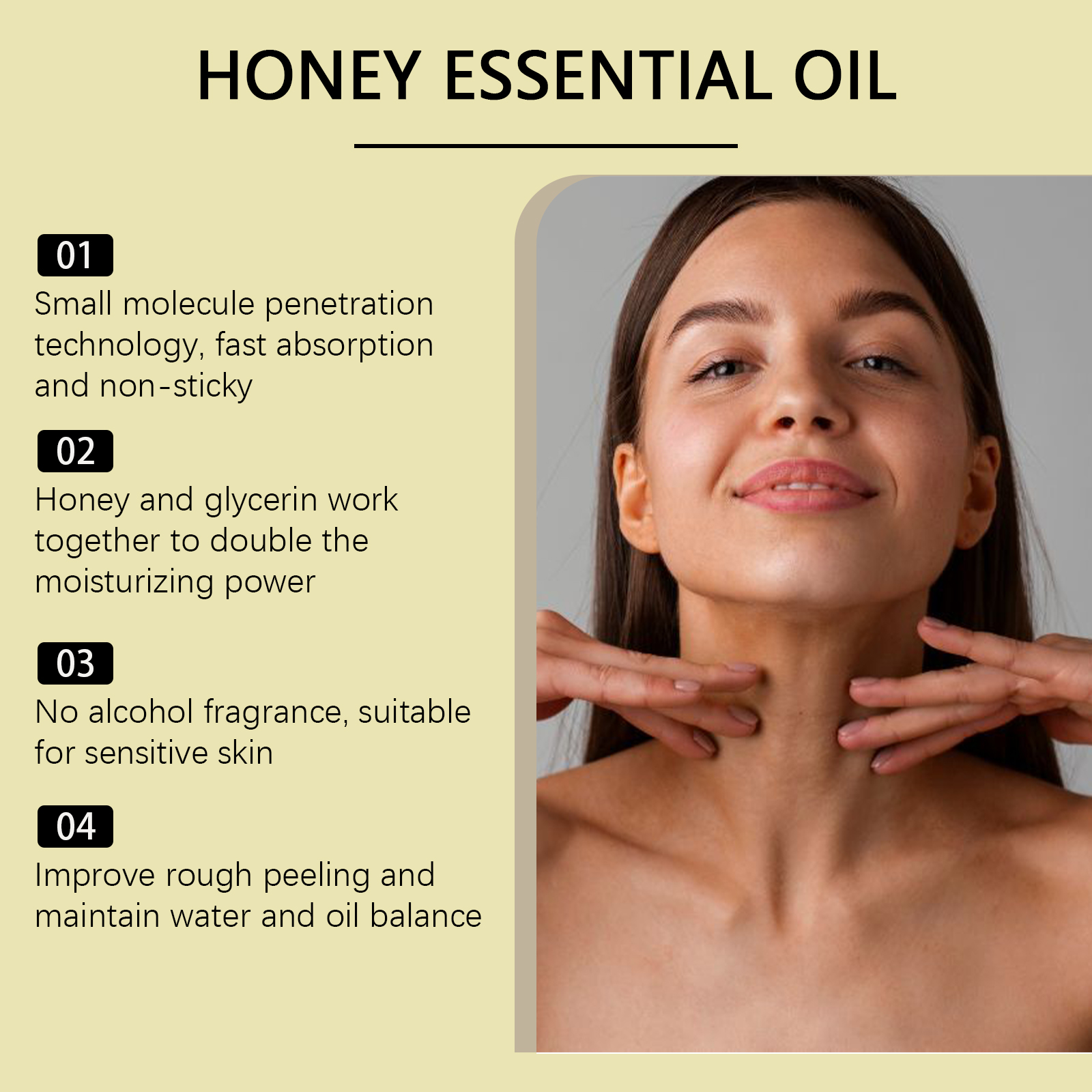 我们的蜂蜜保湿精油,由甘油、丁二醇、氢化蓖麻油精心调配而成。专为渗透入皮肤,补充水分,缓解干燥和紧绷设计。使用方法极为便捷:沐浴后涂抹适量于全身,轻轻按摩直至完全吸收,每天早晚使用一次涂抹于干燥部位,如肘部和膝盖。并且它具有油性质地光滑易涂抹,不粘稠,可以模拟皮脂膜结构,增强皮肤韧性。