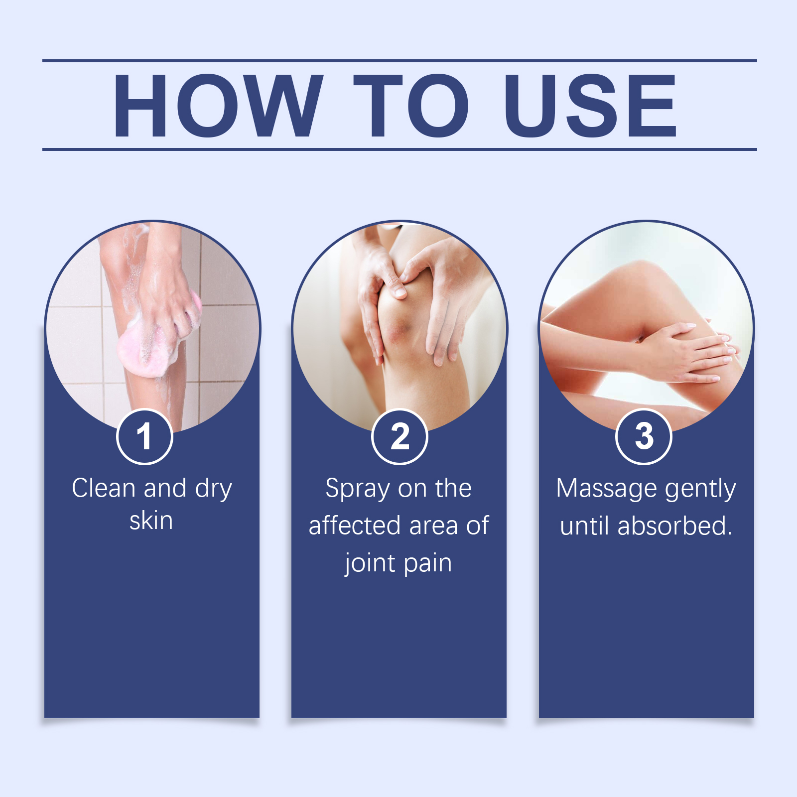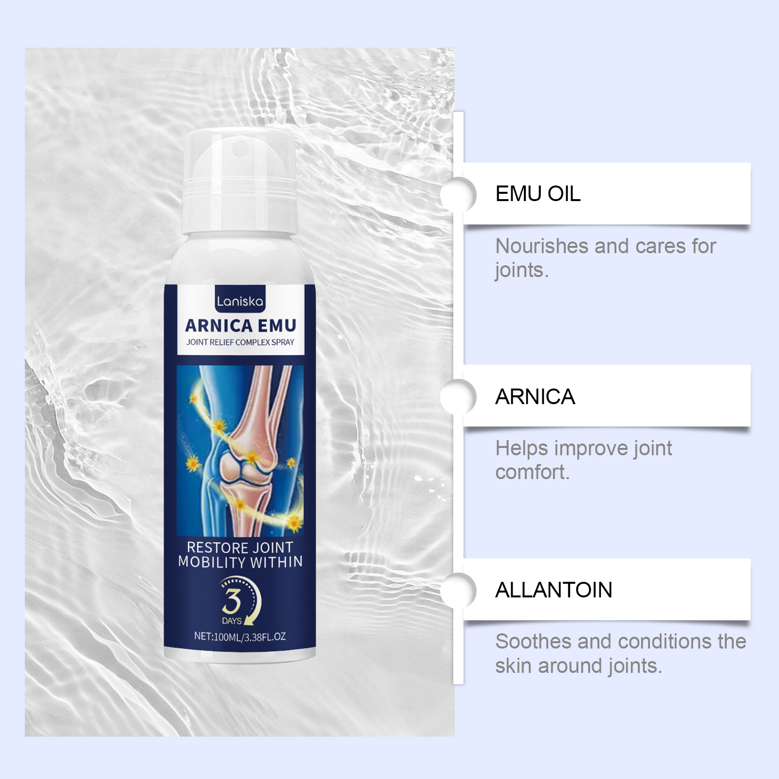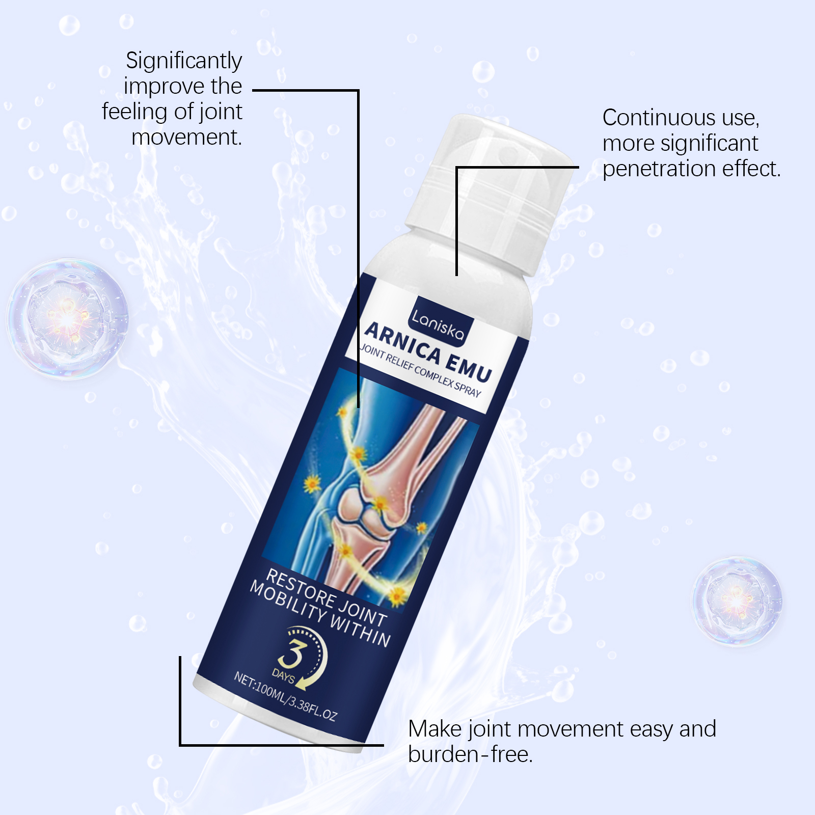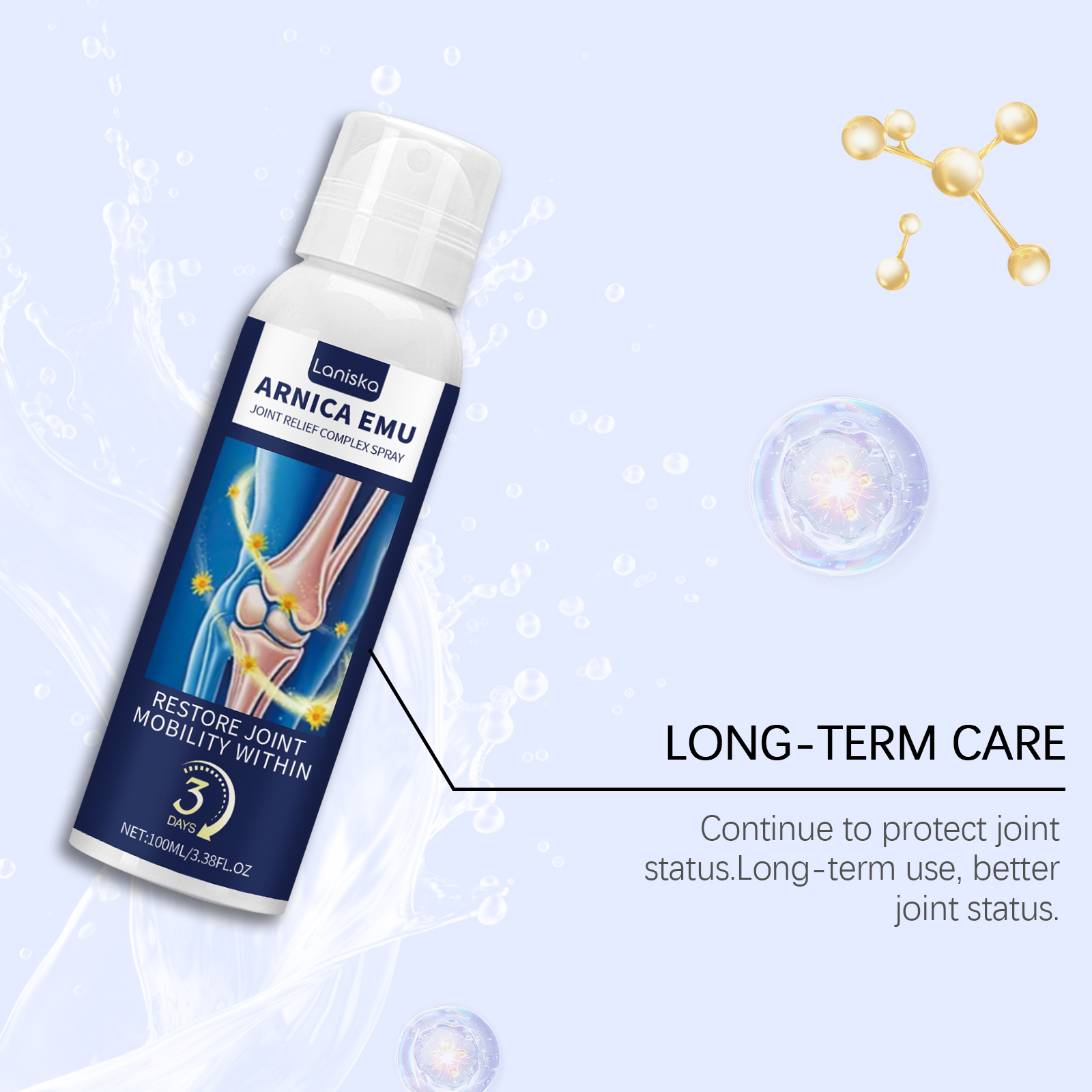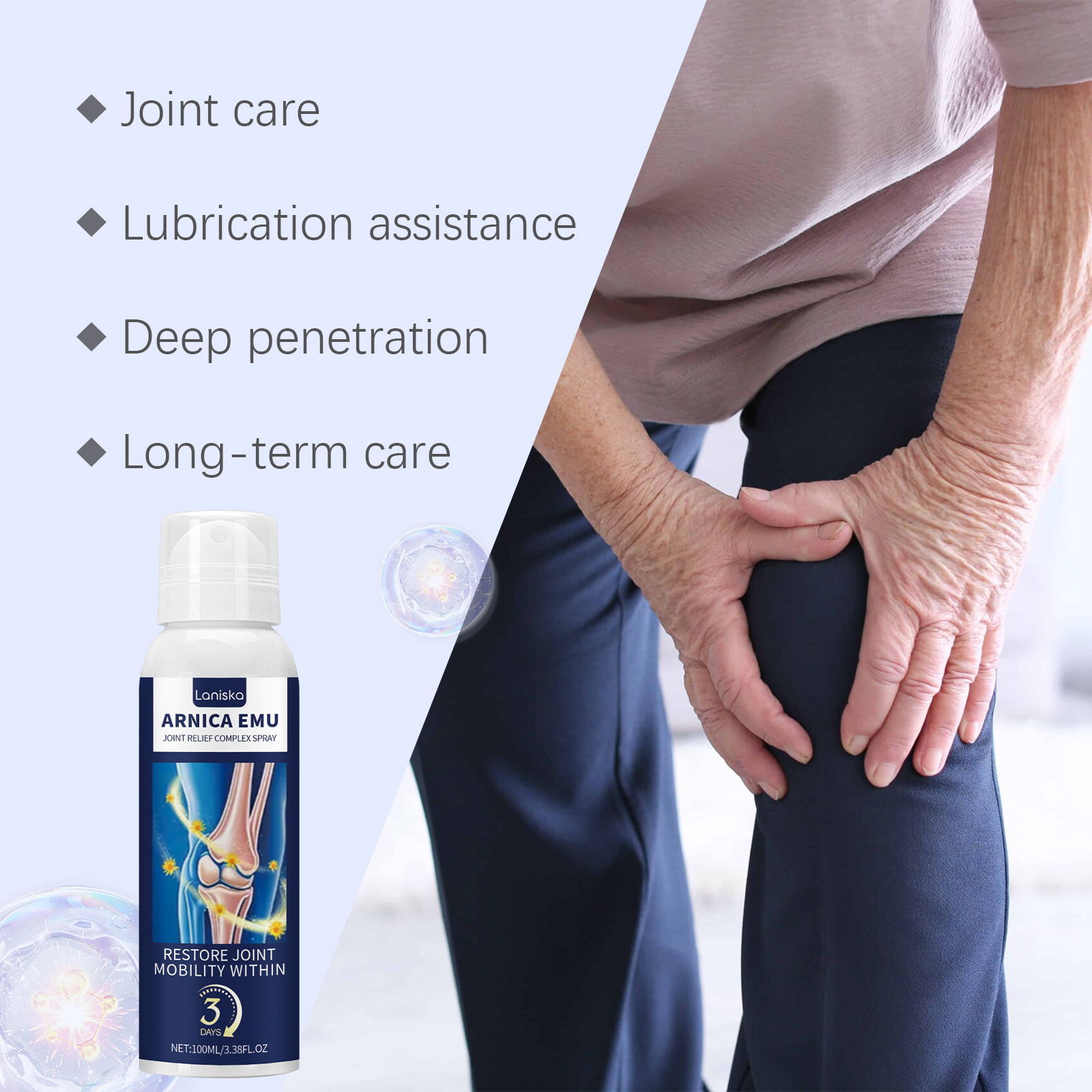 我们的关节舒缓喷雾,由鸸鹋油、山金车花精心调配而成。专为护卫关节健康,增强关节的保健功能,适用于各种关节不适设计。使用方法极为便捷:清洁和干燥的皮肤,喷洒在关节疼痛的患处,轻轻按摩至吸收。并且可以为关节提供亲密的护理,使关节更自由地运动。