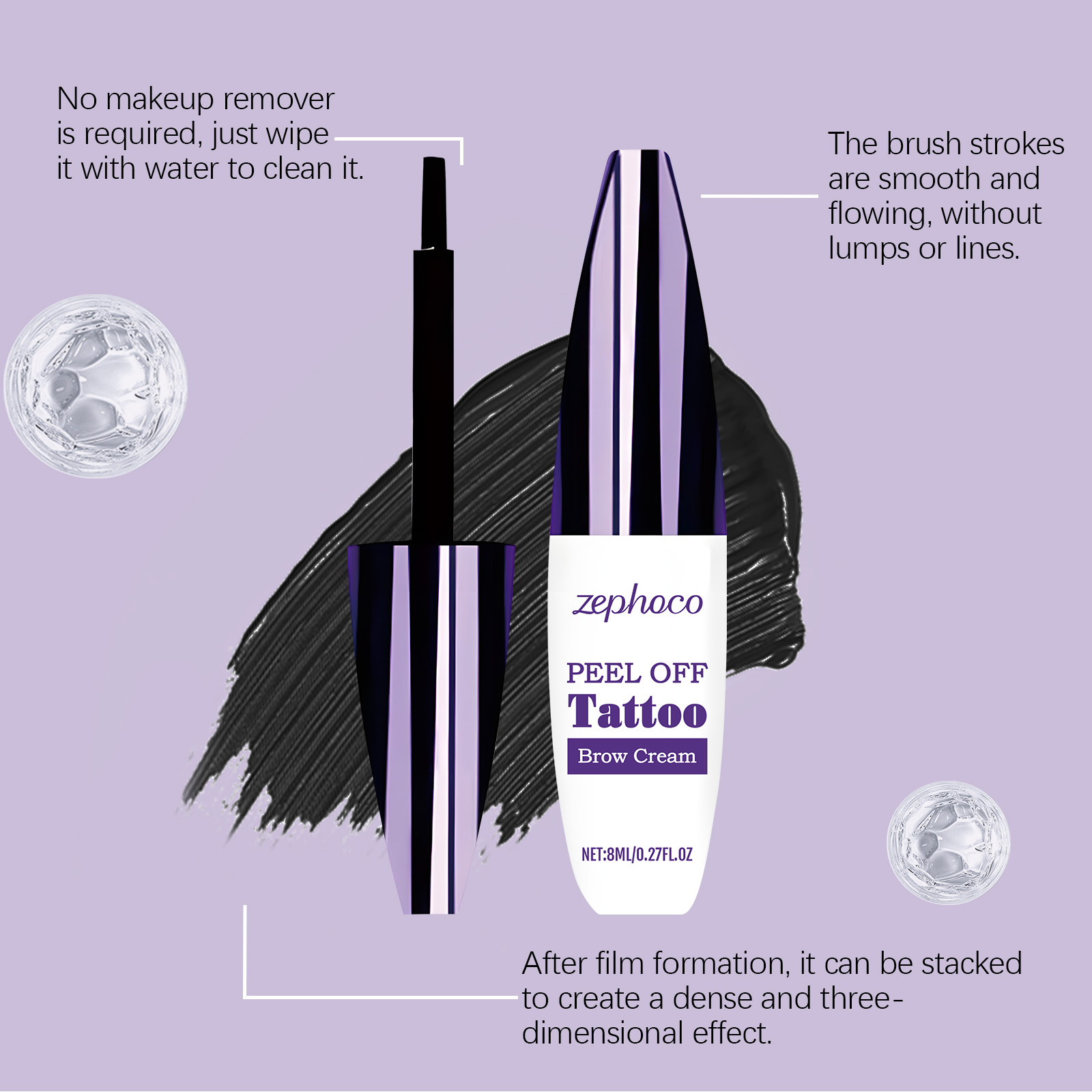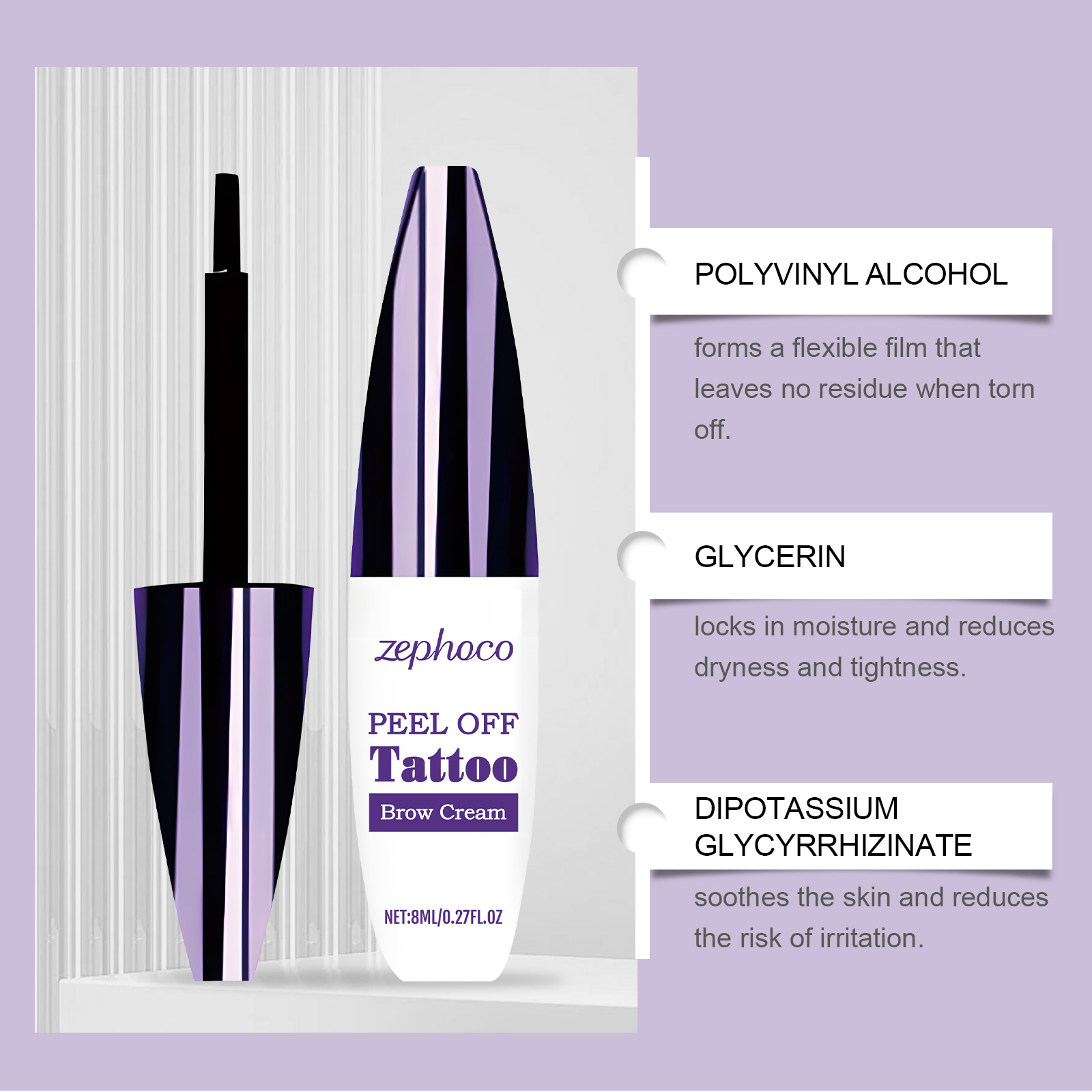 我们的可撕拉液体眉笔,由聚乙烯醇、甘油、羟乙基脲精心调配而成。专为妆效持久,不会褪色或弄脏设计。使用方法极为便捷:均匀涂抹在眉毛区域。等待3-5分钟,让膜自然形成。从眉毛的末端移除到眉毛的开始。重复涂抹可以叠加颜色。并且它超细的笔触勾勒出毛发的流动,膜形成后无粘性和沉重感。