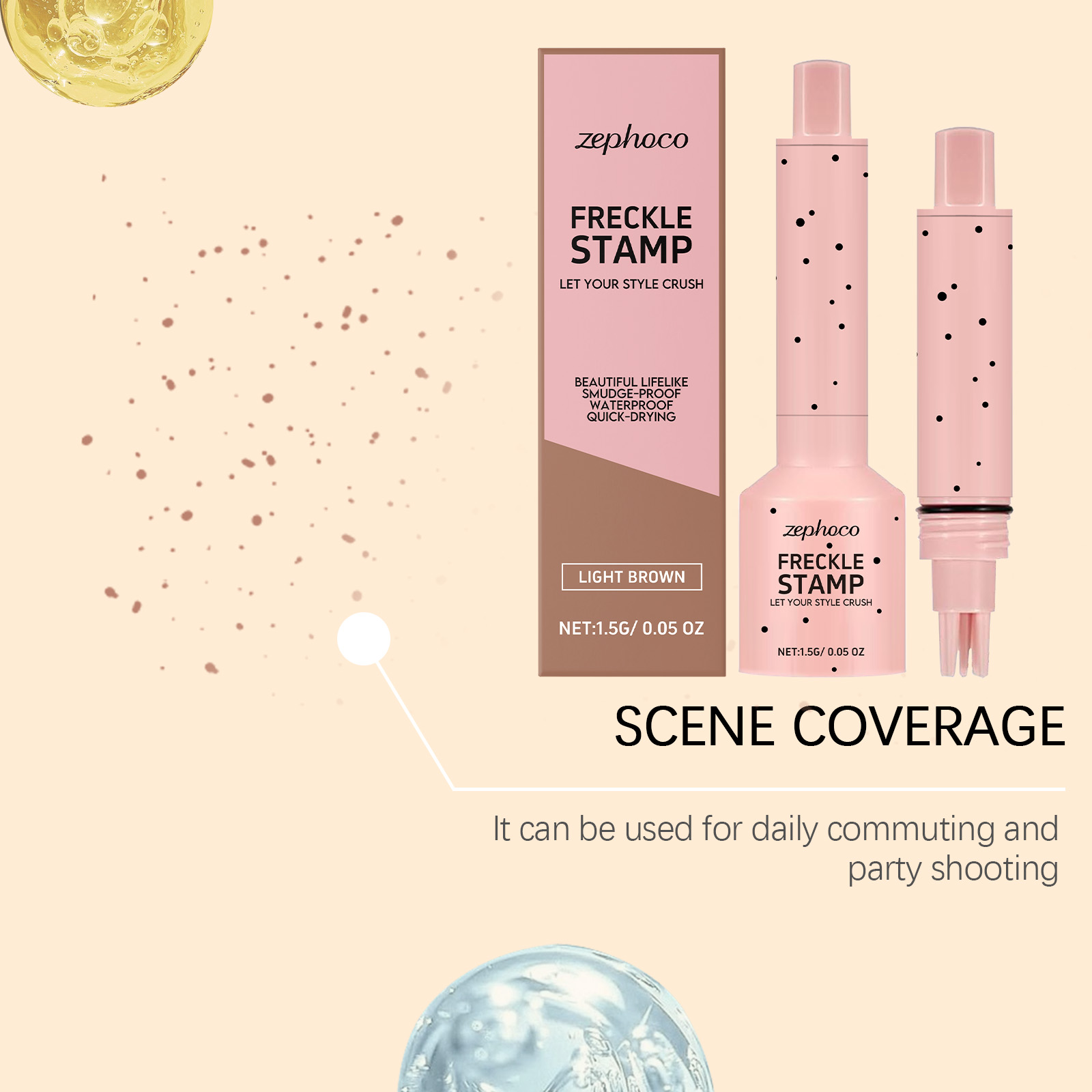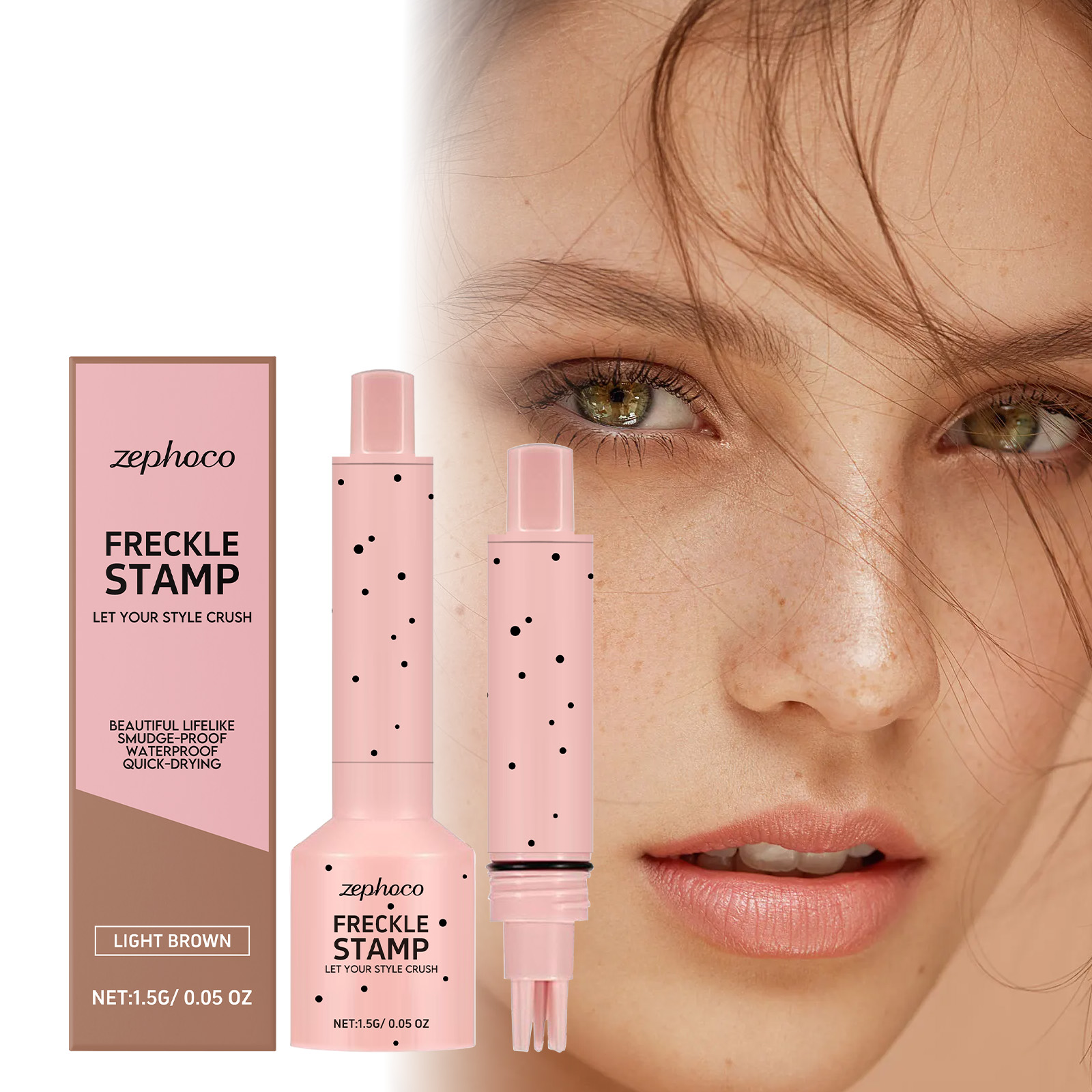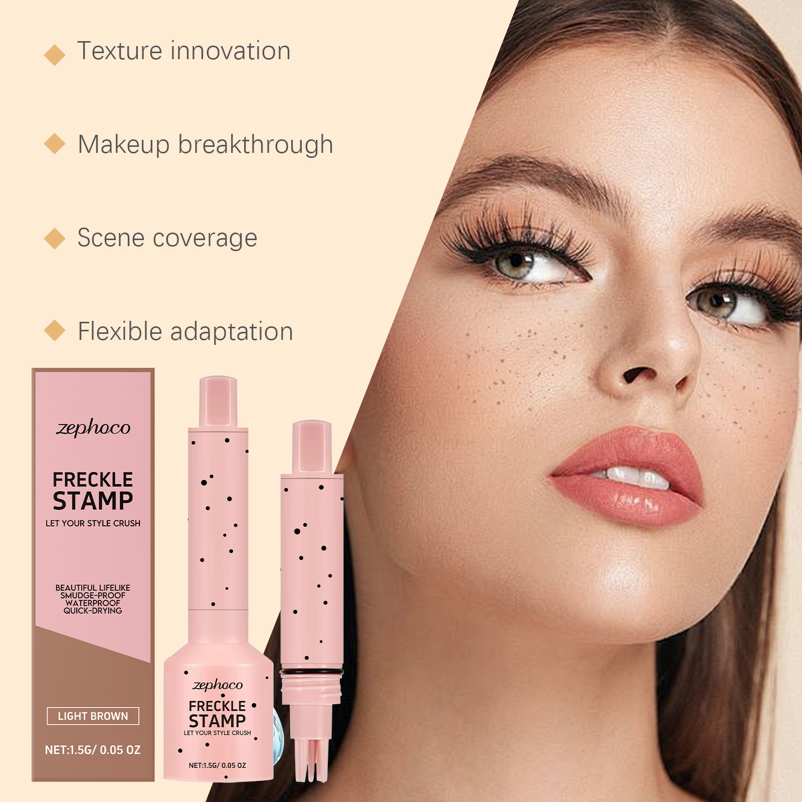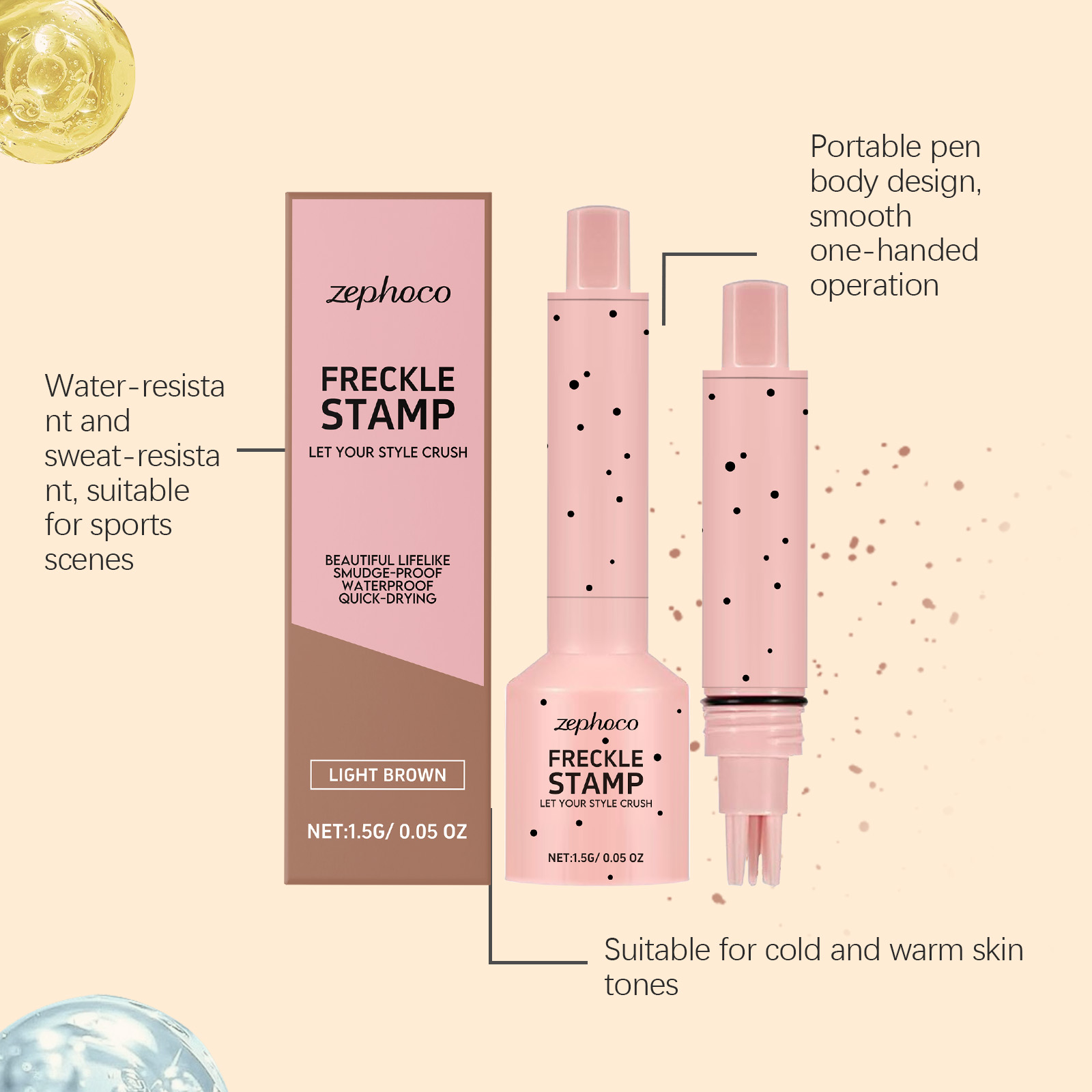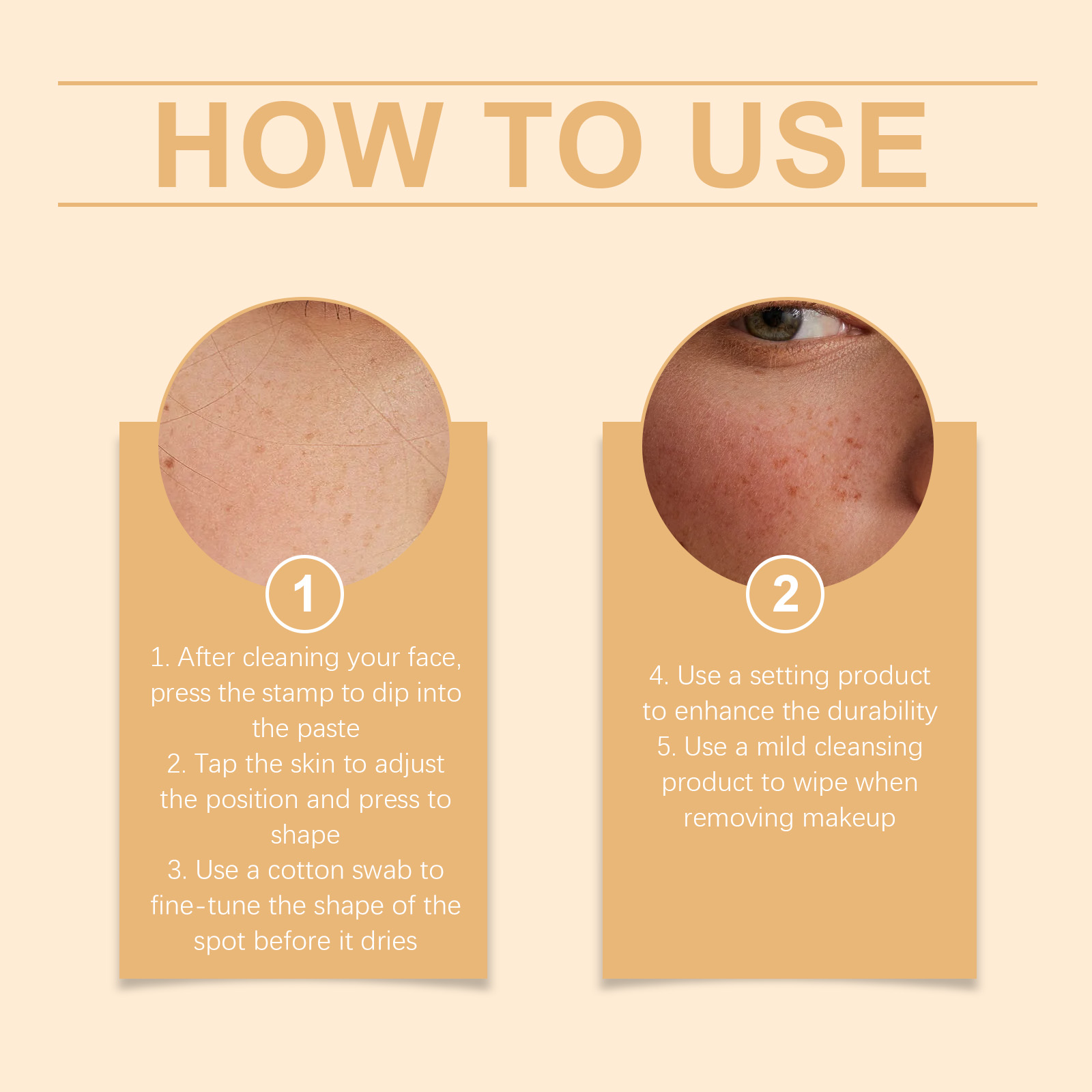 我们的浅棕色面部仿雀斑印章笔,由丁二醇、丙二醇、甘油精心调配而成。专为快速干燥且不粘,打印后立即凝固设计。使用方法极为便捷:1.清洁面部后,按下印章浸入膏体中。2.轻拍皮肤以调整位置并按下以塑形。3.在污渍变干之前用棉签微调污渍的形状。4.使用定妆产品增强持久性。5.使用温和的清洁产品擦拭卸妆。并且它具有轻盈快速干透的配方,不会堵塞毛孔。哑光质感,拒绝塑料假感。