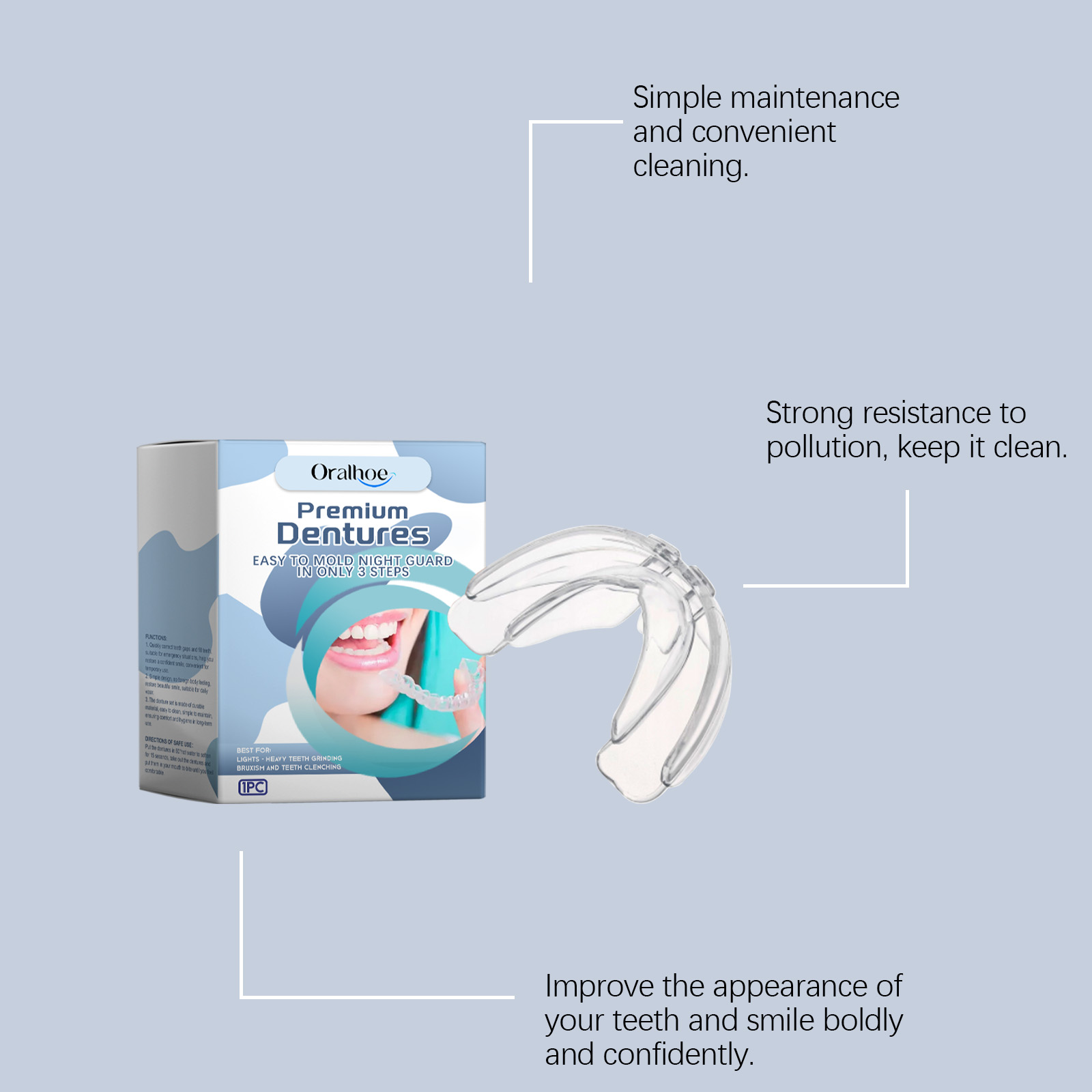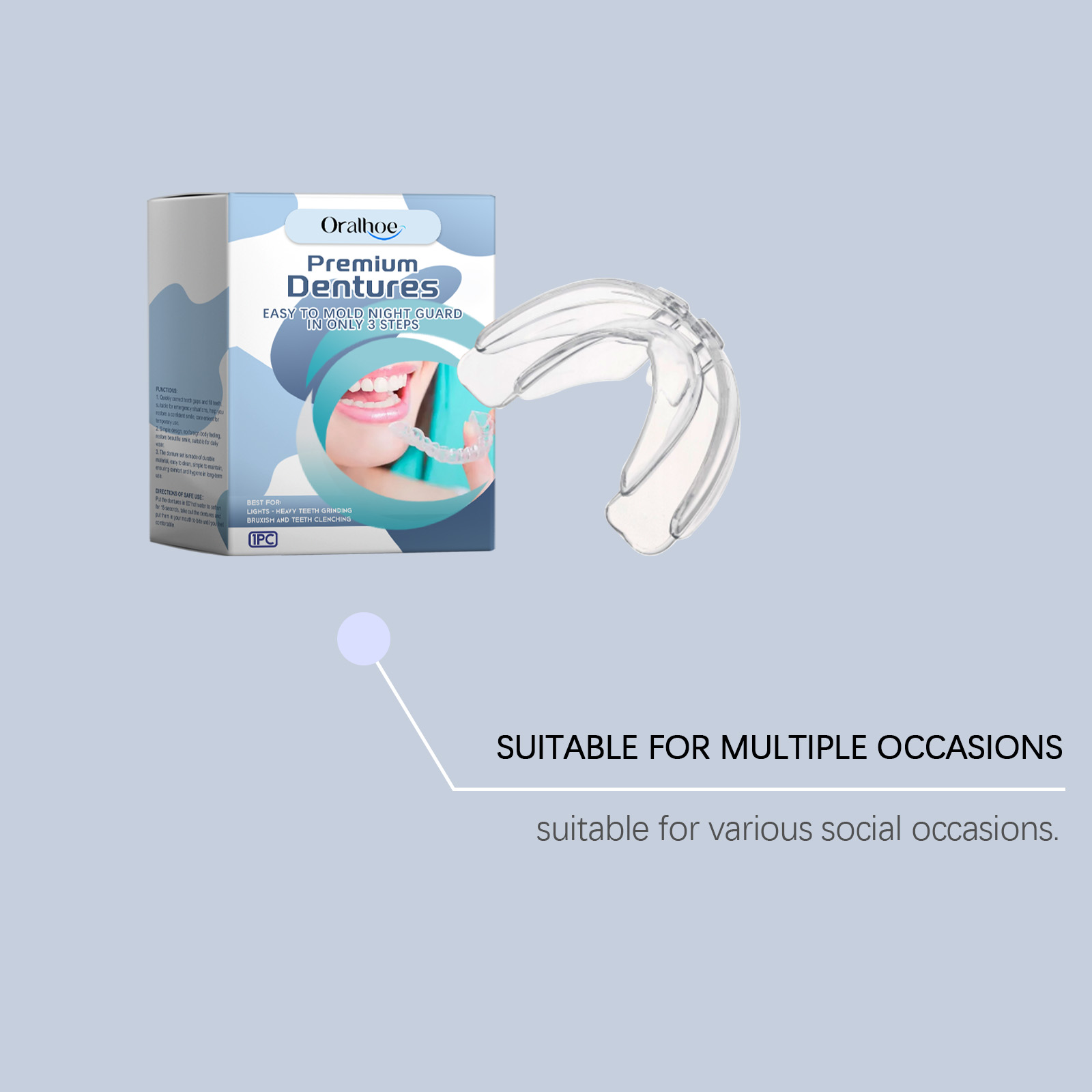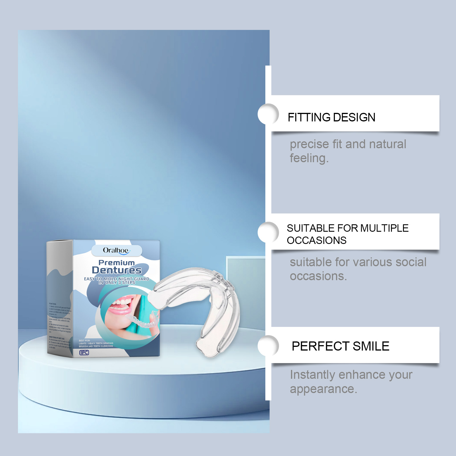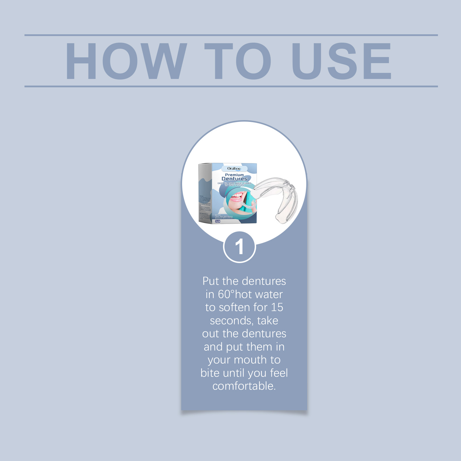 我们的隐形牙套,由硅胶精心调配而成。专为精确的贴合和自然的感觉设计。使用方法极为便捷:将假牙放入60°的热水中软化15秒,取出假牙并放入口中咬合,直到感到舒适即可。并且它可以瞬间提升你的外表,易于使用,立竿见影。