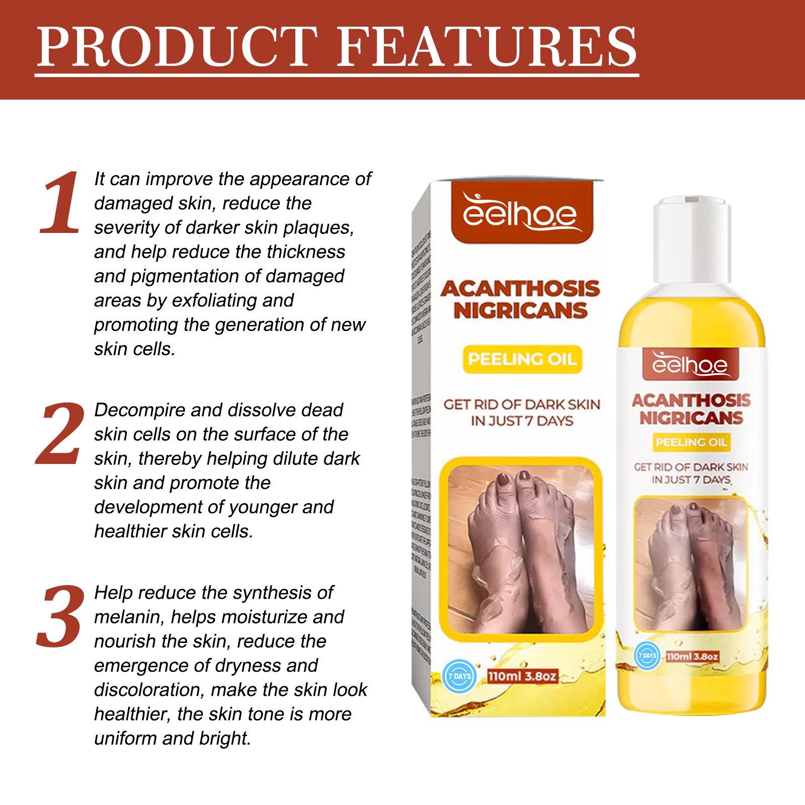 我们的黑棘皮去角质油含有甘草根提取物、积雪草提取物、维生素A。它可以改善受损皮肤,减轻较深皮肤斑块的严重程度,并通过去角质和促进新皮肤细胞的生成,帮助减少受损区域的厚度和色素沉着。它的使用方法很简单:首先清洗并干燥黑刺五加的皮肤,之后取适量本品均匀涂抹在皮肤上,30-60分钟后,角质皮肤自然脱落,清洗干净即可。使用后有助于分解和溶解皮肤表面的死皮细胞,从而帮助淡化暗沉的皮肤,促进年轻健康的皮肤细胞的发育。
