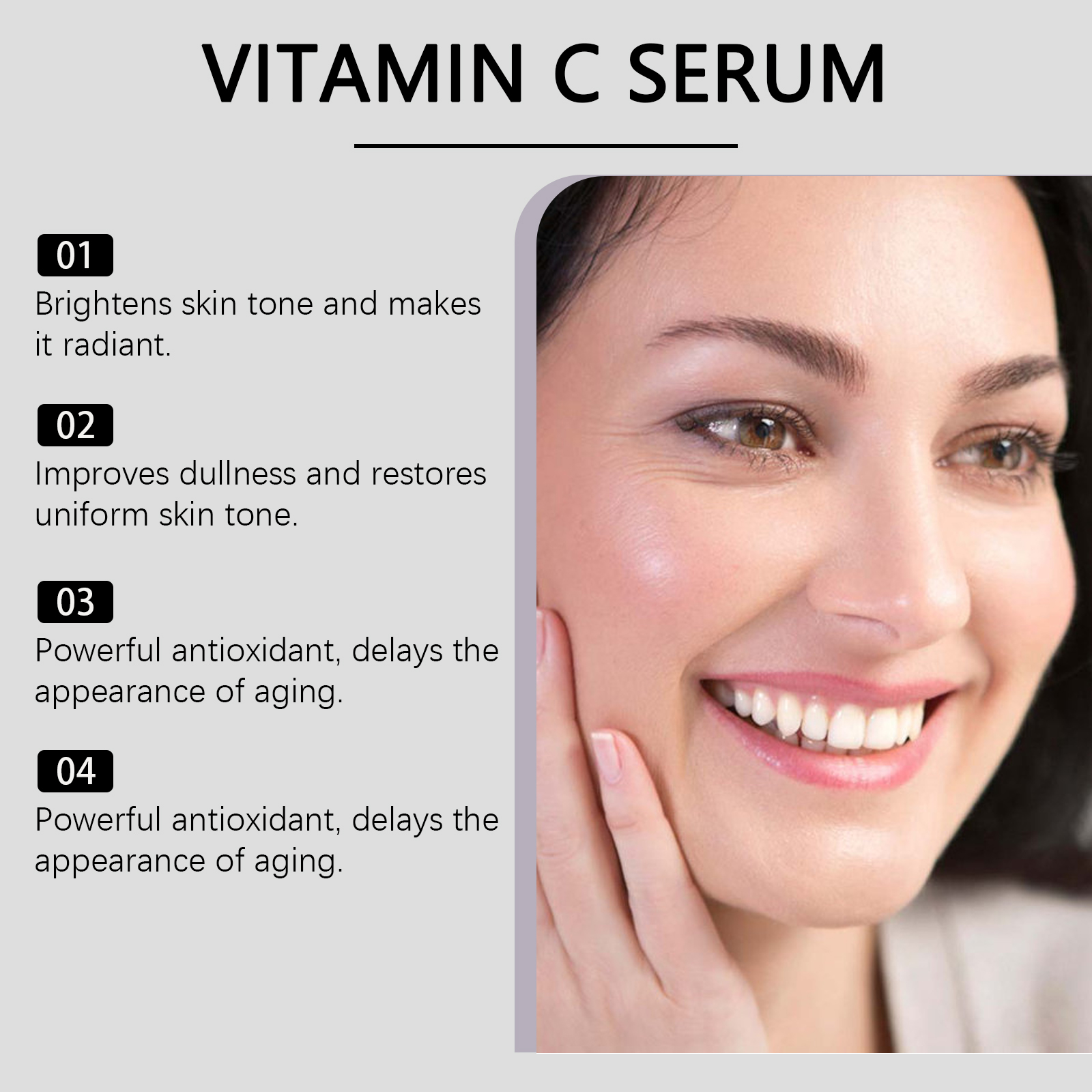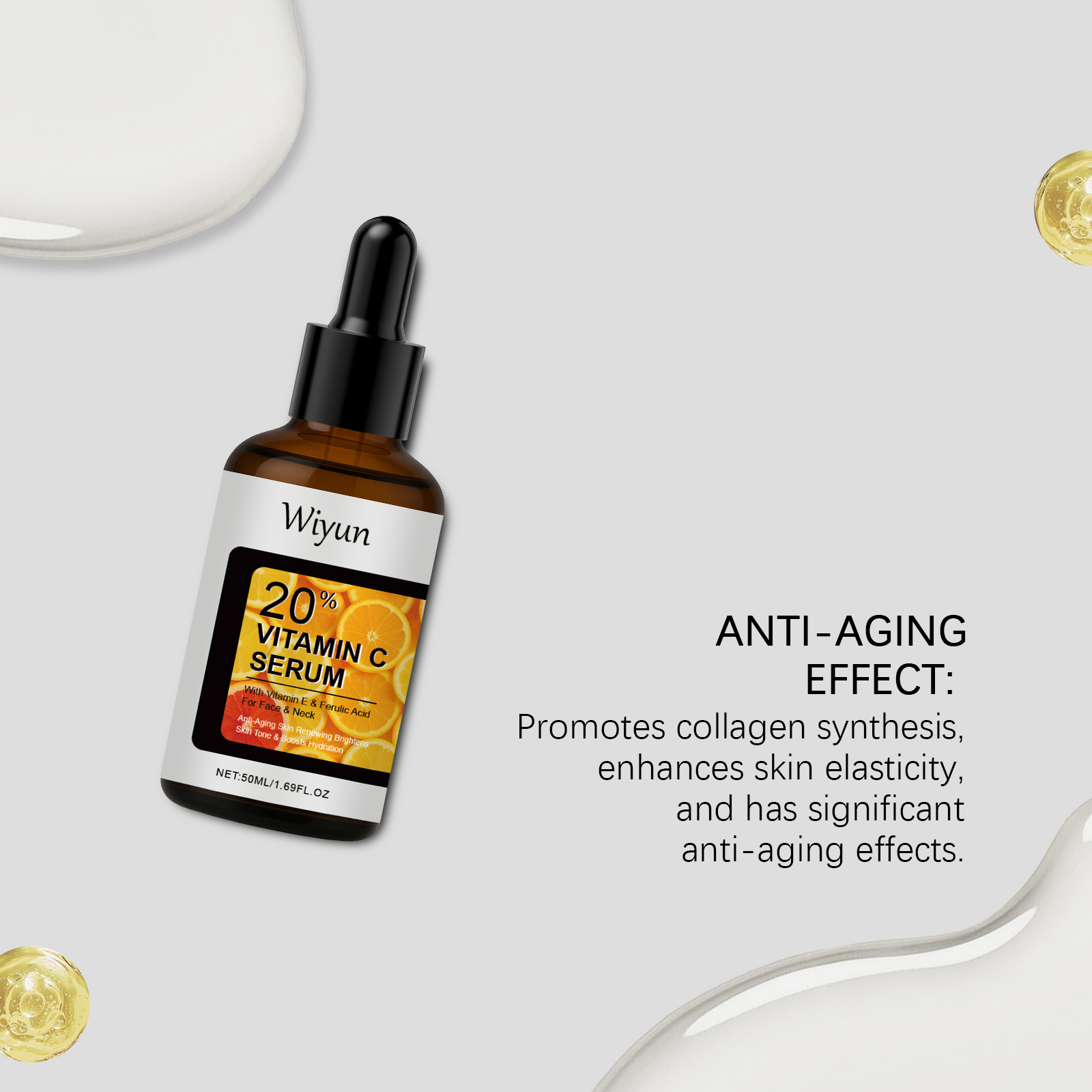 我们的维生素C面部精华液,由甘油、羟乙基纤维素精心调配而成。专为有效改善暗沉,均匀肤色,创造自然明亮的肌肤,淡化斑点,减少皮肤瑕疵,恢复清晰透明的光泽设计。使用方法极为便捷:彻底清洁皮肤并使其干燥,取适量本品均匀涂抹于面部和颈部皮肤区域。轻轻按摩以促进完全吸收。并且它富含抗氧化成分,可以修复皮肤,保护皮肤免受外部伤害。