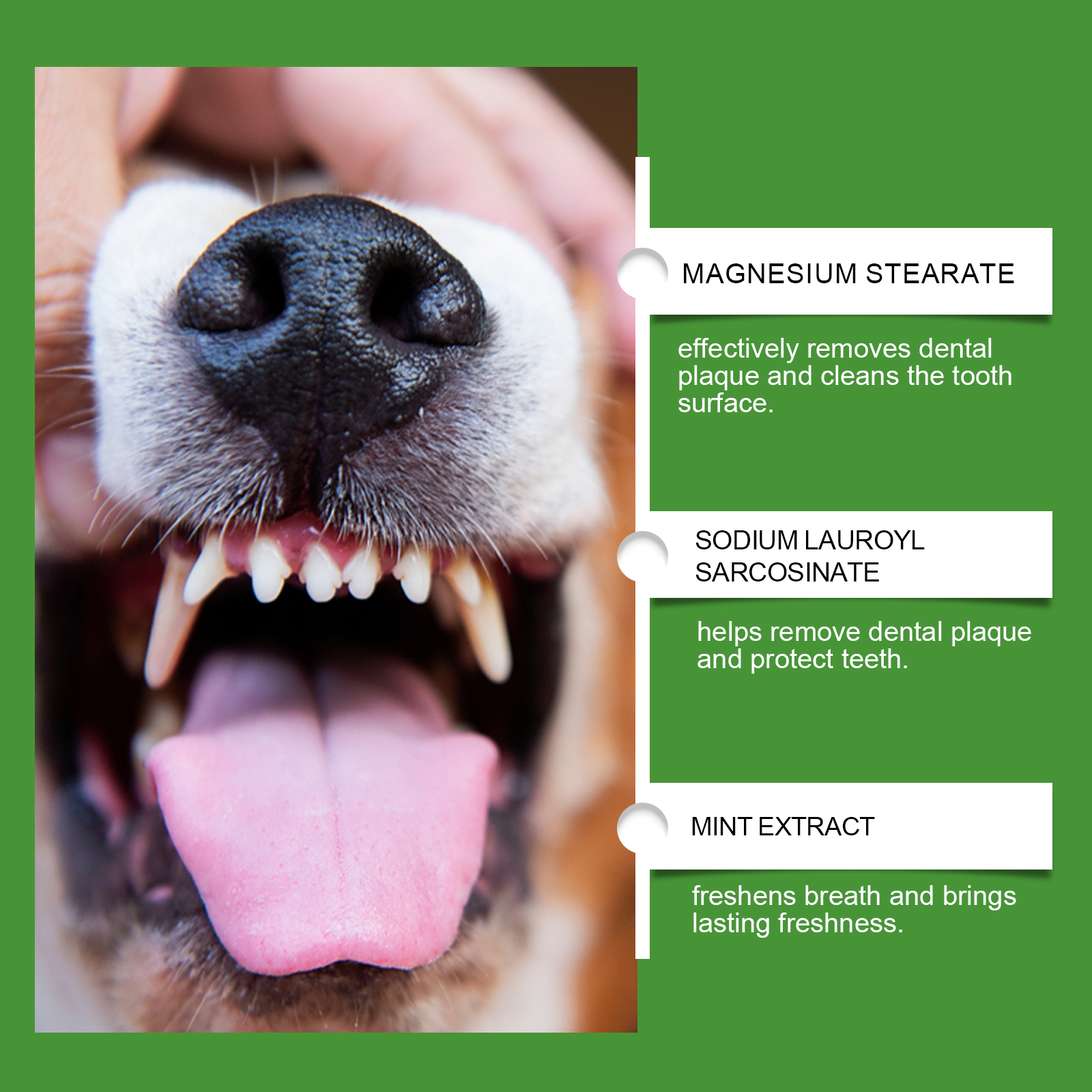 我们的狗牙齿清洁粉,由碳酸氢钠、玉米淀粉、山梨(糖)醇精心调配而成。专为有助于维护宠物的牙齿和牙龈健康。消除口臭,保持宠物呼吸清新设计。使用方法极为便捷:用勺子舀出适量的牙膏到牙刷上,使用蘸有牙膏的牙刷轻轻刷洗宠物的牙齿2-3分钟,用清水冲洗宠物的口腔,以去除残留的牙膏。并且可以有助于促进宠物牙齿和牙龈健康,减少牙垢积累,帮助消除口臭,保持口气清新。