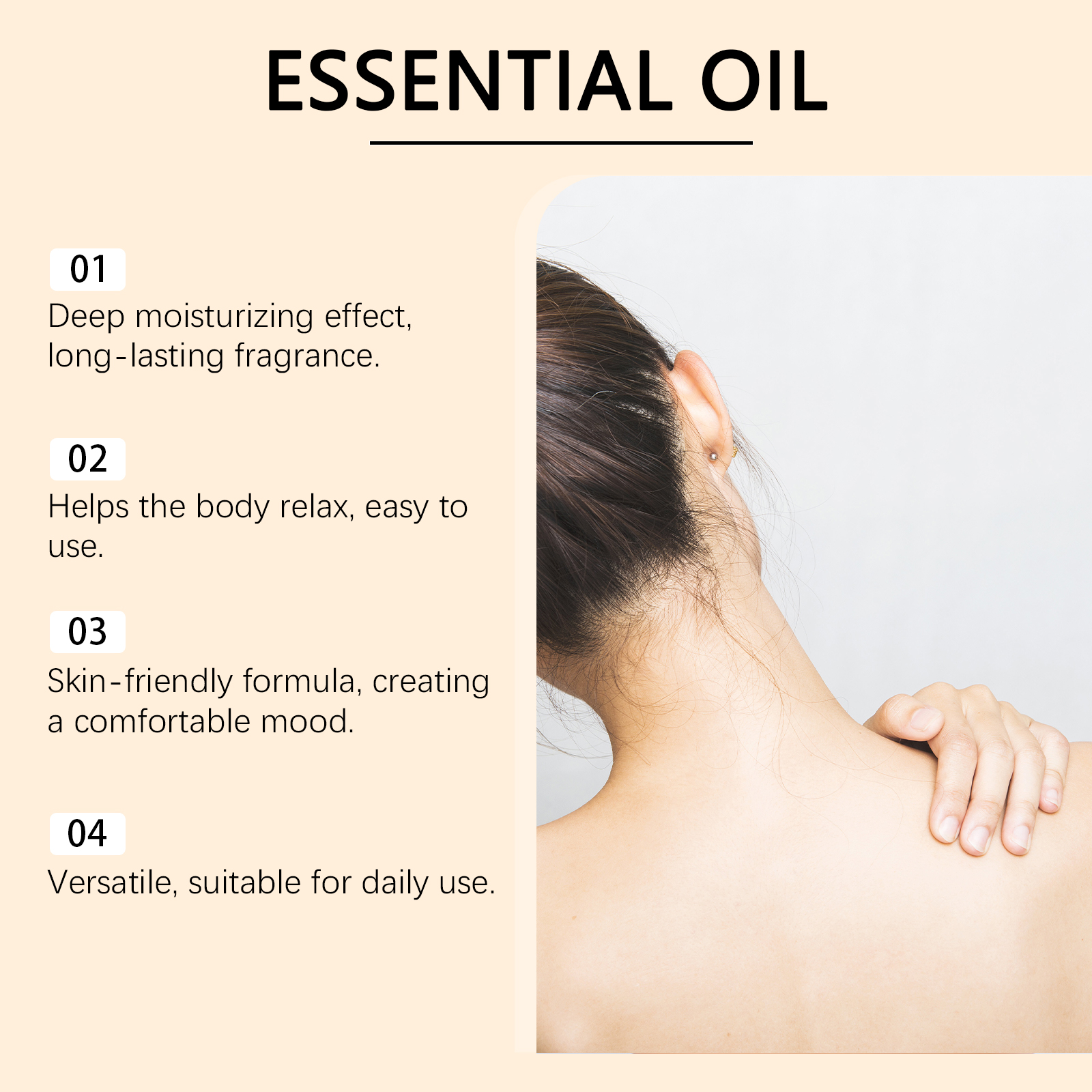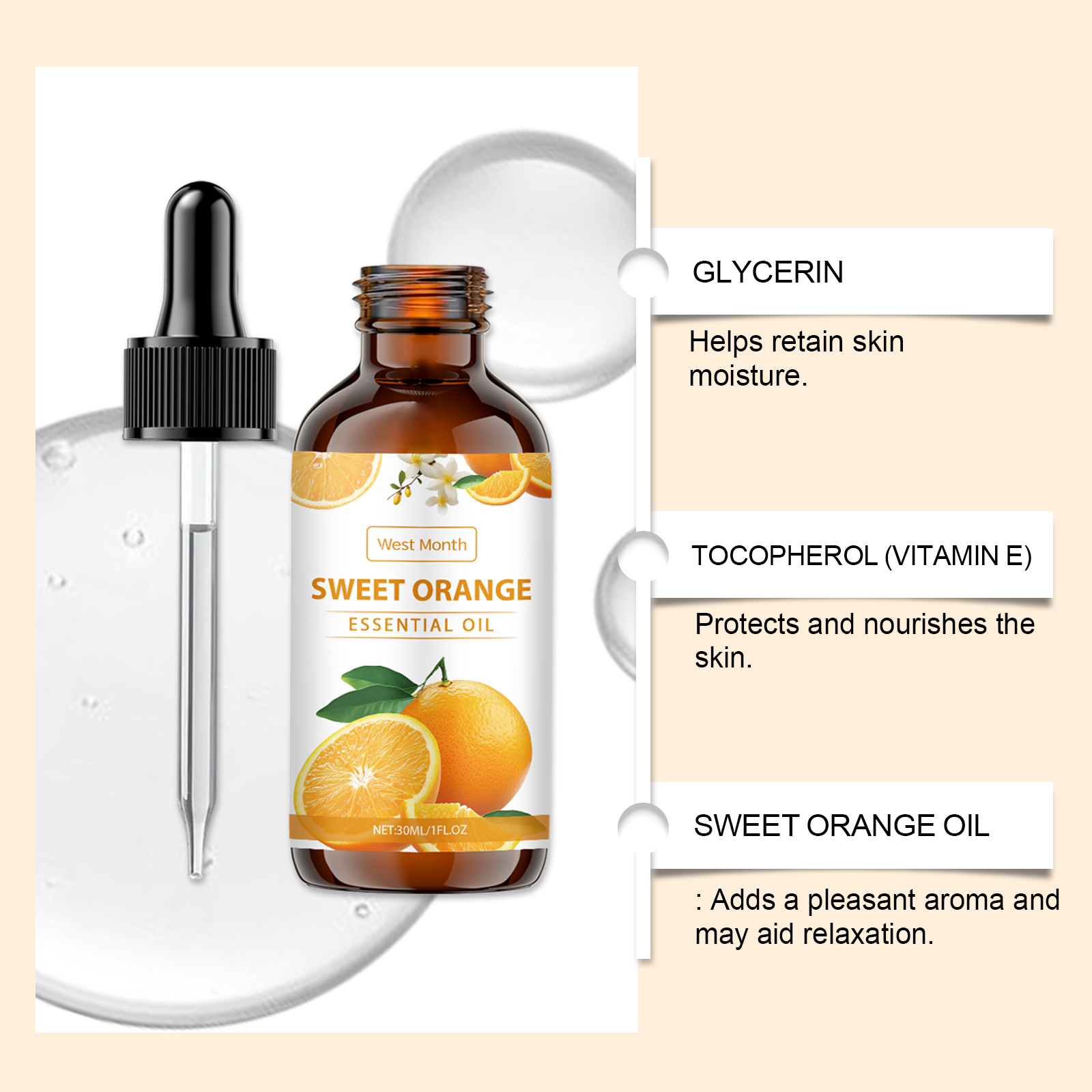我们的香橙舒缓护理精油,由甘油、丁二醇、氢化蓖麻油精心调配而成。专为深层滋润肌肤,保持持久柔软,提供非油腻和舒适的使用体验设计。使用方法极为便捷:1.用于皮肤时:清洁皮肤并保持干燥,取适量本品均匀涂抹于皮肤上,轻轻按摩至吸收。2.用于扩散器:在香氛扩散器中添加适量的该产品以散发香味。并且可以有效缓解压力和紧张,散发出怡人的香气,提升氛围。