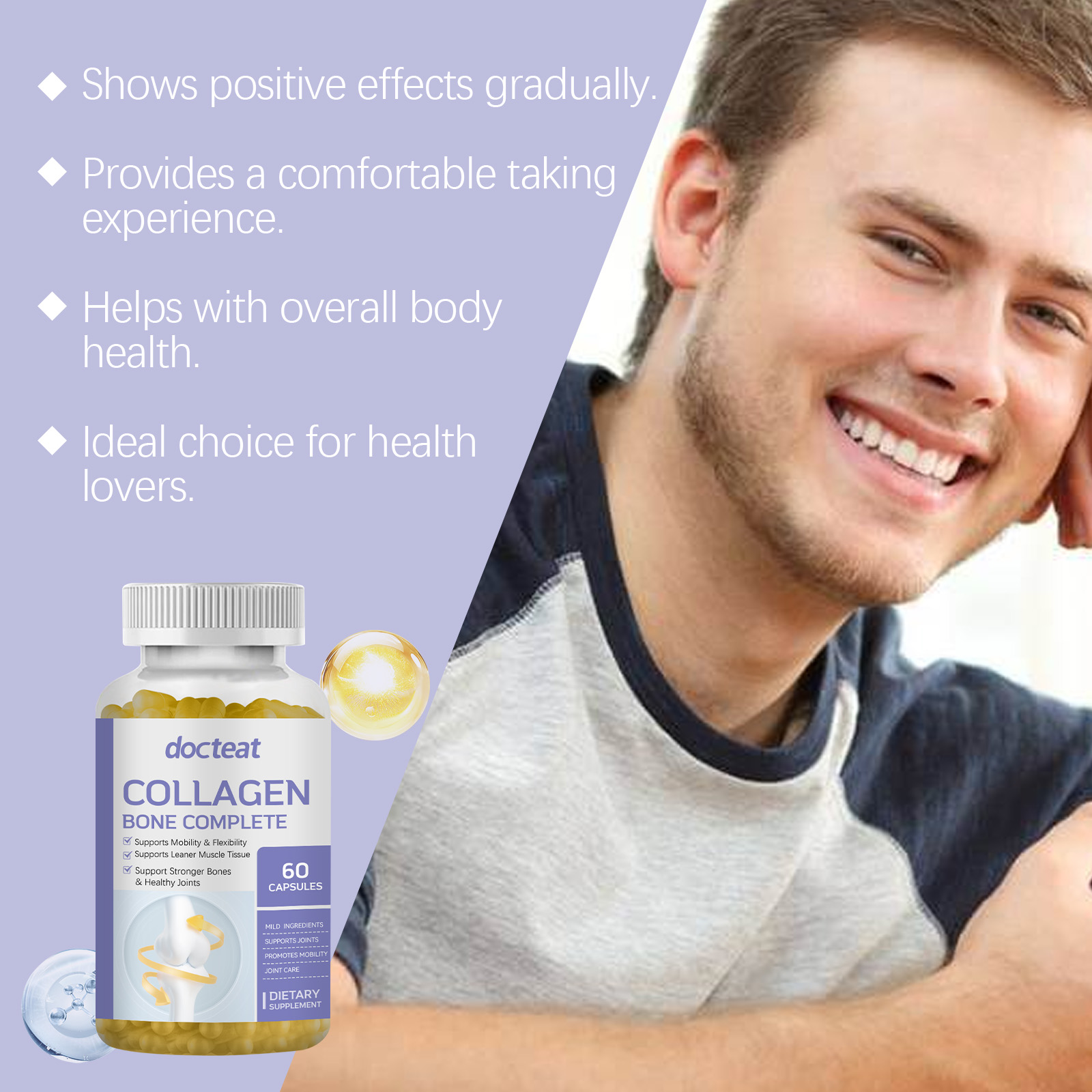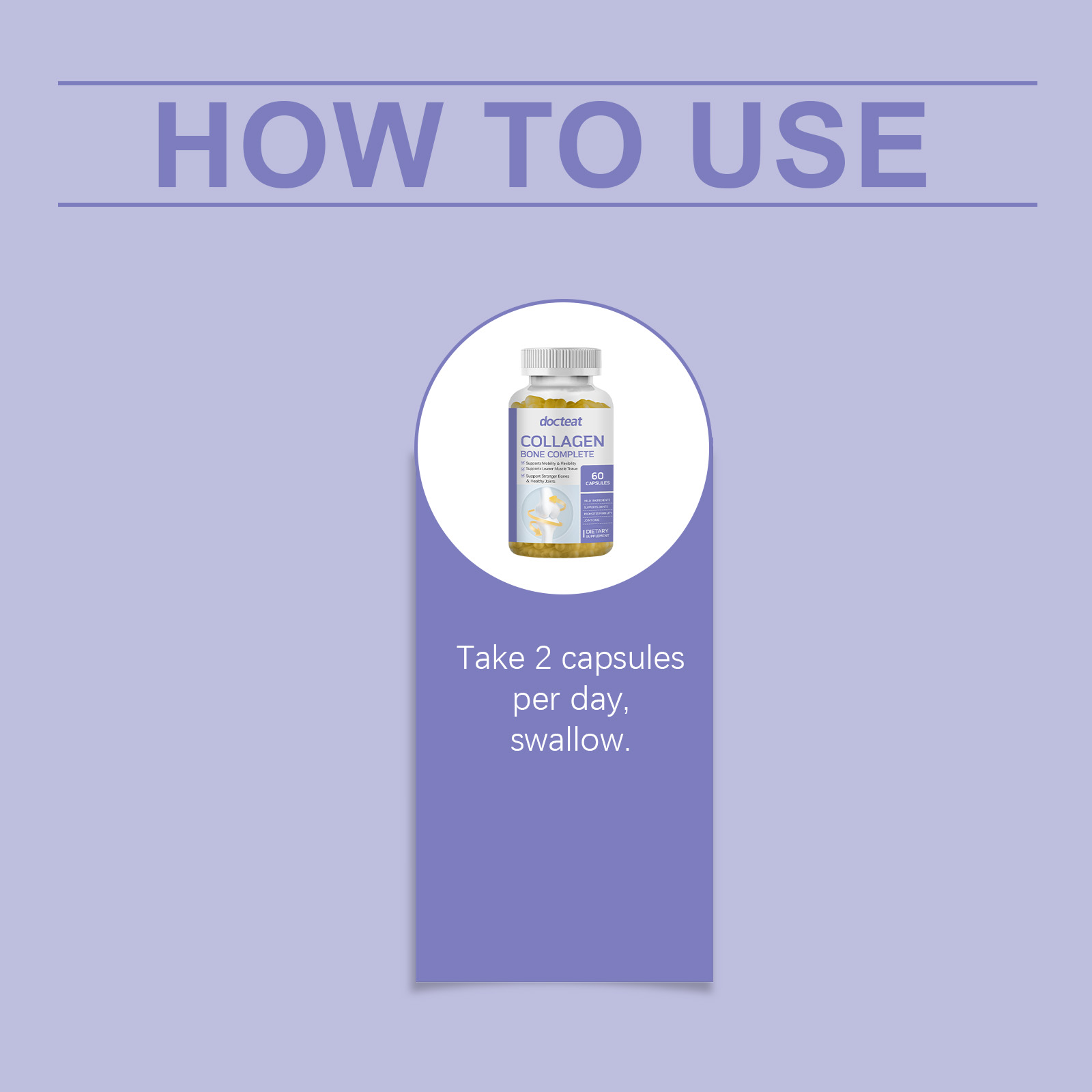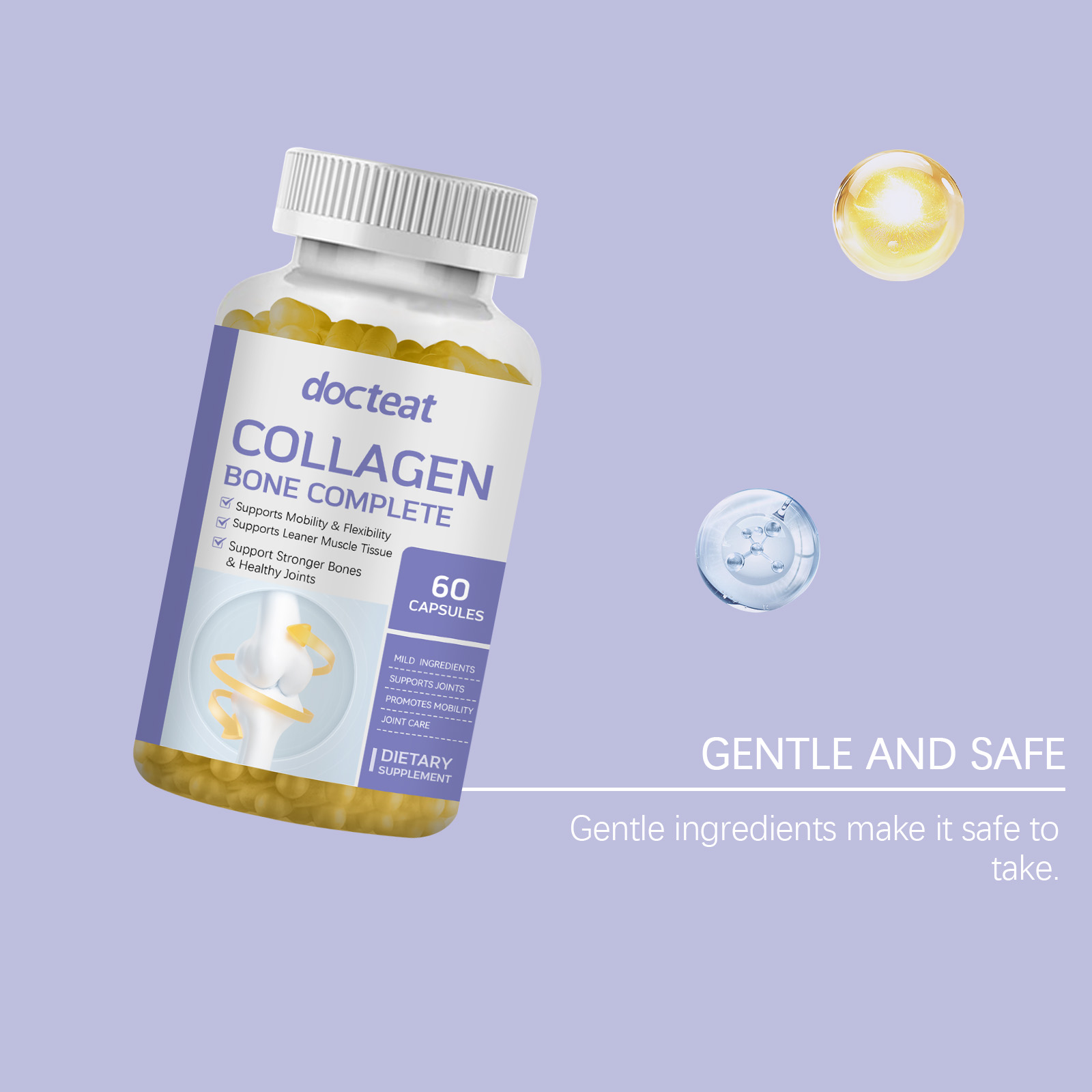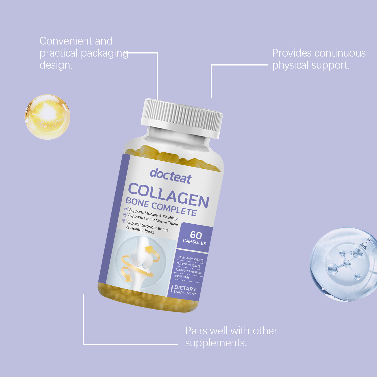 我们的胶原蛋白胶囊,由维生素C、维生素D3精心调配而成。专为促进骨骼强健与关节健康设计。使用方法极为便捷:每天服用2粒胶囊吞咽。并且可以提升整体骨骼健康状态。