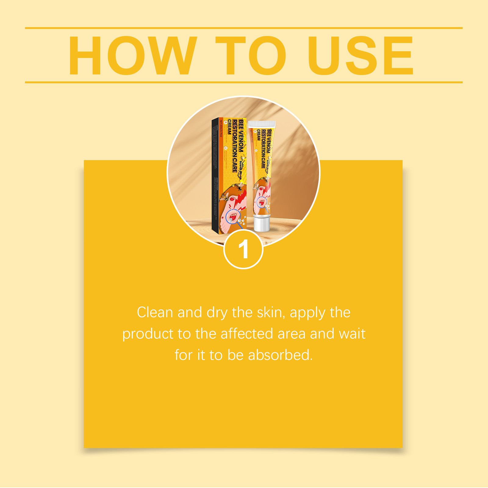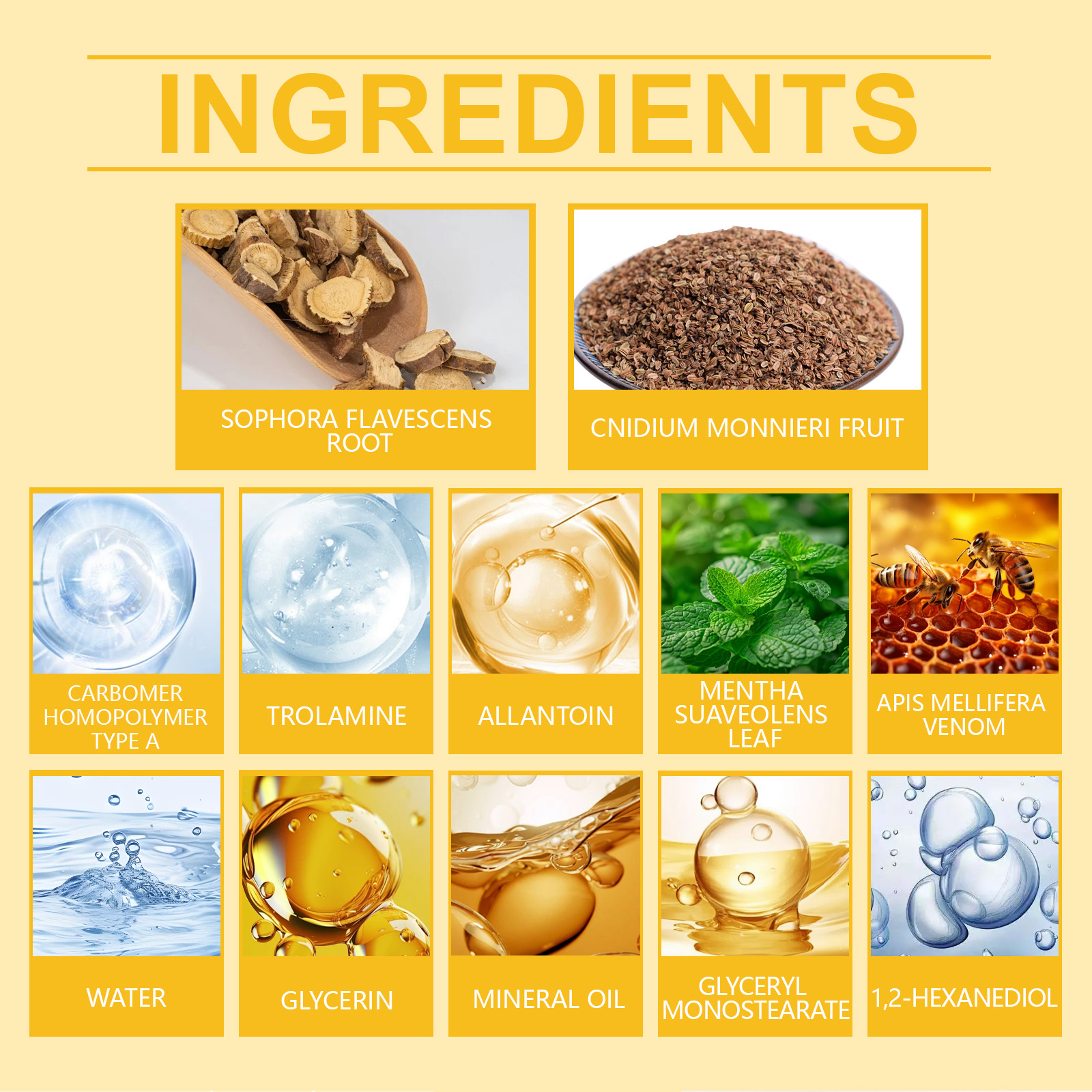 我们的蜂毒身体护理霜,由苦参根、蛇床子果精心调配而成。专为增强细胞再生能力,缩短恢复时间设计。使用方法极为便捷:清洁并干燥皮肤,将产品涂抹在受影响区域,等待其被吸收。并且具有强大的抗菌成分,可以有效防止和减少感染。