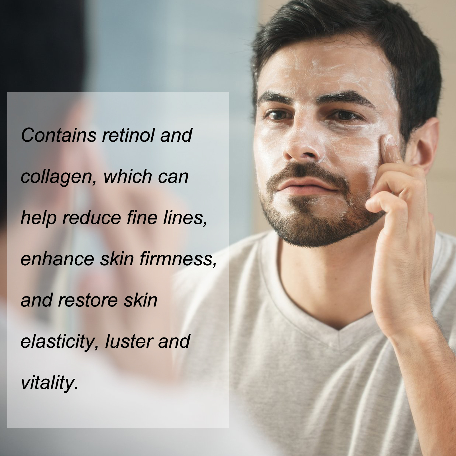 我们的男士面霜含有透明质酸、维生素E、视黄醇。它可以使皮肤紧致有弹性,质地轻盈易吸收,不会给肌肤造成负担,让肌肤感觉清新柔软。含有视黄醇和胶原蛋白,帮助减少细纹,增强肌肤紧致度,恢复肌肤弹性、光泽和活力。它的使用方法很简单:洁面后,取适量面霜均匀涂抹于吸收处。轻轻按摩皮肤直至。男士面霜能迅速被肌肤吸收,锁住水分,令肌肤柔嫩透亮。