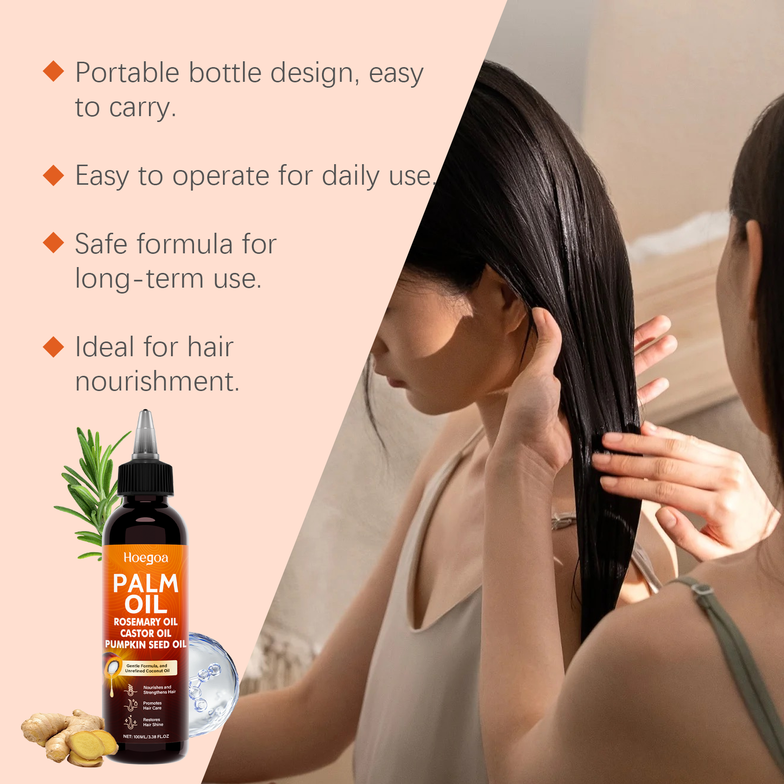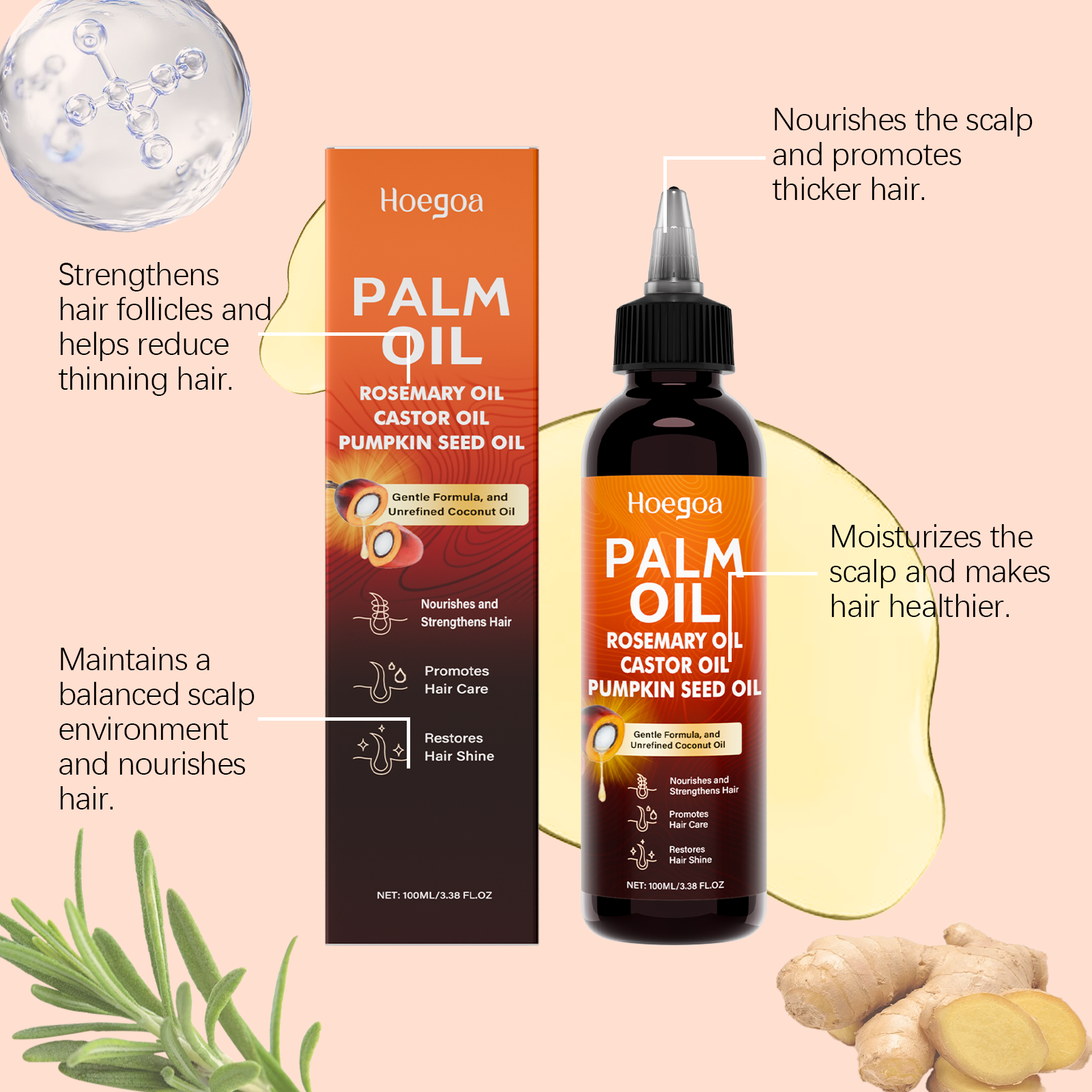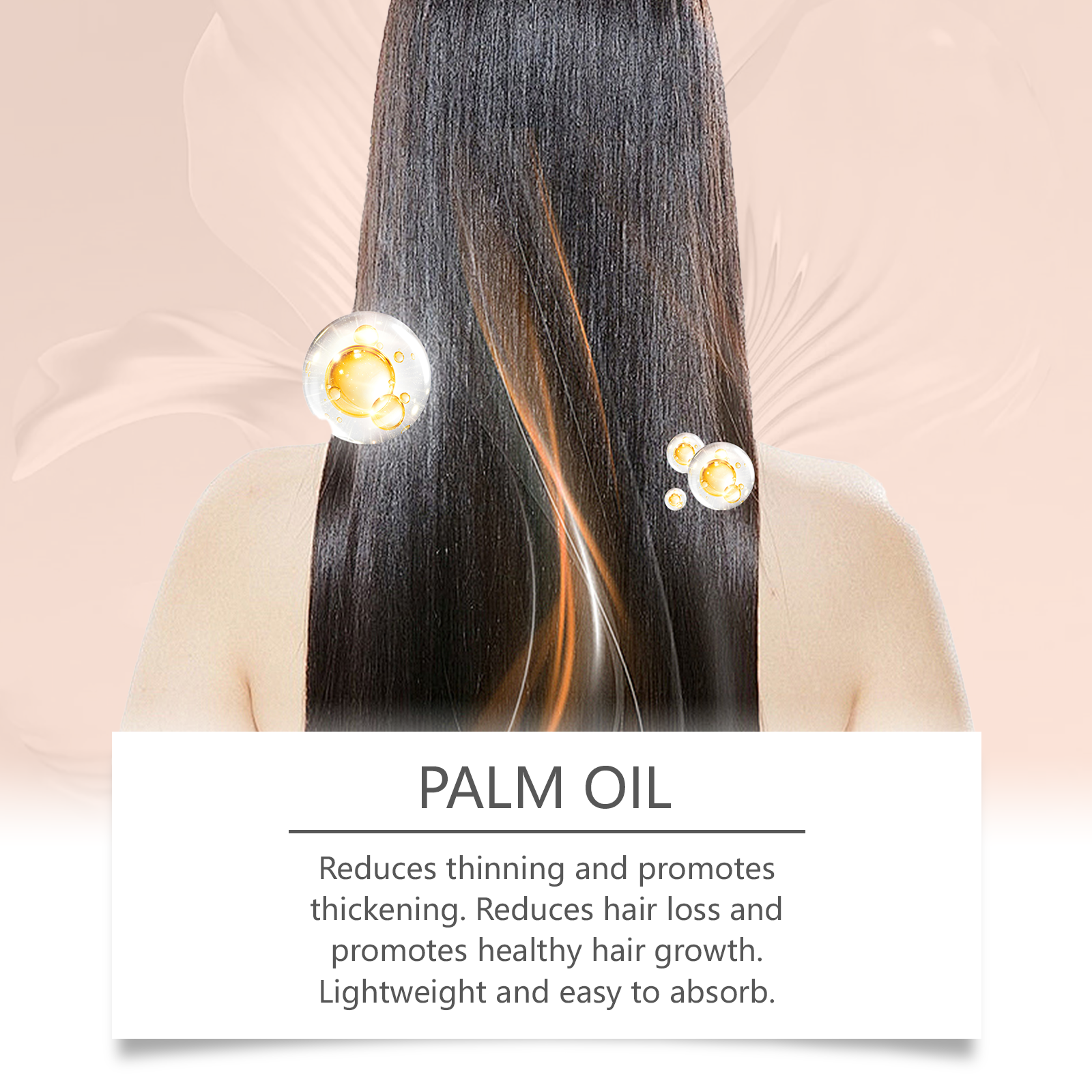 我们的滋养护发精油,由甘油、生育酚(维生素E)精心调配而成。专为减少稀疏,促进增厚,减少脱发,促进健康头发生长,轻盈易吸收设计。使用方法极为便捷:将棕榈油涂抹在手掌中。轻轻按摩头皮和头发。根据需要重复涂抹。并且可以深层保湿并防止干燥,刺激头皮并强化发根。