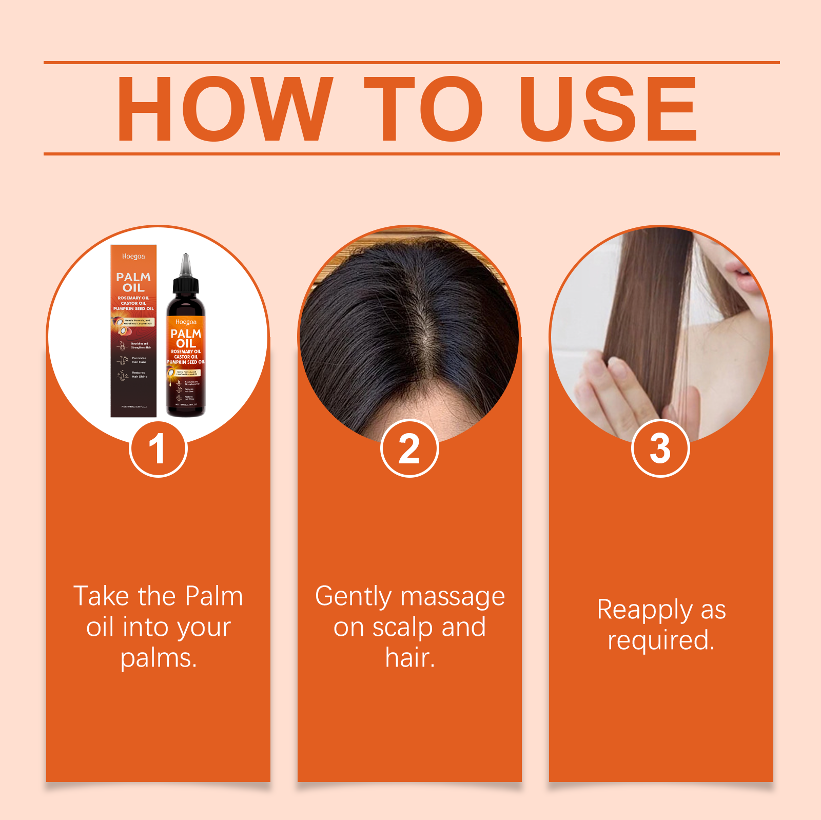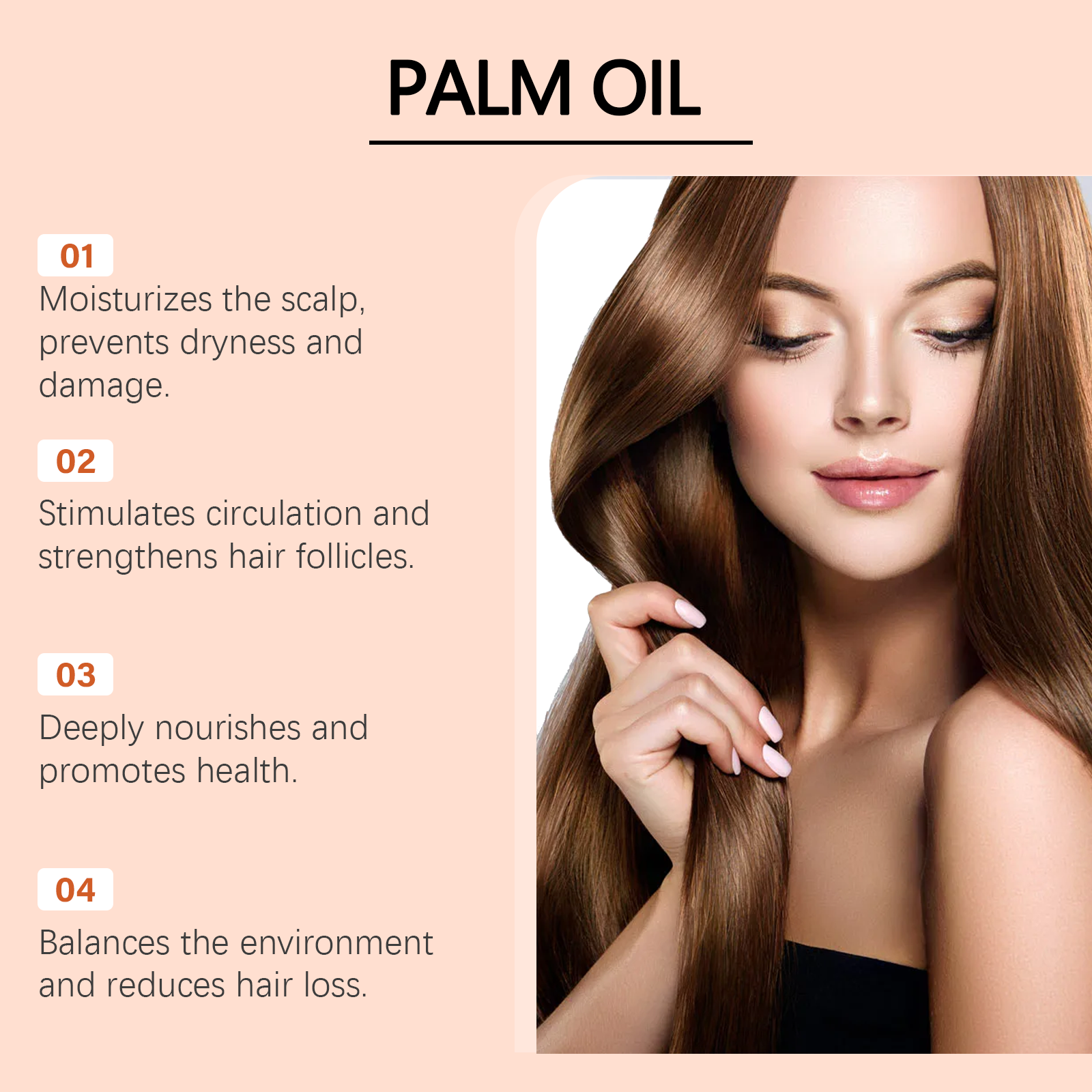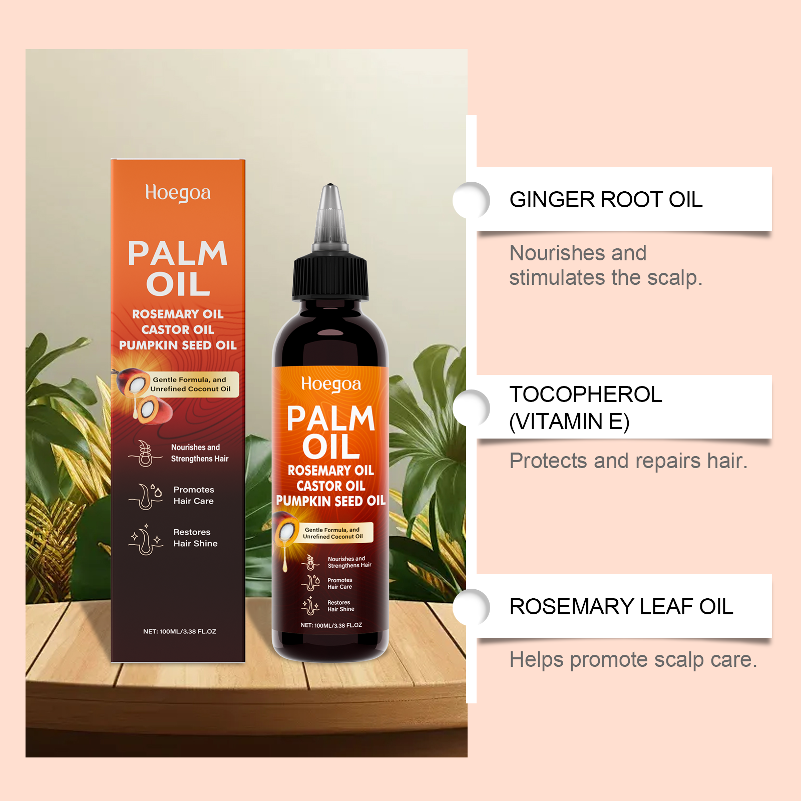 我们的滋养护发精油,由甘油、生育酚(维生素E)精心调配而成。专为减少稀疏,促进增厚,减少脱发,促进健康头发生长,轻盈易吸收设计。使用方法极为便捷:将棕榈油涂抹在手掌中。轻轻按摩头皮和头发。根据需要重复涂抹。并且可以深层保湿并防止干燥,刺激头皮并强化发根。
