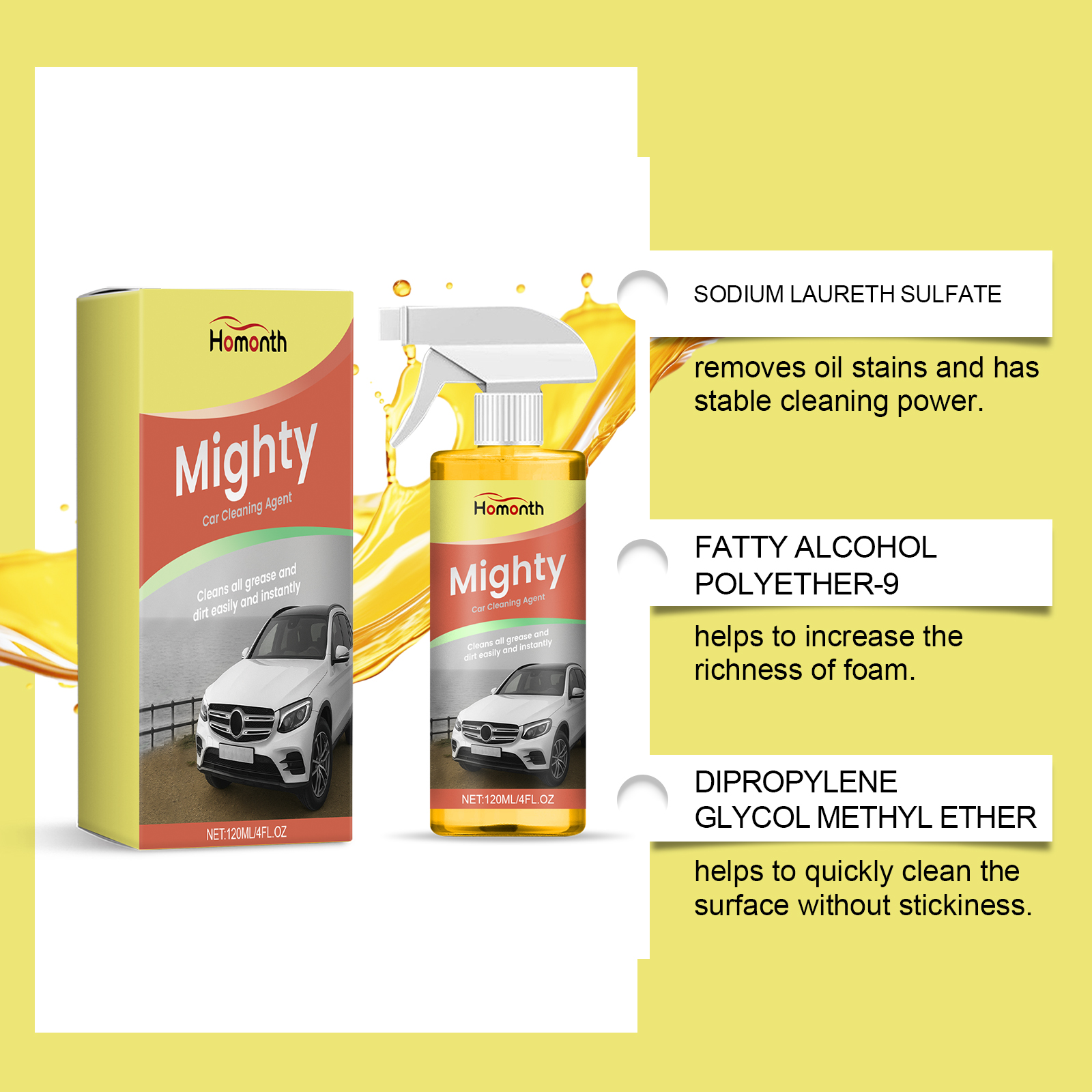 我们的汽车清洁剂,由EDTA 二钠、柠檬酸精心调配而成。专为快速去除汽车内外的污渍设计。使用方法极为便捷:将清洁剂直接喷在要清洁的物体表面。使用清洁海绵擦式污渍区域。用干毛巾擦拭以去除任何残留的污渍。并且可以强力分解油脂和污垢。