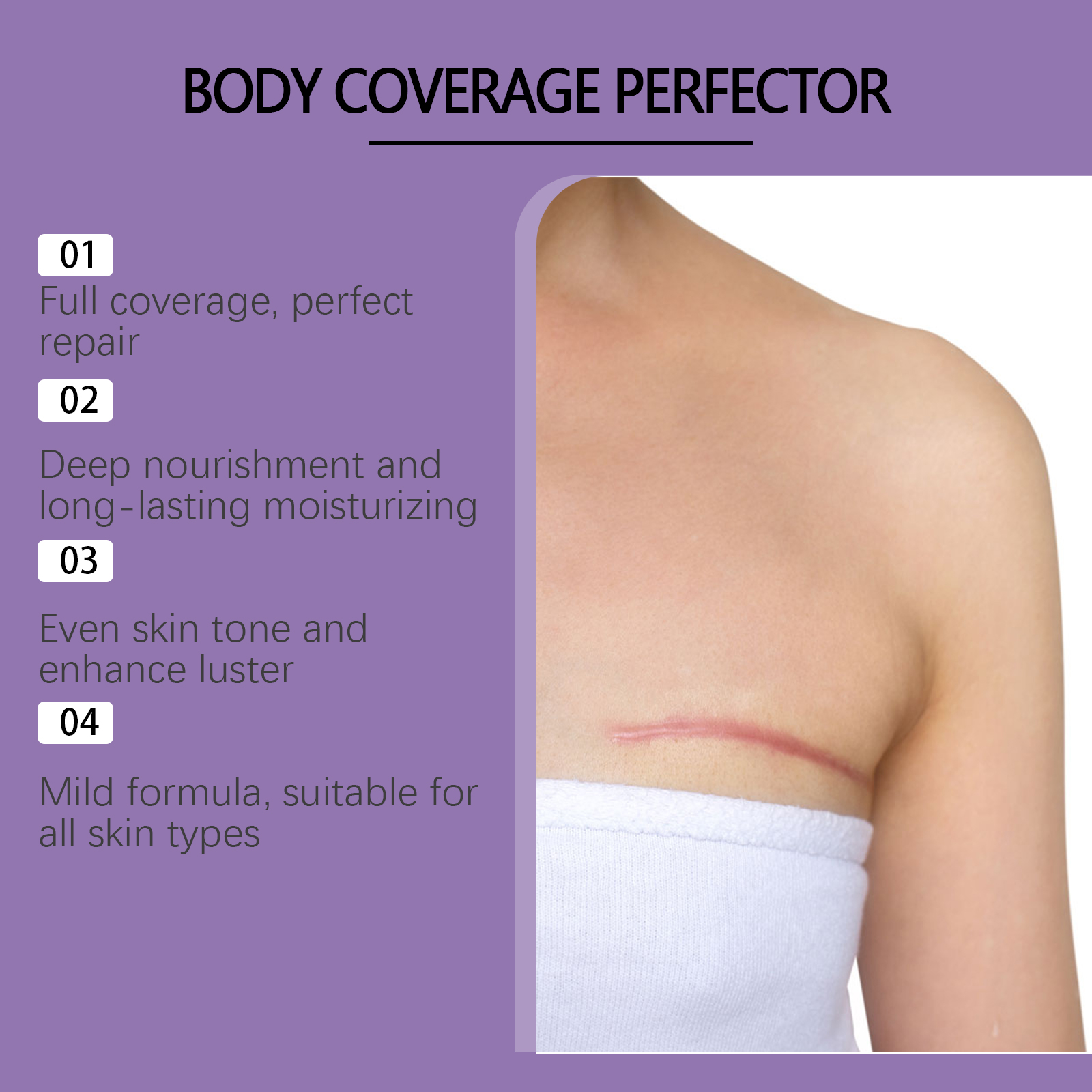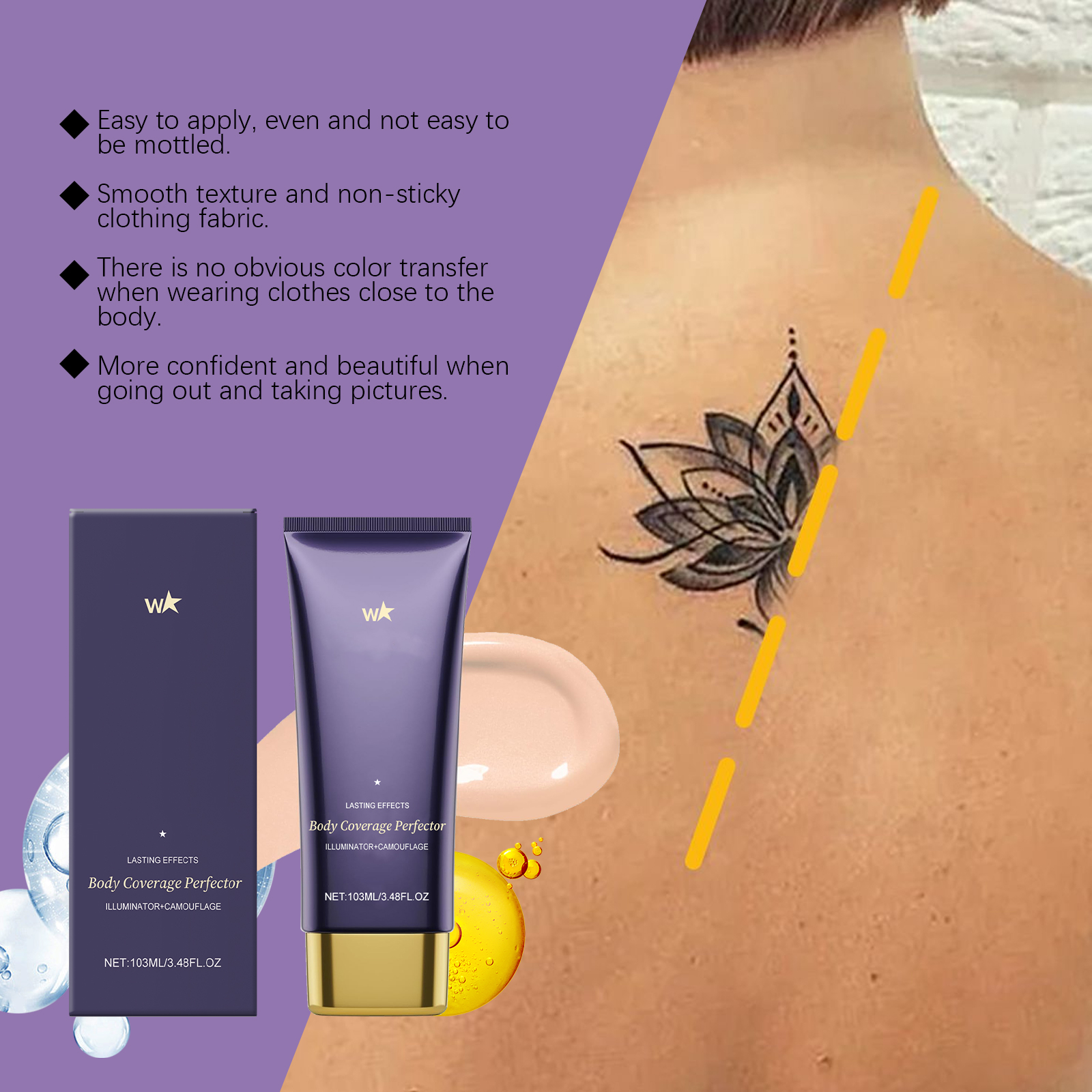 我们的肤色身体遮瑕护理霜,由聚二甲基硅氧烷、二氧化钛精心调配而成。专为深层滋养和持久保湿设计。使用方法极为便捷:清洁和干燥皮肤,将适量产品涂抹在需要修改的区域,如腿部、手臂上的纹身或身体上的疤痕。如有必要,可以再涂层,以增加覆盖范围,让每层涂料干燥10分钟。用纸中、毛巾或手套擦拭被覆盖的区域,去除多余的产品,直到产品不再脱落。并且它可以长时间保持良好的遮瑕效果,使用时皮肤不会感到负担。