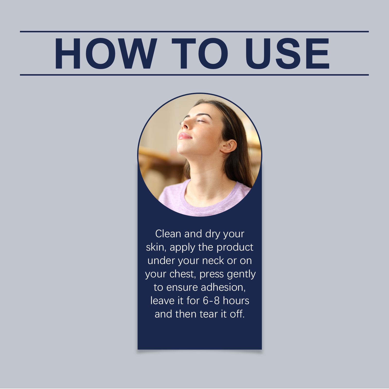 我们的身体护理贴片,由尿囊素、乙二胺四乙酸二钠精心调配而成。专为满足不同群体日常护理的多样化需求设计。使用方法极为便捷:清洁并干燥皮肤,将本品贴在颈部下方或胸部,轻轻按压以确保粘附,保持6-8小时,然后撕下。并且可以与贴片一起使用,提供舒缓和放松的体验。