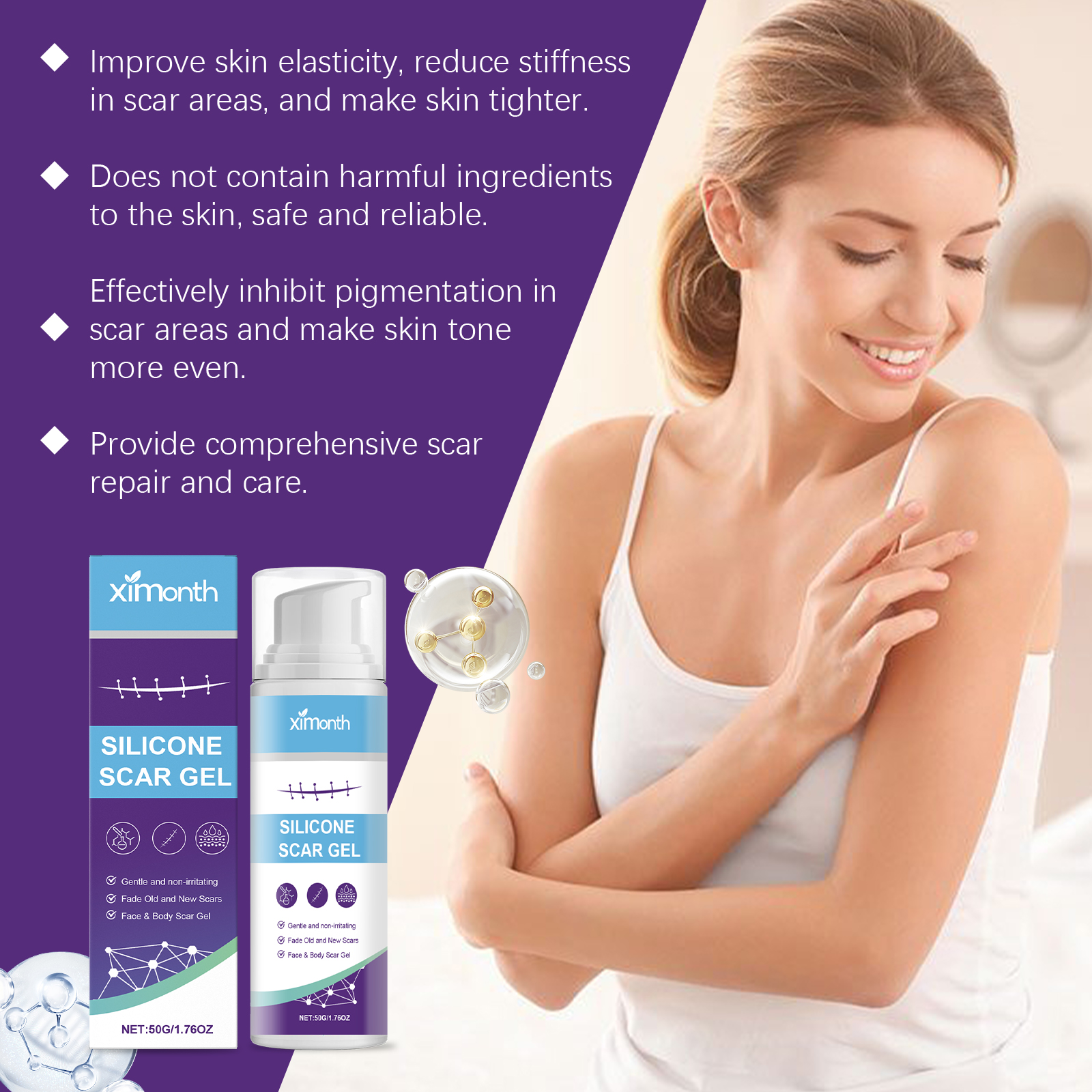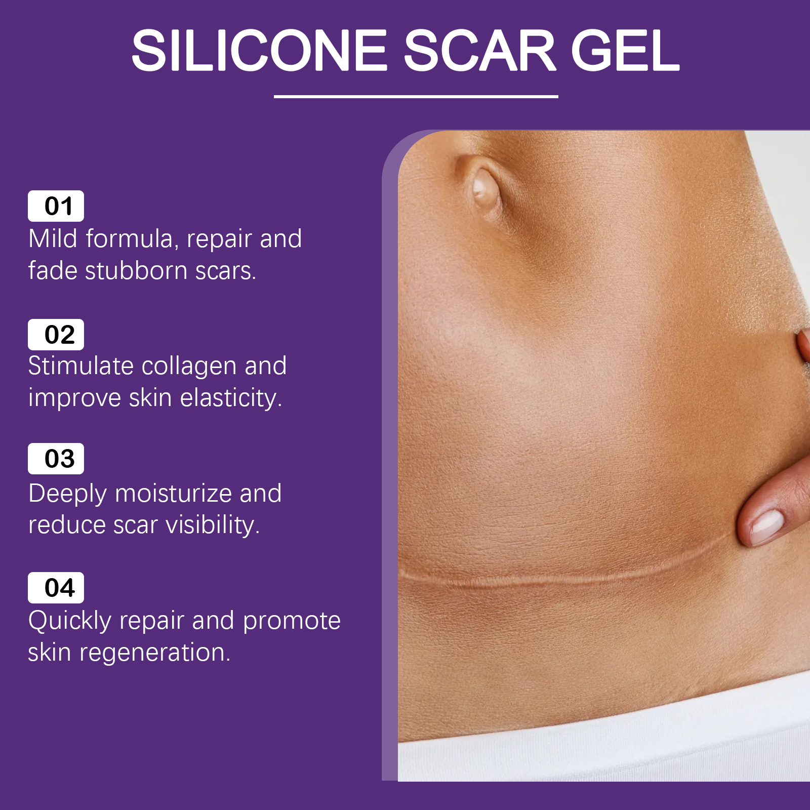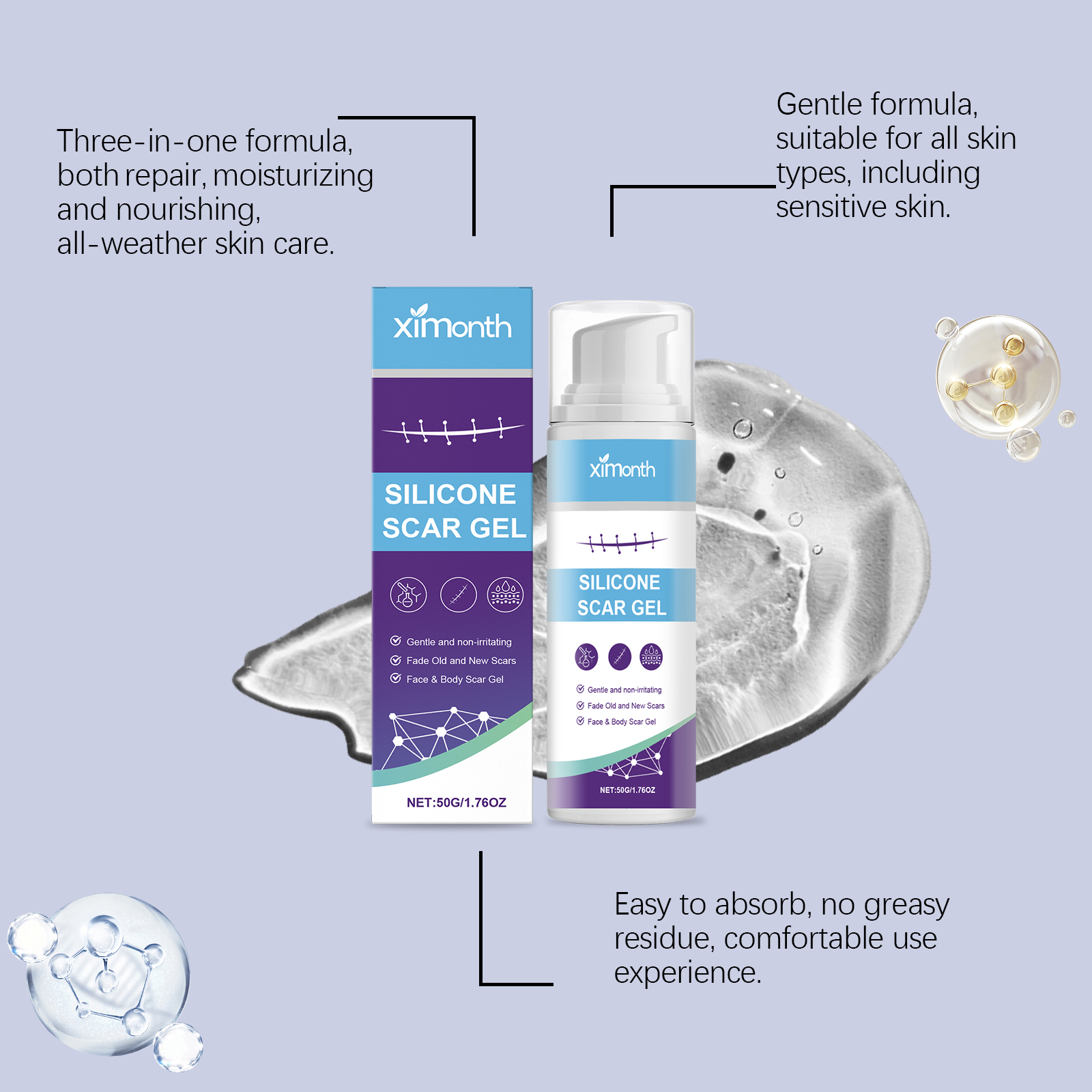 我们的皮肤护理凝胶,由积雪草根、生育酚(维生素E)精心调配而成。专为增强皮肤再生能力,促进胶原蛋白生成,并加速疤痕愈合设计。使用方法极为便捷:清洁疤痕处的皮肤并保持干燥,将适量的本品均匀涂抹在疤痕处皮肤上,并轻轻按摩,以促进更好的吸收。可以有效淡化旧疤痕,减少新疤痕的形成,使皮肤更光滑、均匀。