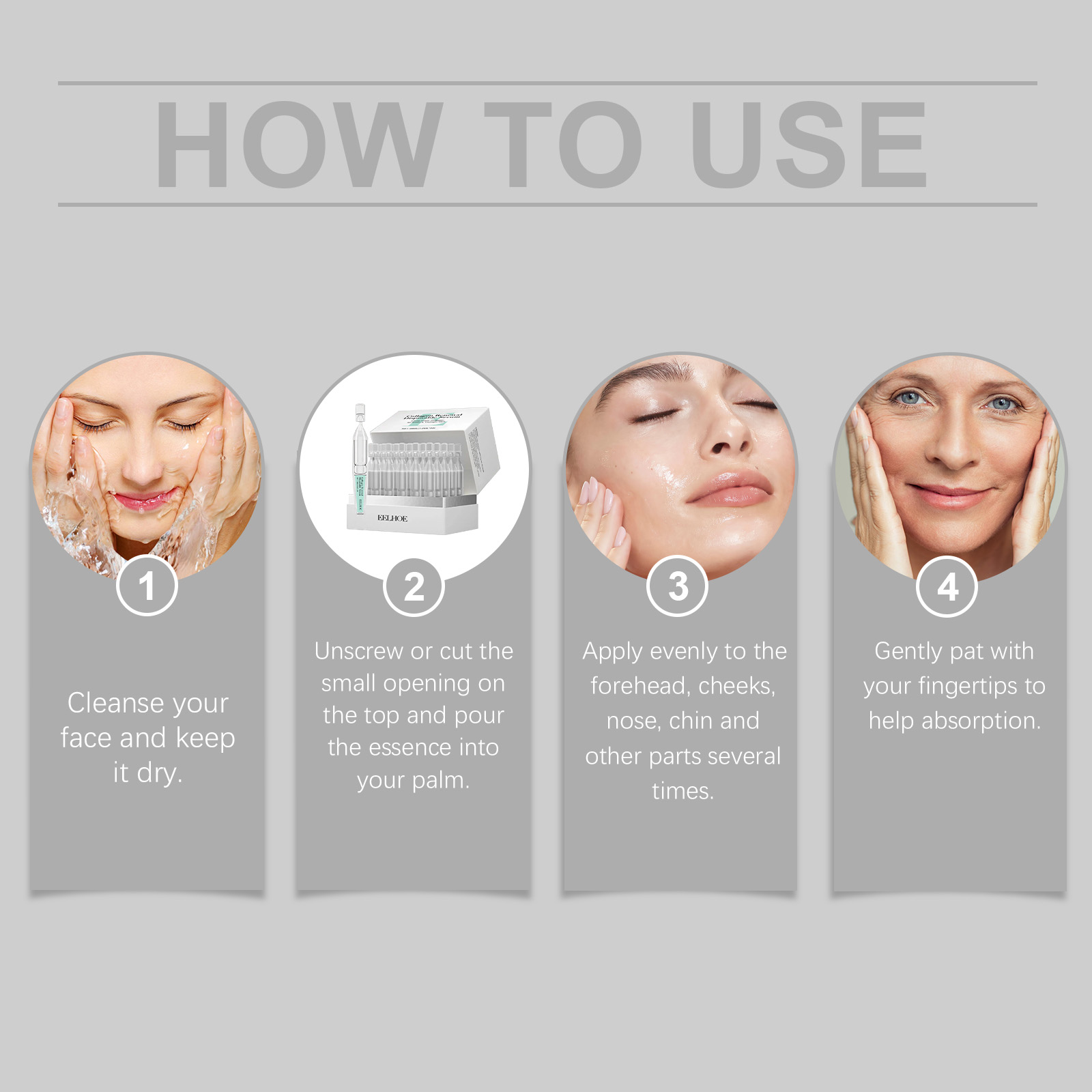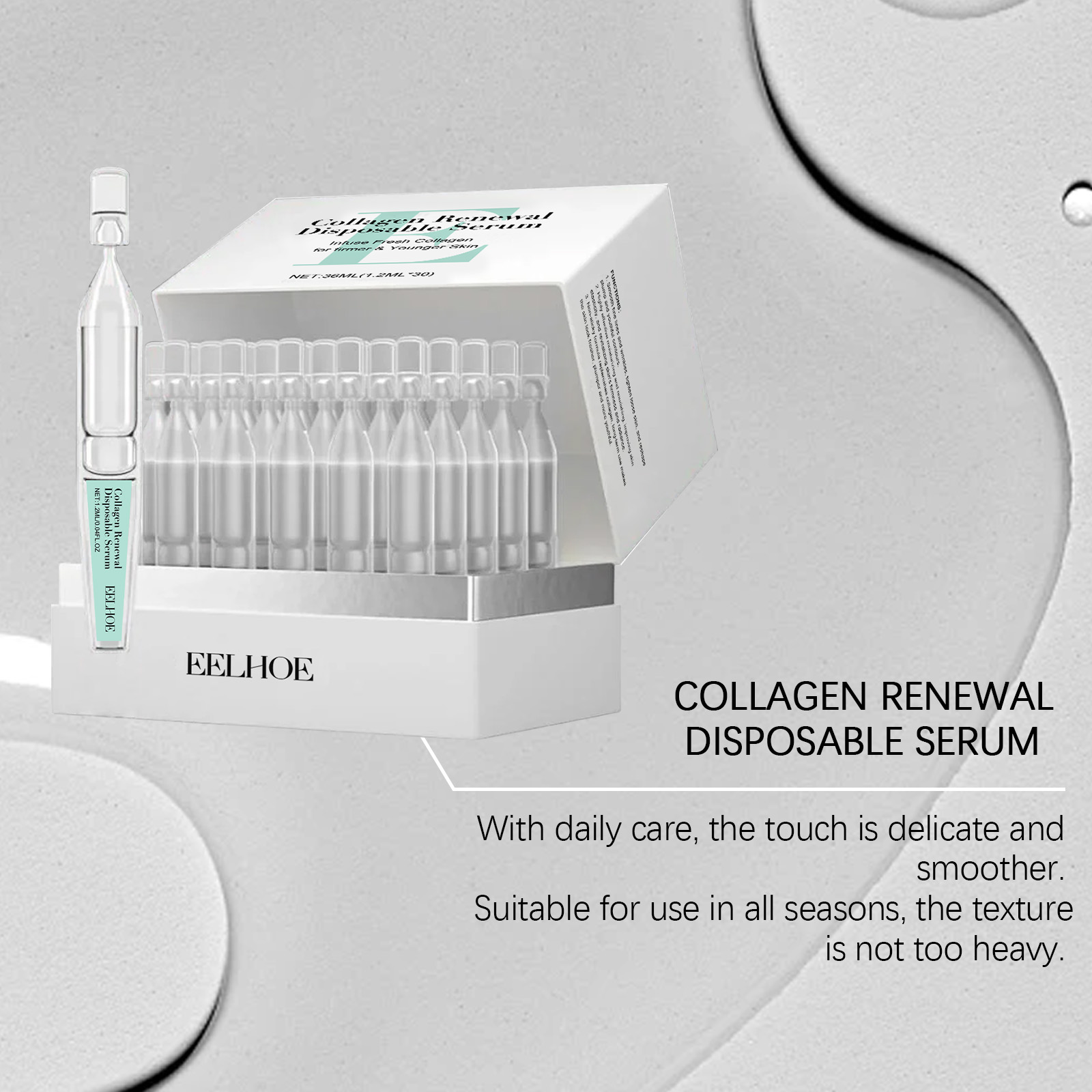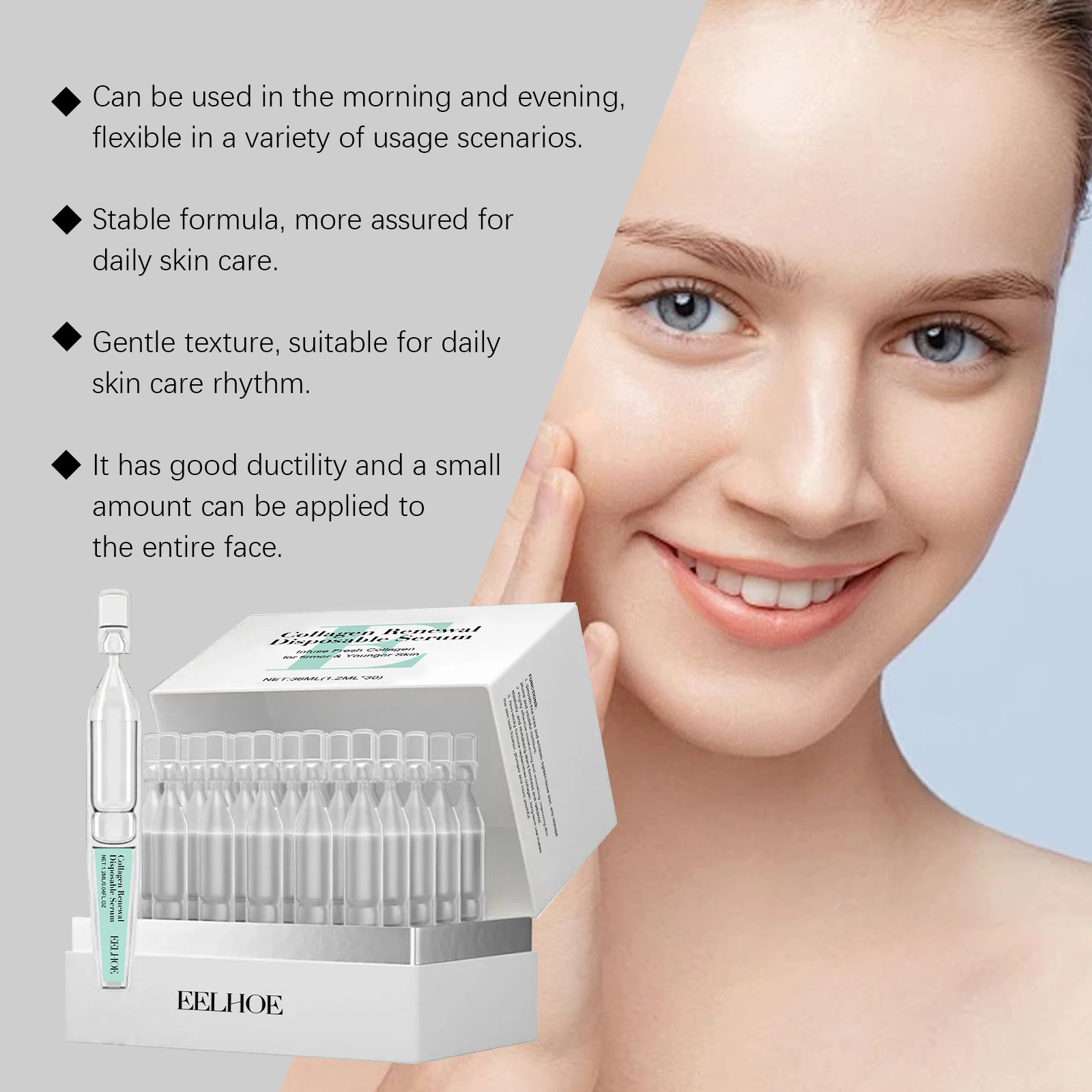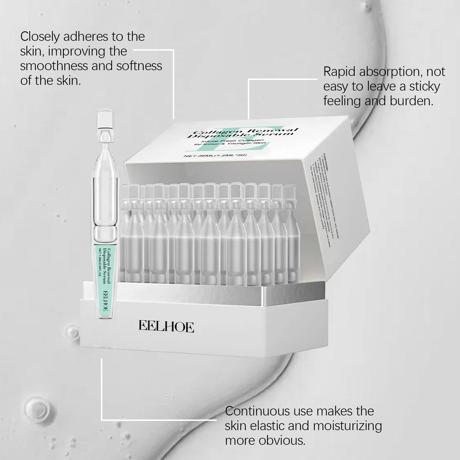 我们的保湿次抛精华液,由维生素C、可溶性胶原蛋白精心调配而成。专为皮肤更加有活力和光泽设计。使用方法极为便捷:清洁面部并保持干燥。拧开或剪开顶部的小孔,将精华液倒在手掌中。均匀涂抹于额头脸颊、鼻子、下巴和其他部位多次使用。用指尖轻轻拍打,以帮助吸收。并且可以改善皮肤保湿并增强保湿感。