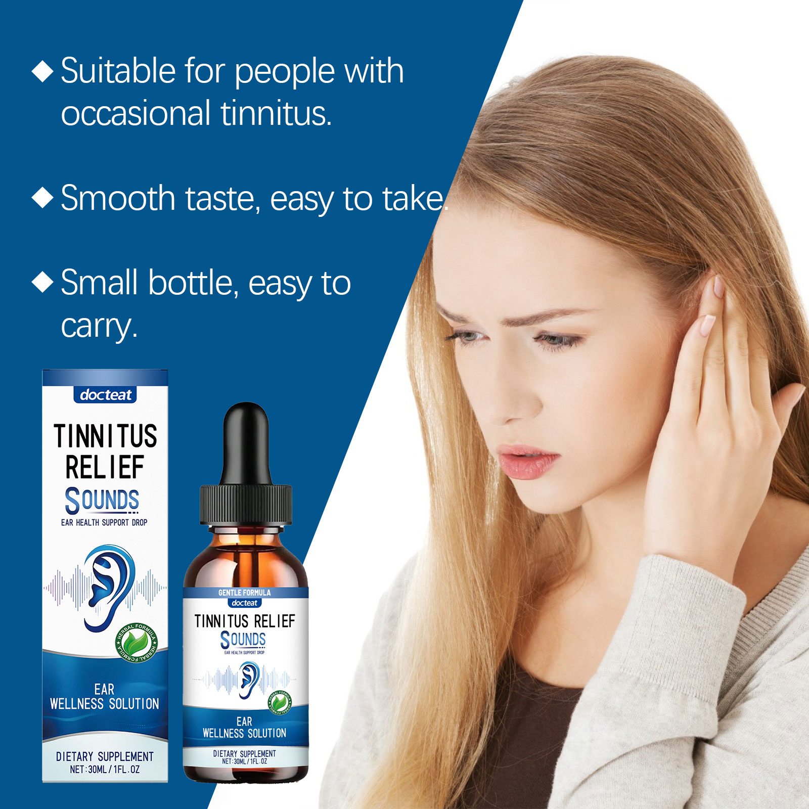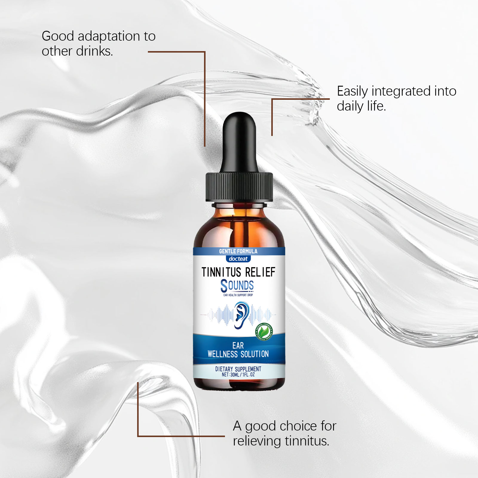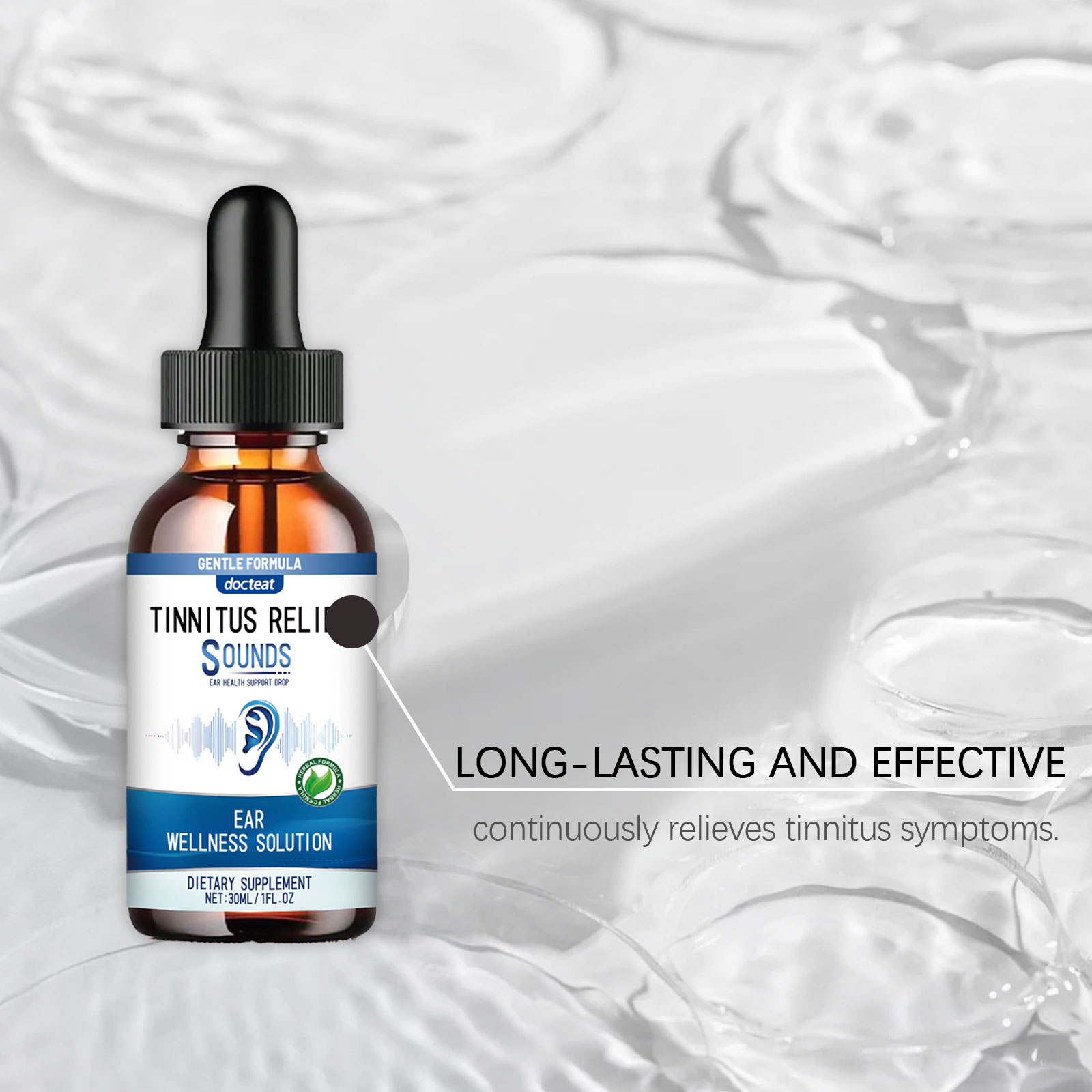 我们的耳部缓解滴剂,由中药提取物、葡萄糖酸内脂精心调配而成。专为改善耳朵舒适度设计。使用方法极为便捷:请在食用前充分摇匀:每次服用1-2滴,每天1-2次。并且可以快速缓解耳部噪音,安全且无负担。