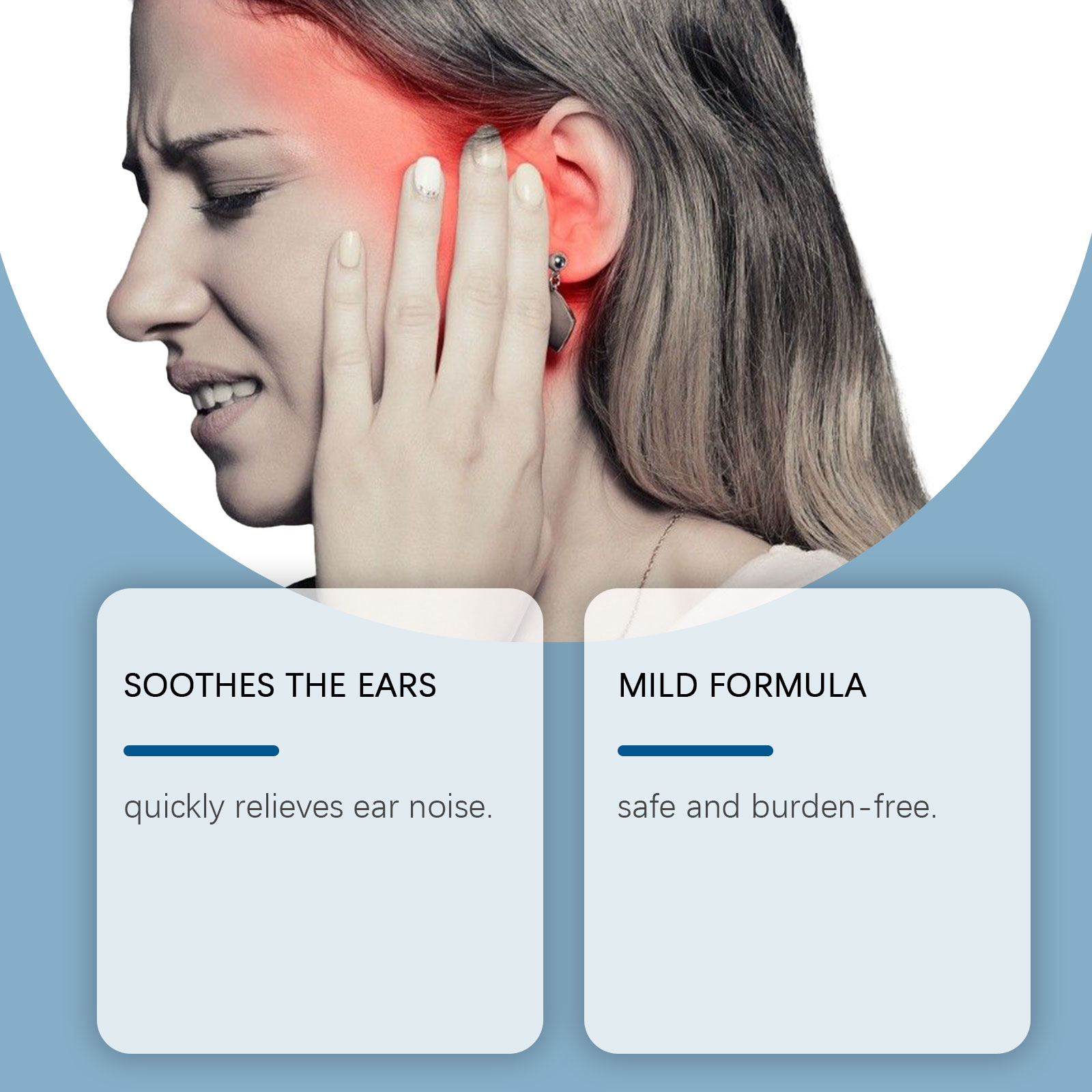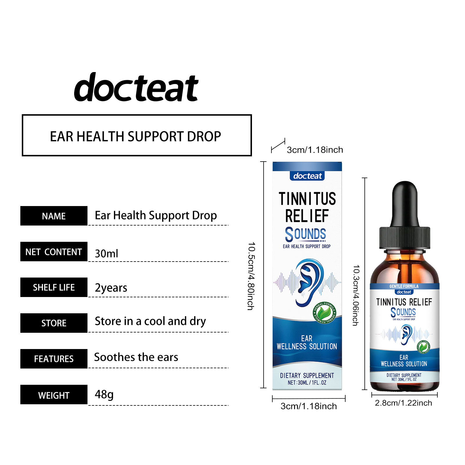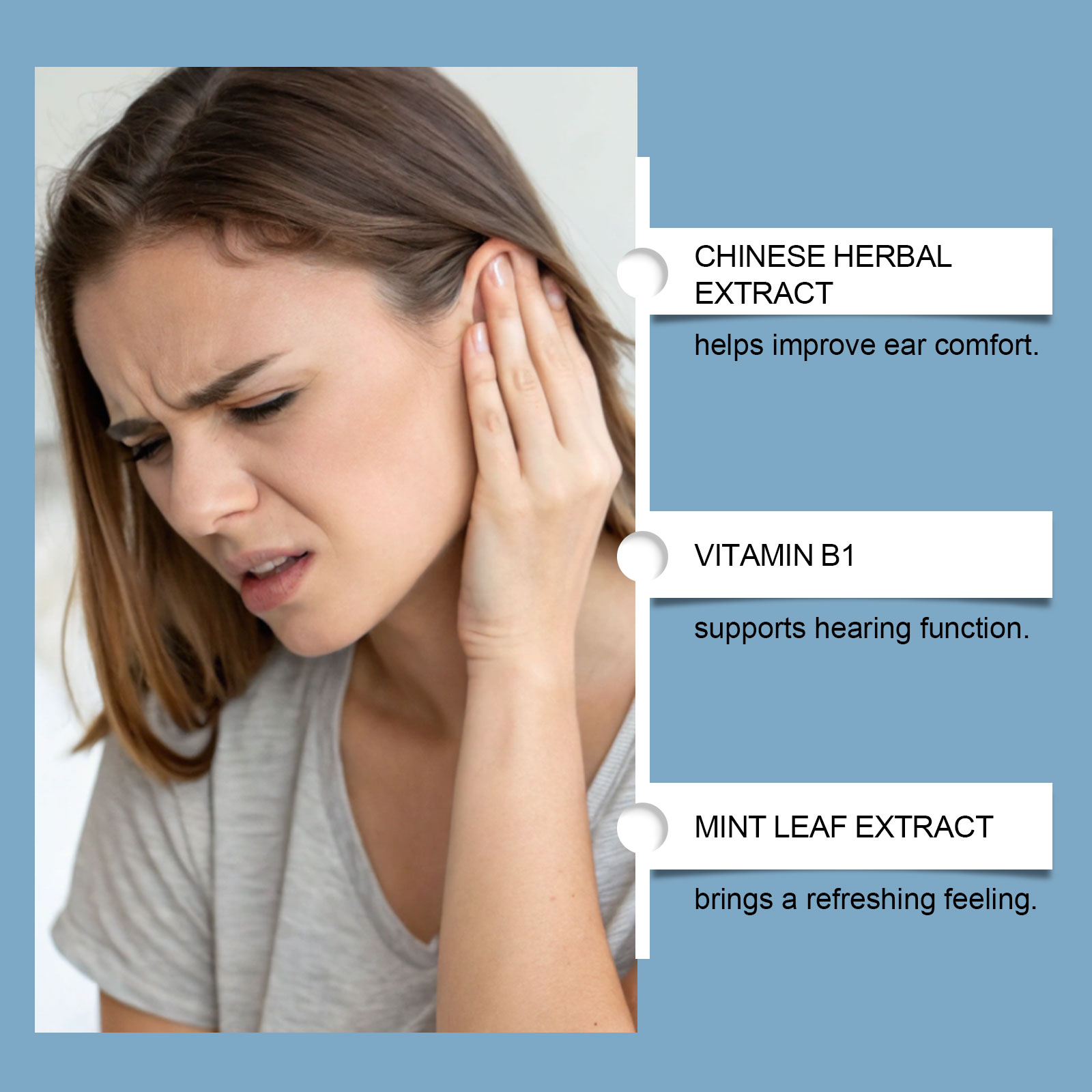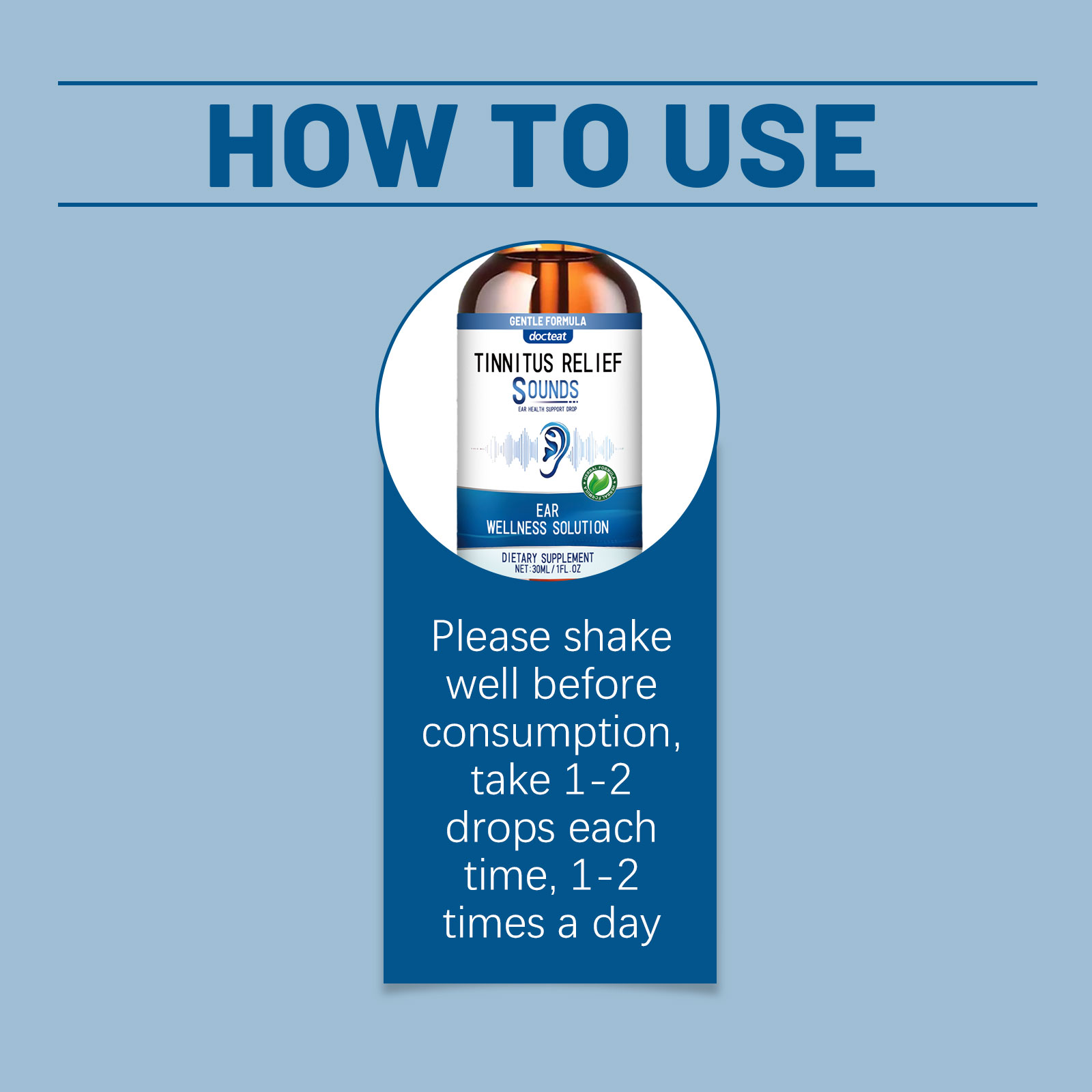 我们的耳部缓解滴剂,由中药提取物、葡萄糖酸内脂精心调配而成。专为改善耳朵舒适度设计。使用方法极为便捷:请在食用前充分摇匀:每次服用1-2滴,每天1-2次。并且可以快速缓解耳部噪音,安全且无负担。