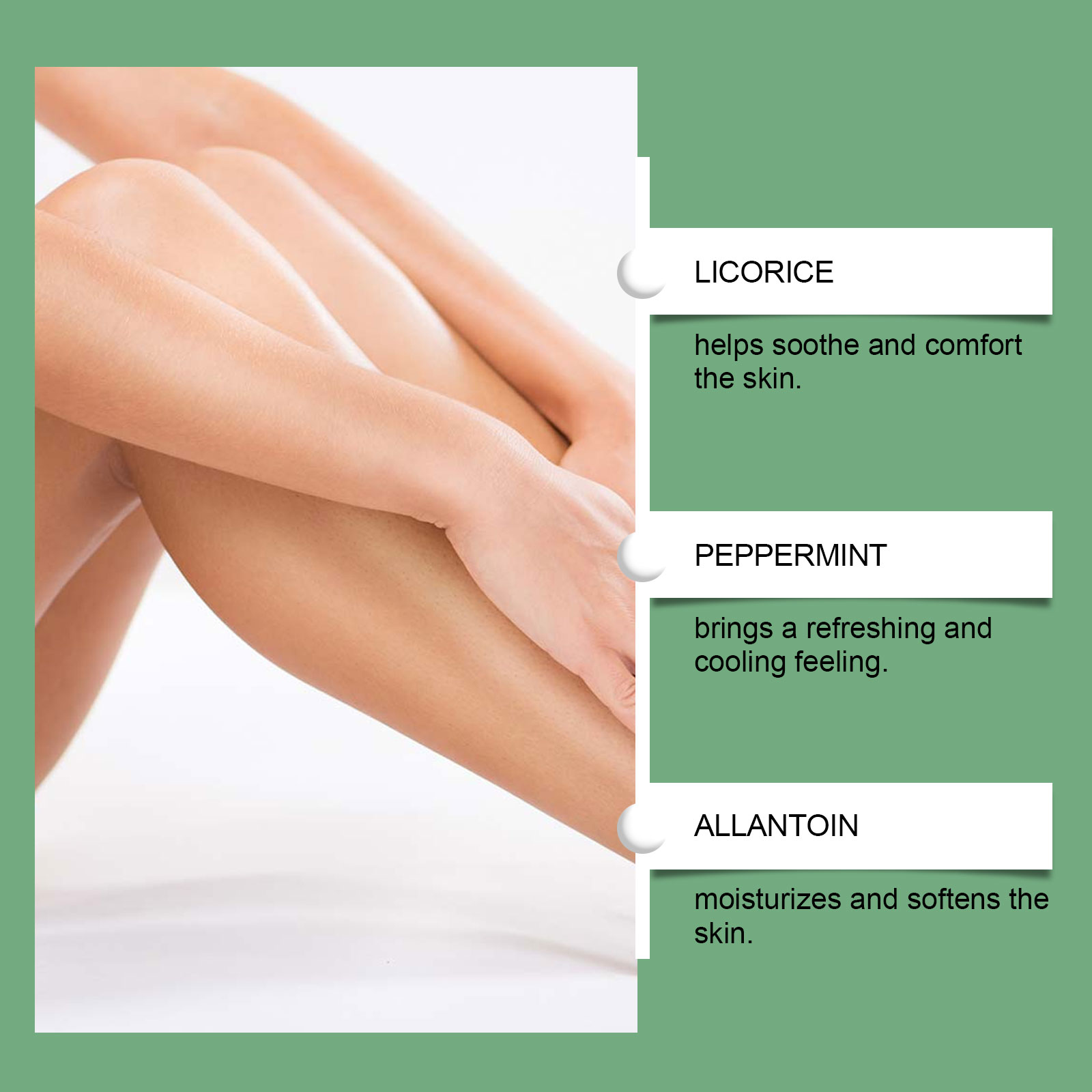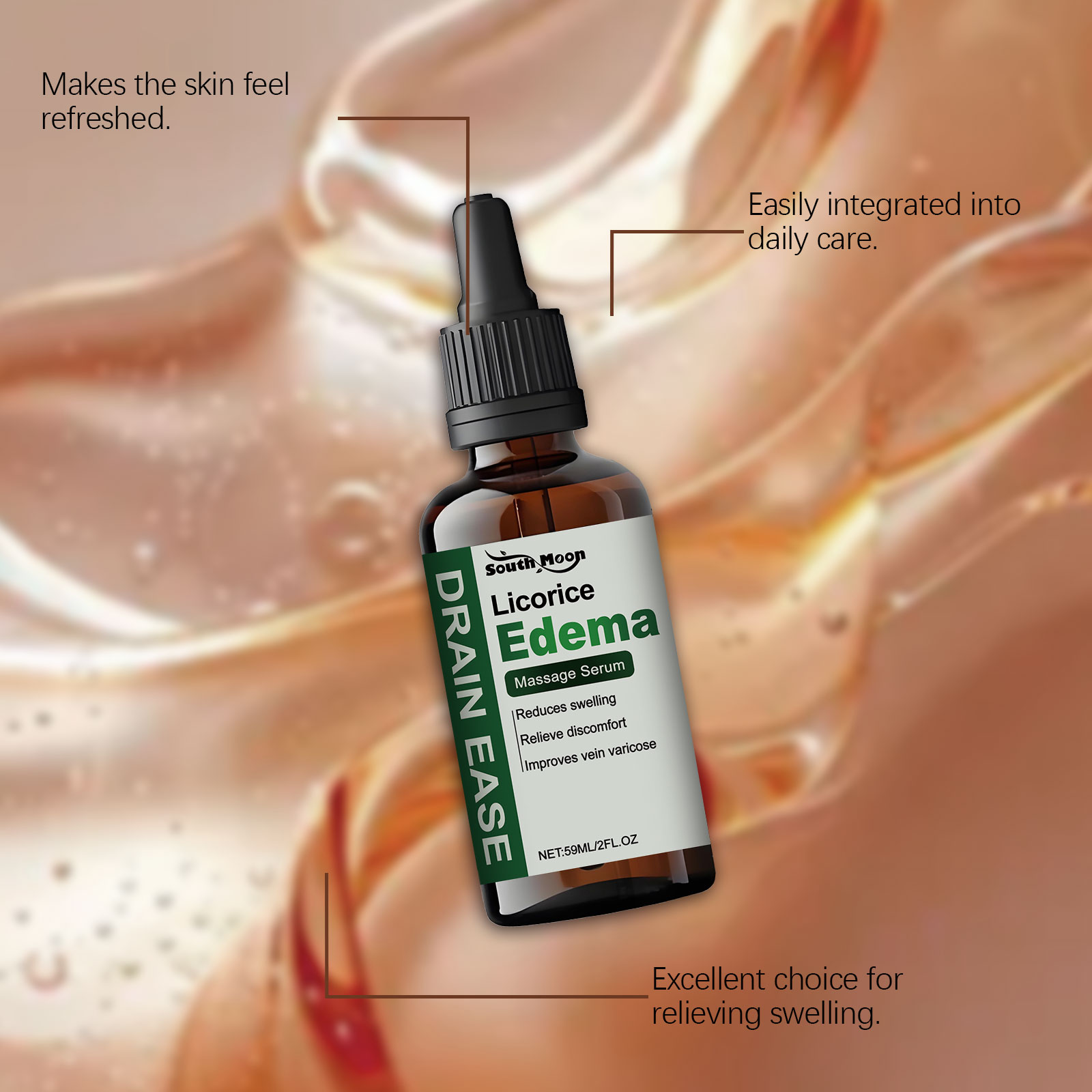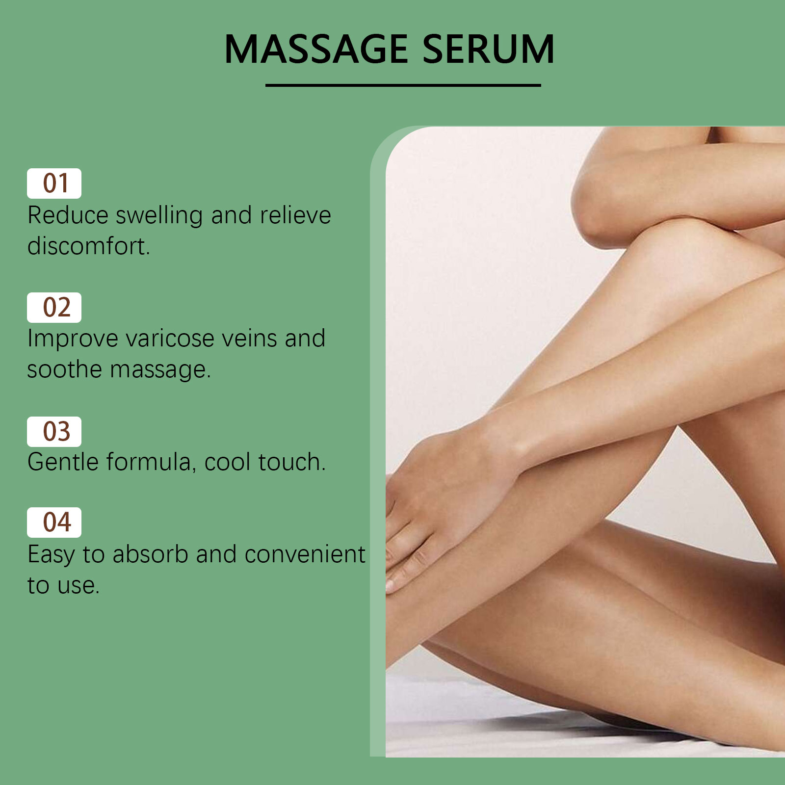 我们的腿部按摩精华液,由甘油、羟乙基纤维素、1,2-己二醇精心调配而成。专为改善肿胀和不适,调整静脉的外观设计。使用方法极为便捷:取适量本产品涂抹于肿胀或其他受影响的皮肤上,并轻轻向上打圈按摩。这种方法可以促进皮肤血液循环并提高吸收率。并且可以有助于舒缓和舒适皮肤,带来清爽和凉爽的感觉,保湿并使皮肤柔软。