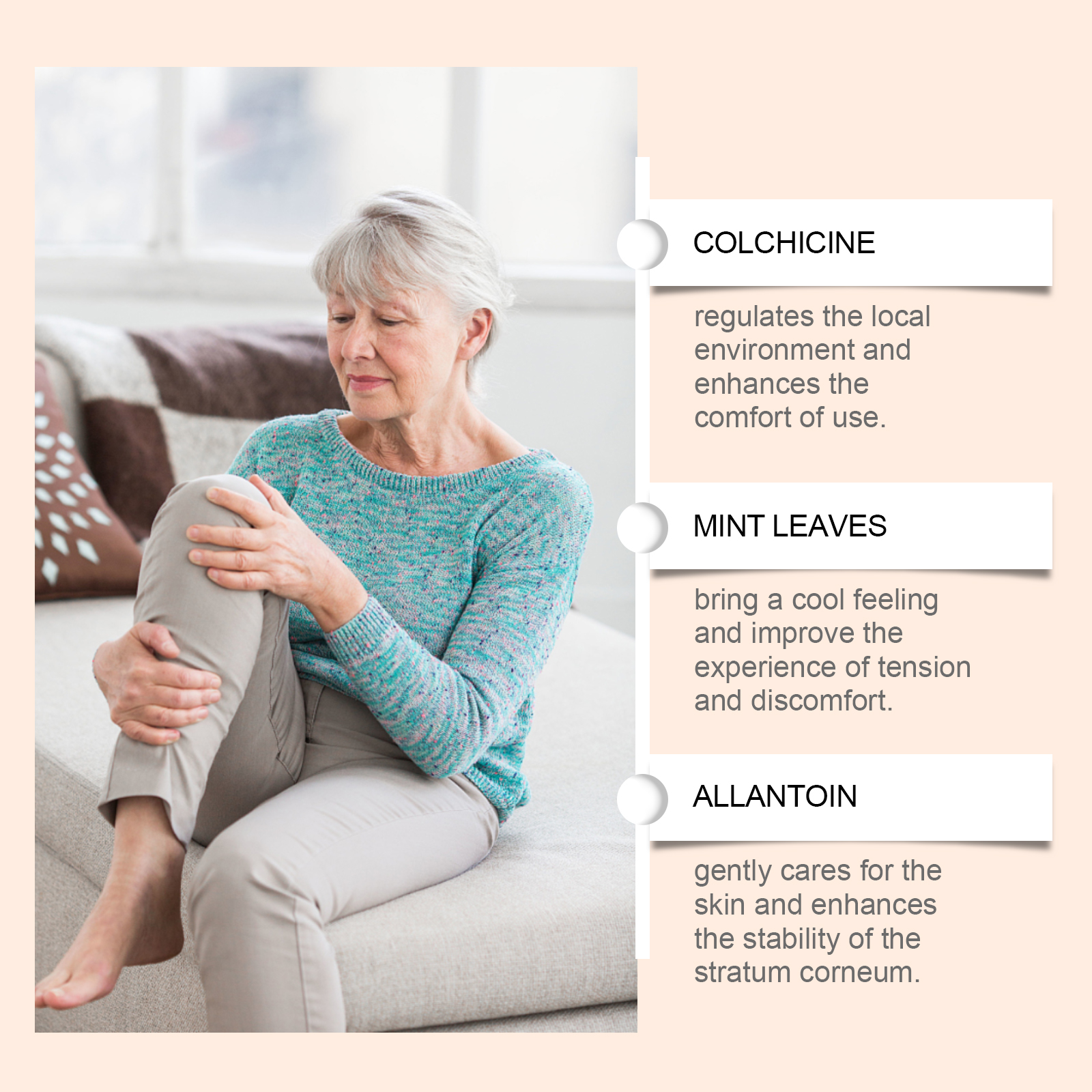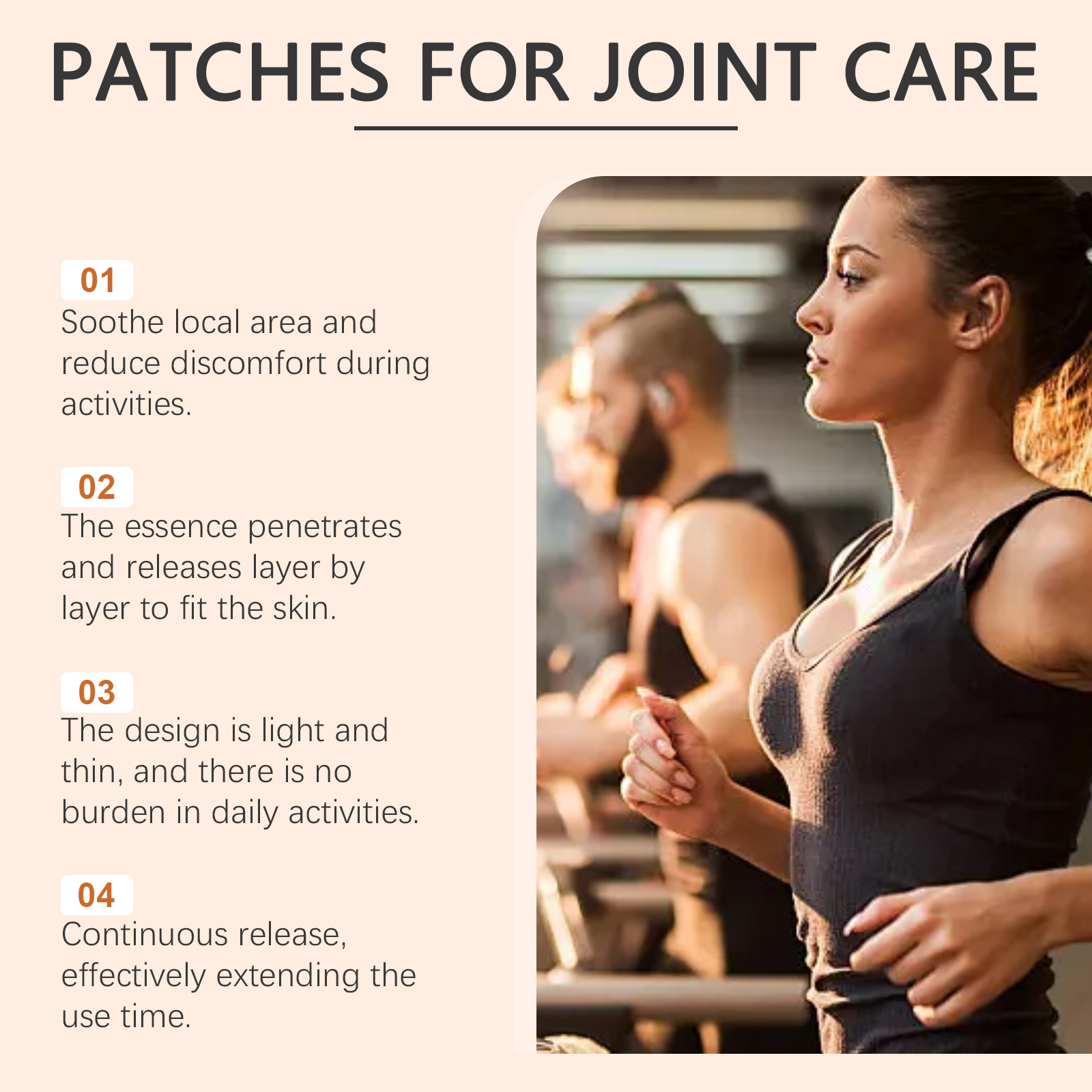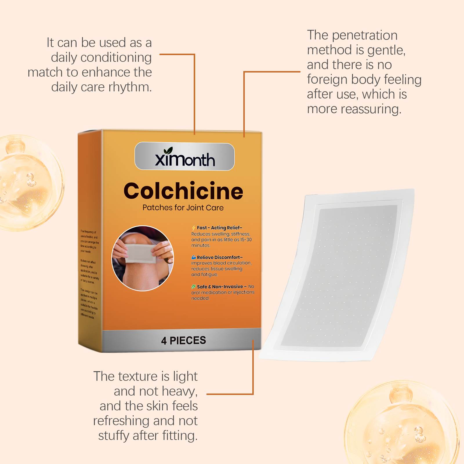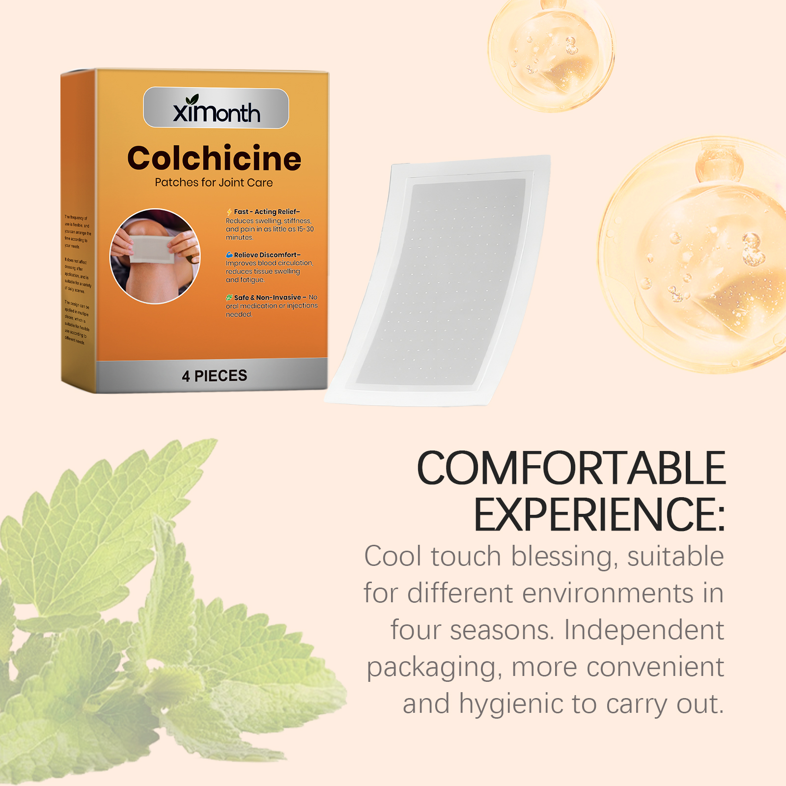 我们的关节护理贴片,由秋水仙碱、薄荷叶精心调配而成。专为调节局部环境并增强使用舒适度设计。使用方法极为便捷:清洁并擦干皮肤,将产品涂抹在受影响的关节区域,轻轻按压以确保粘附,静置6-8小时后取下。并且可以适用于肩膀、肘部、膝盖、脚踝和其他部位,使用过程安静无声,适合日常或工作使用。