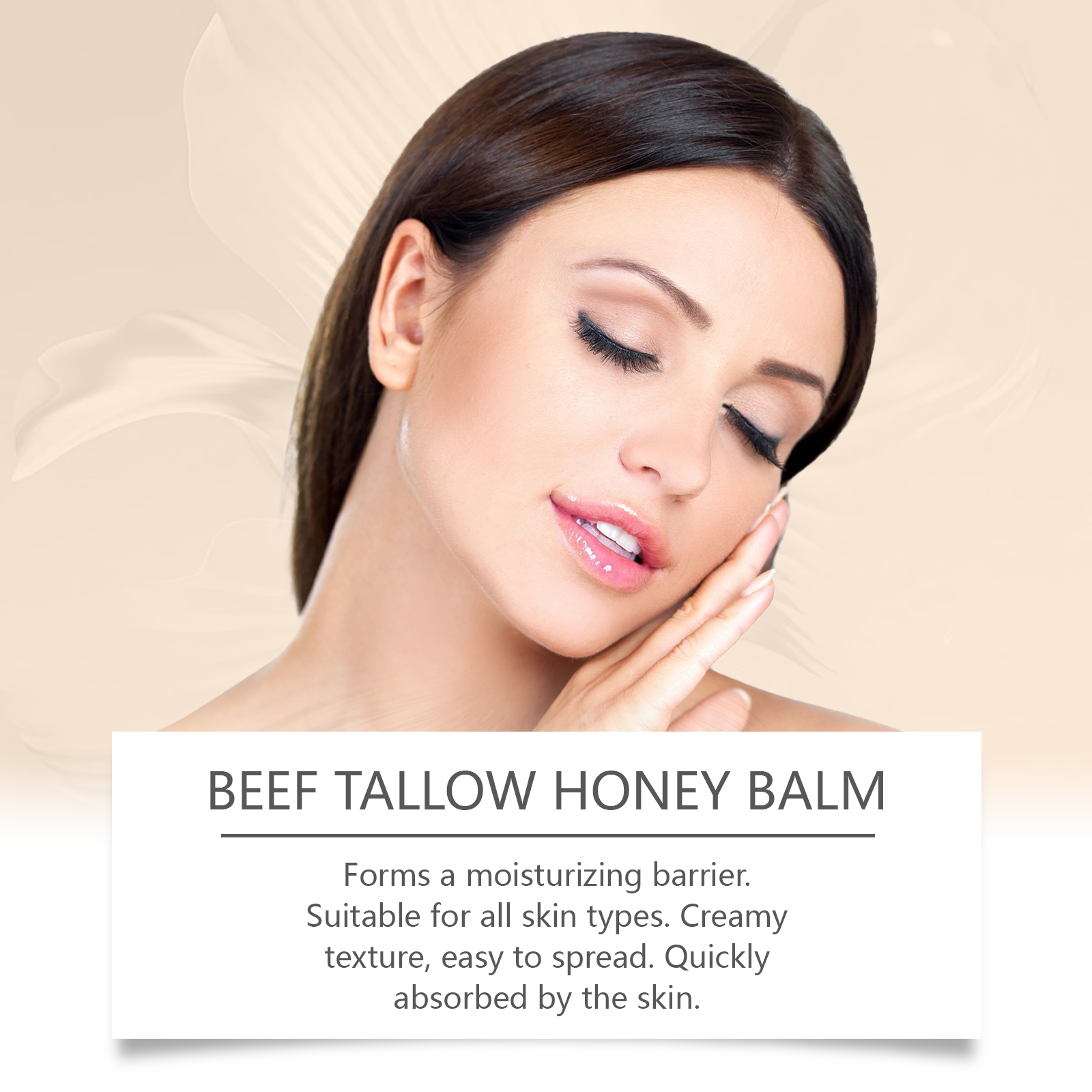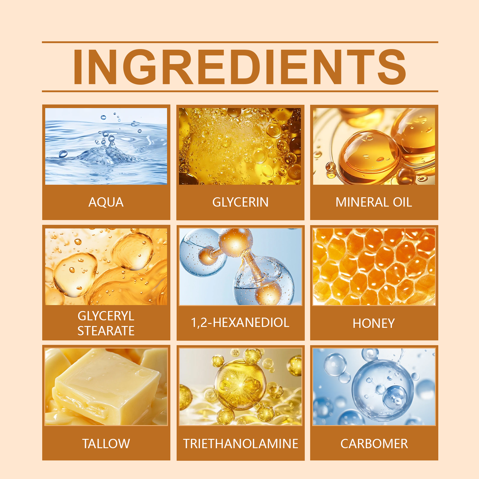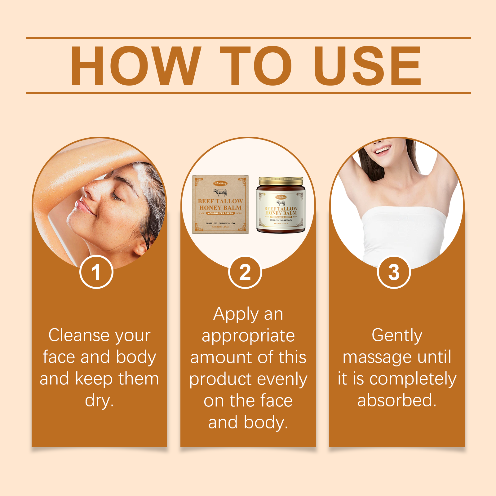 我们的牛脂蜂蜜润肤膏,由甘油、矿油、甘油硬脂酸酯精心调配而成。专为滋润肌肤设计。使用方法极为便捷:清洁面部和身体,并保持干燥,取适量本品均匀涂抹于面部和身体,轻轻按摩直至完全吸收。并且可以改善粗糙的皮肤质地。