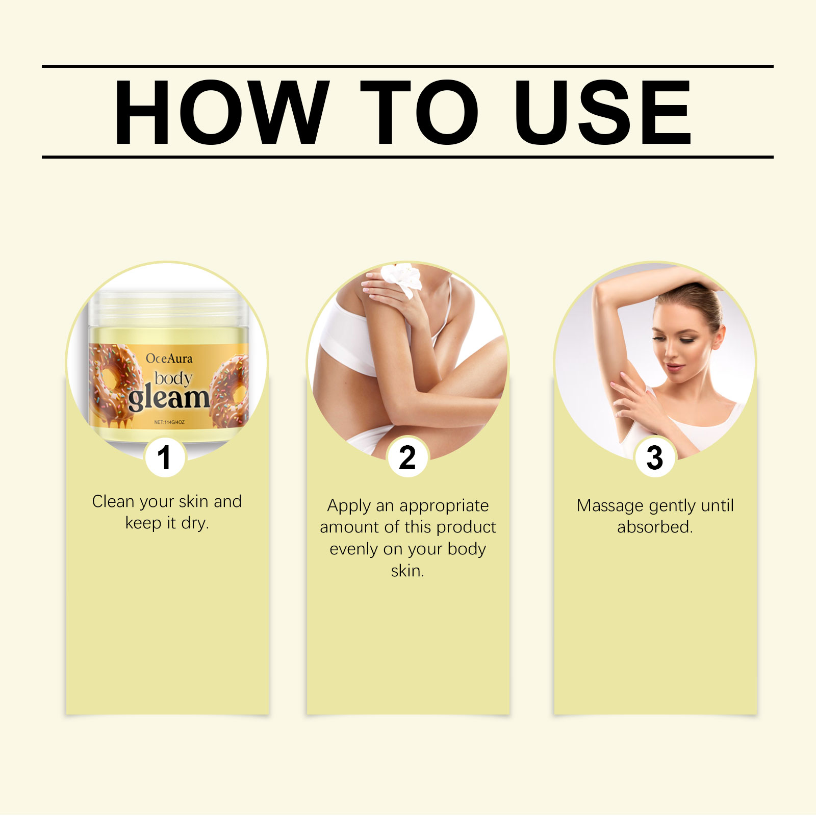 我们的身体黄油润肤霜(甜甜圈),由三乙醇胺、乳木果油、牛奶提取物改善肤色暗沉,淡化黑斑,提亮全身肤色设计。使用方法极为便捷:清洁肌肤并保持干燥。取适量本品均匀涂抹在身体肌肤。轻柔按摩直至吸收。并且轻盈触感,适合多种季节使用。