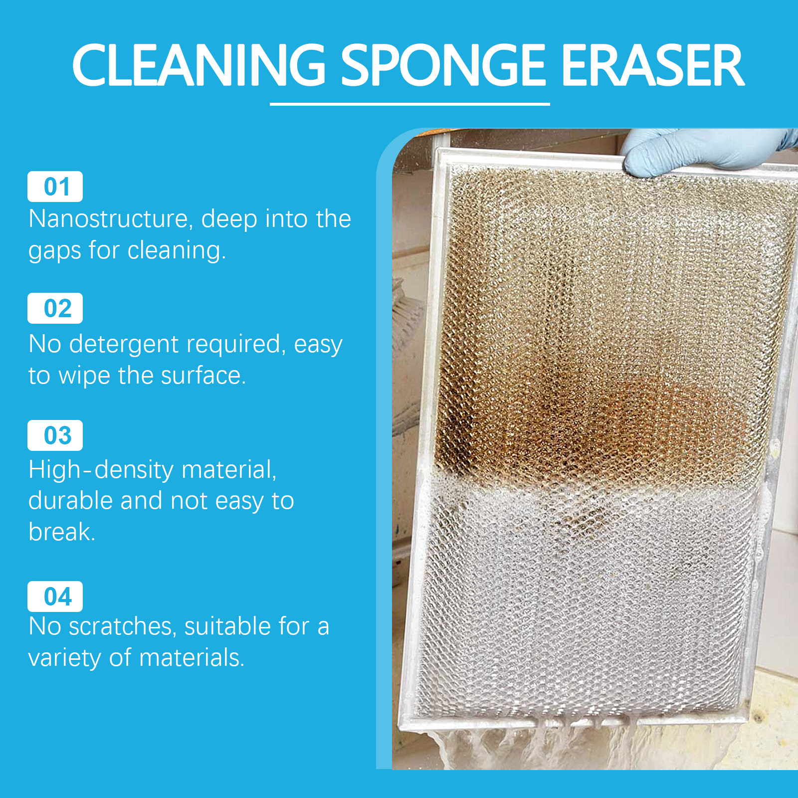 我们的清洁海绵擦 ,由纳米海绵精心调配而成。专为深层去污,高效清洁设计。使用方法极为便捷:用水把海绵弄湿;轻轻挤压海绵,轻轻擦洗污渍;用完后用清水冲洗脏海绵,把海绵上的水挤干。并且无刺激性气味,清洁过程更舒适。