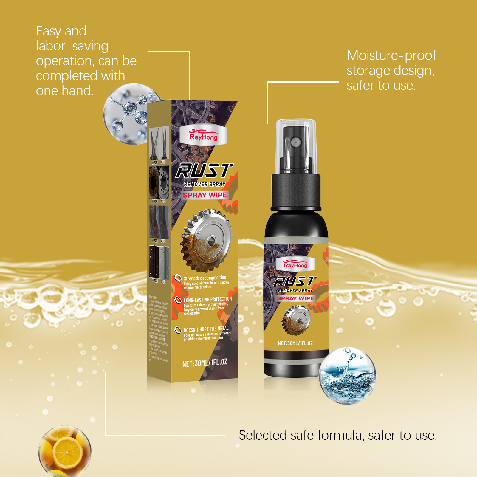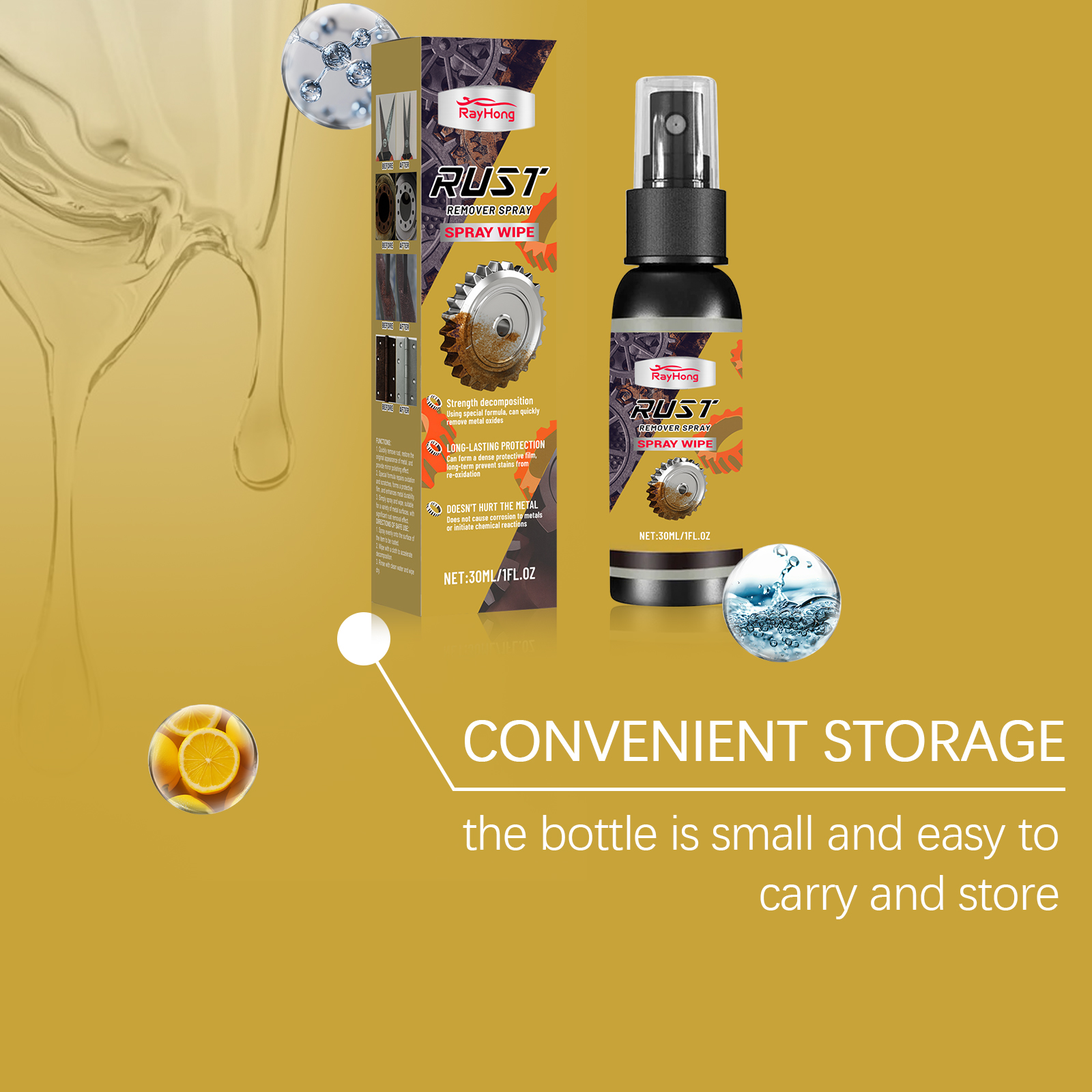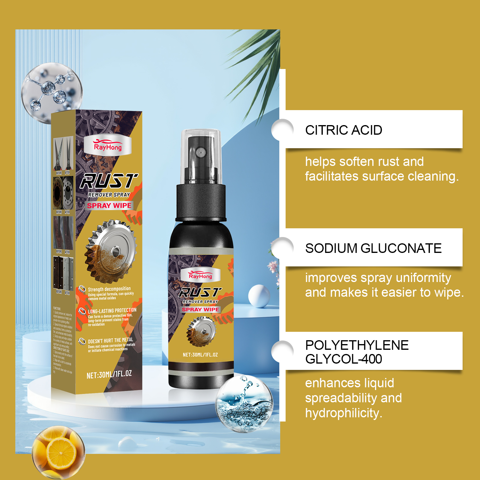 我们的金属除锈喷雾,由柠檬酸、葡萄糖酸钠精心调配而成。专为快速去除铁锈,恢复金属原貌,提供镜面抛光效果设计。使用方法极为便捷:1.均匀喷洒到要去除锈迹的物品表面。2.用布擦拭以加速分解。3.用清水冲洗干净,然后擦干。并且它特制配方可以修复氧化和划痕,形成保护膜,增强金属耐久性,简单喷洒擦拭即可,适用于多种金属表面,除锈效果显著。