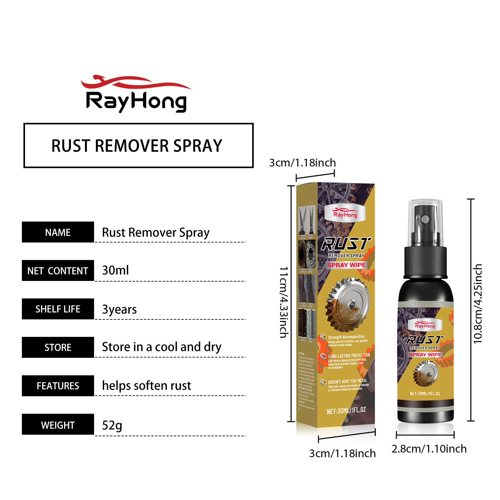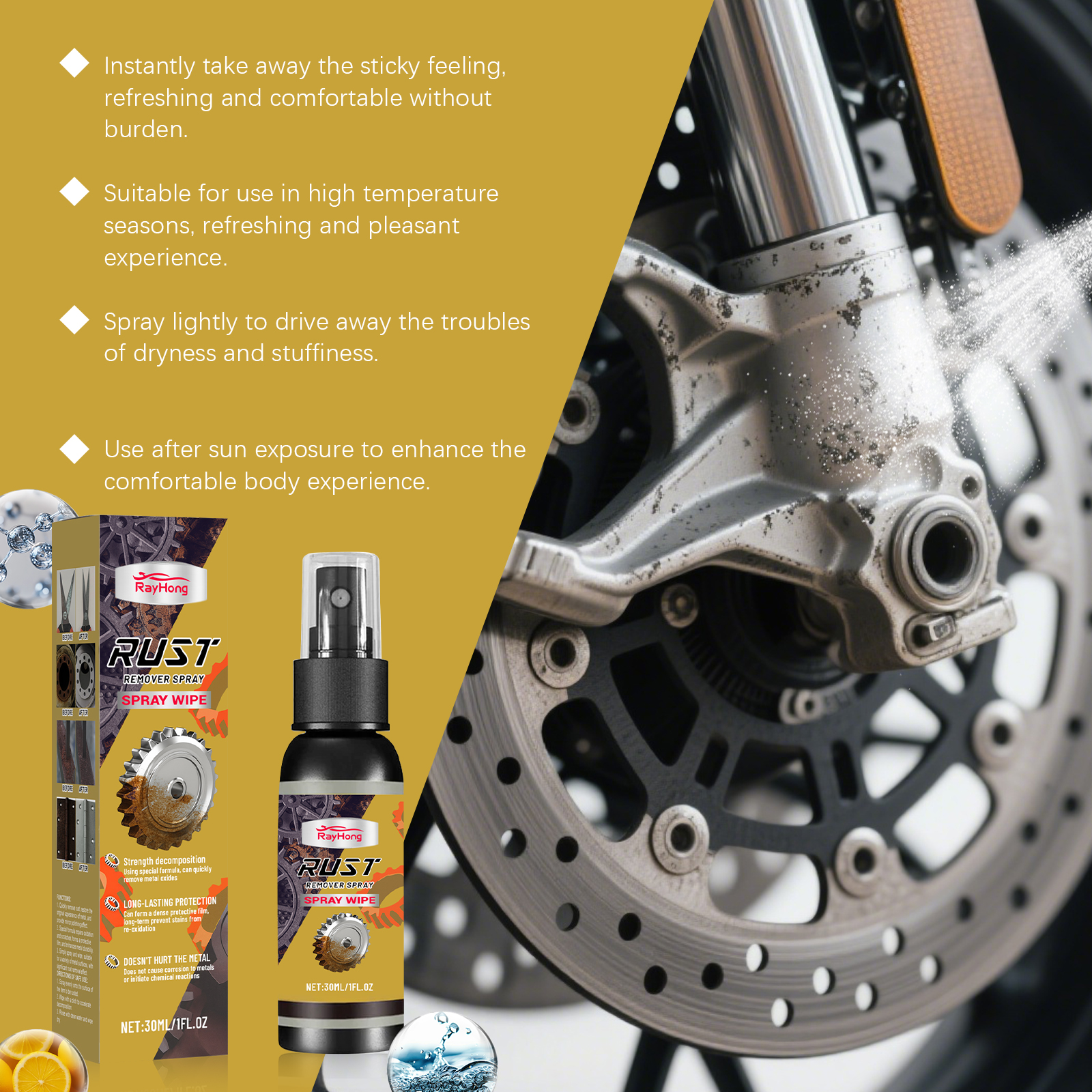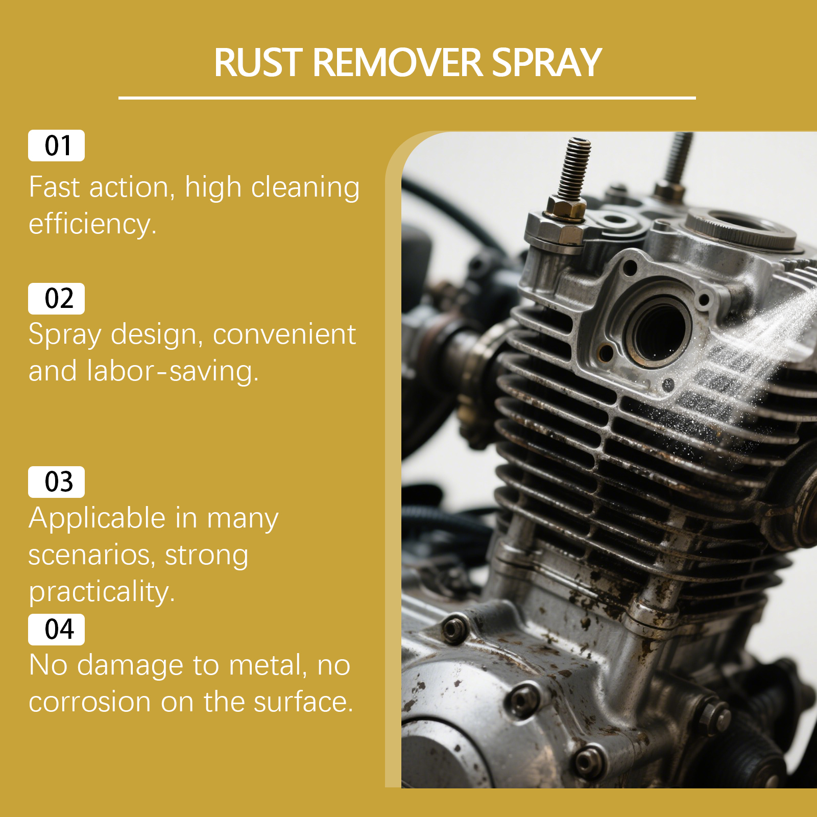我们的金属除锈喷雾,由柠檬酸、葡萄糖酸钠精心调配而成。专为快速去除铁锈,恢复金属原貌,提供镜面抛光效果设计。使用方法极为便捷:1.均匀喷洒到要去除锈迹的物品表面。2.用布擦拭以加速分解。3.用清水冲洗干净,然后擦干。并且它特制配方可以修复氧化和划痕,形成保护膜,增强金属耐久性,简单喷洒擦拭即可,适用于多种金属表面,除锈效果显著。