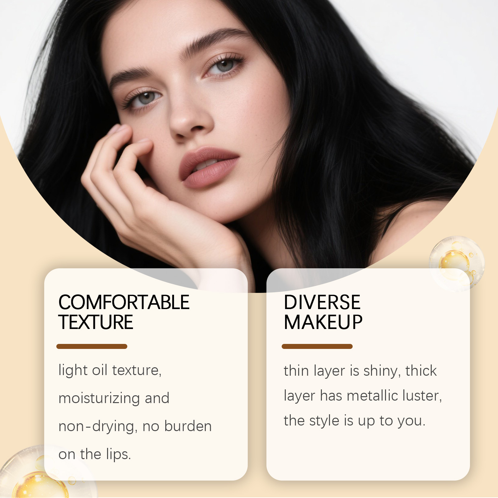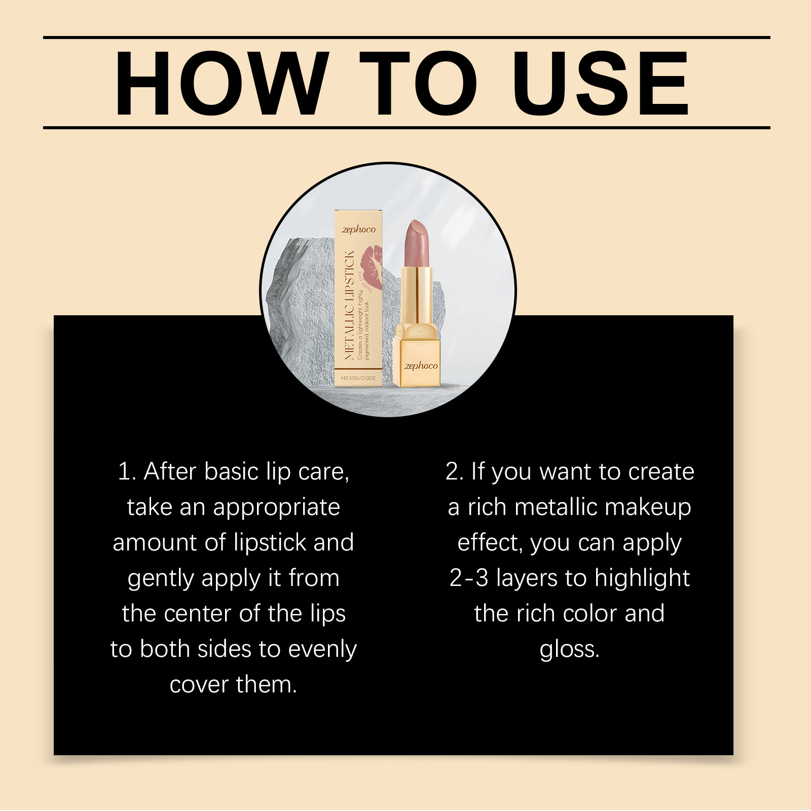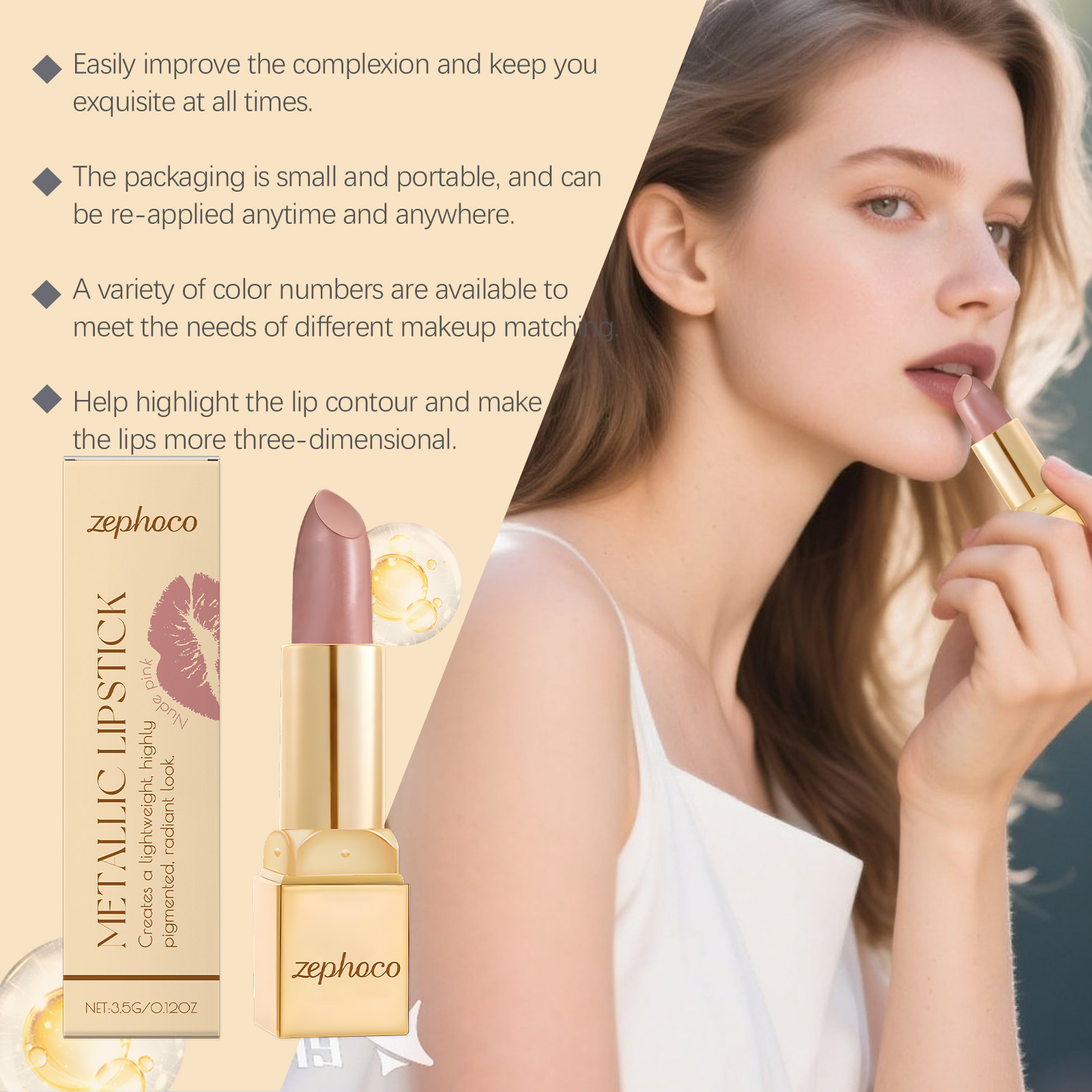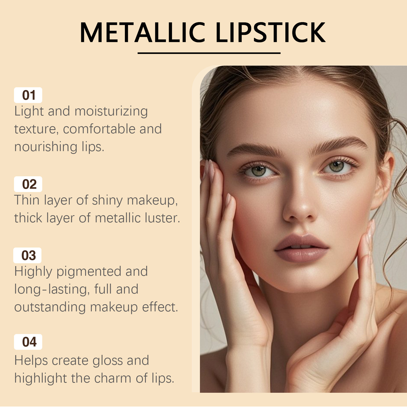 我们的金属奶油唇膏,由矿脂、矿油、聚异丁烯精心调配而成。专为唇部带来滋润,减少干燥感,薄层涂抹呈现均匀闪亮妆感,厚涂展现大胆金属光泽设计。使用方法极为便捷:1. 唇部基础护理后,取适量唇膏,从唇部中央向两侧轻轻涂抹,均匀覆盖即可。 2. 若想打造浓郁金属妆效,可叠加涂抹2-3层,凸显饱满色泽与光泽。 并且它高度着色,能打造色泽饱满、浓郁的唇部妆容,助力凸显唇部轮廓,提升整体妆面的精致度与吸引力。