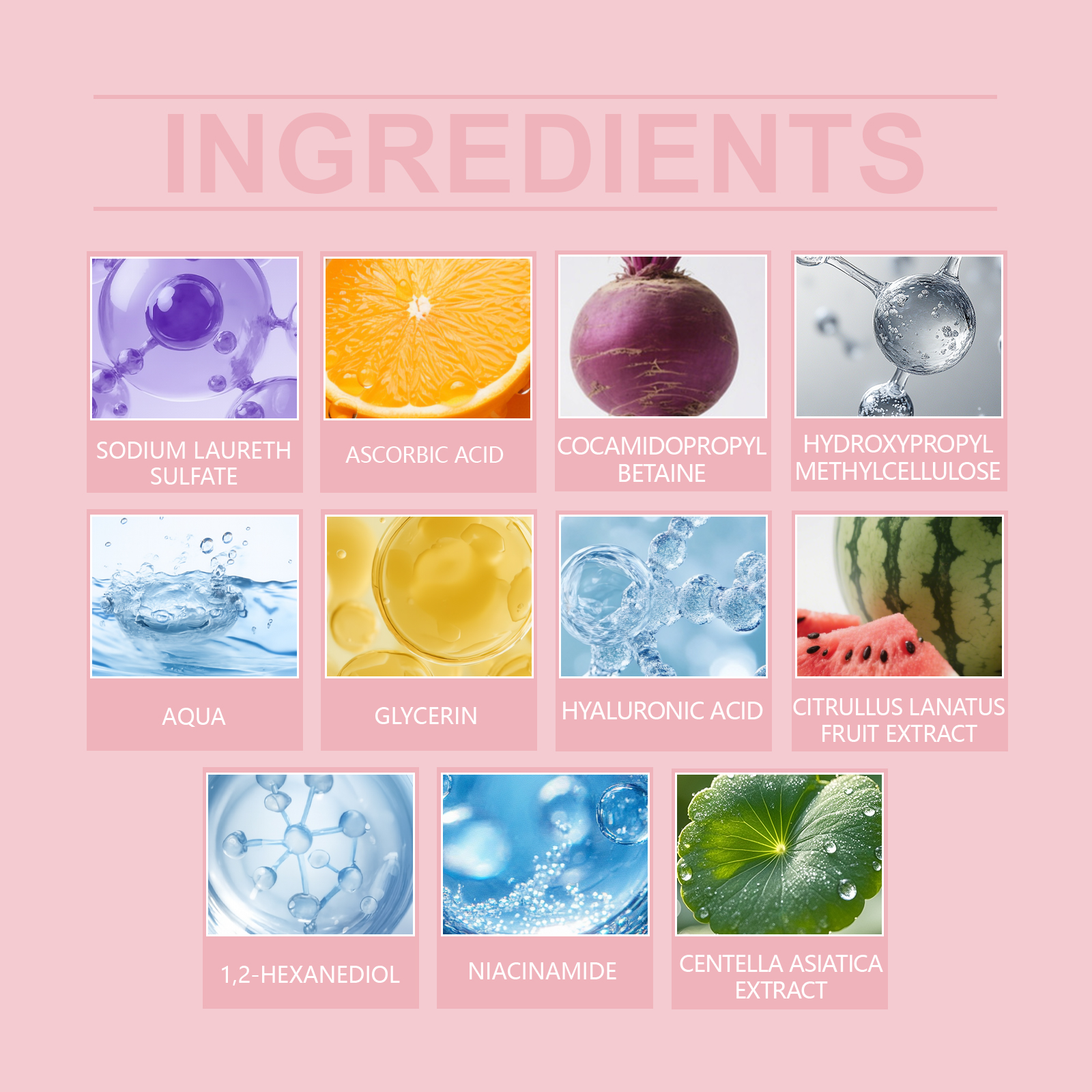 我们的西瓜泡沫洗面奶,由月桂醇聚醚硫酸酯钠、甘油精心调配而成。专为温和帮助去除肌肤上的污垢、油脂和化妆残留物,助力产生丰富泡沫,实现有效清洁设计。使用方法极为便捷:用温水湿润面部,取适量本产于手心,搓揉起泡。轻轻按摩面部 1-2分钟,用清水冲洗干净。并且它可以清洁同时支持肌肤保湿,防止干燥,协助维持面部洁净清爽的外观。