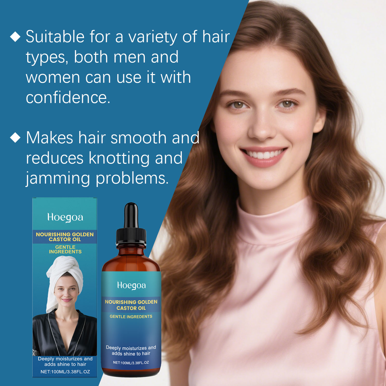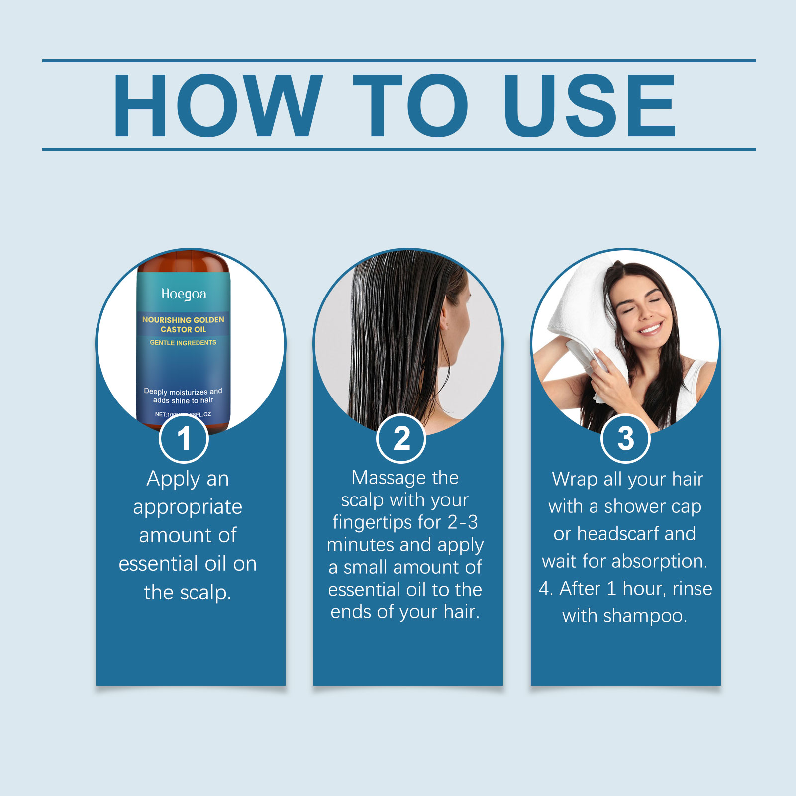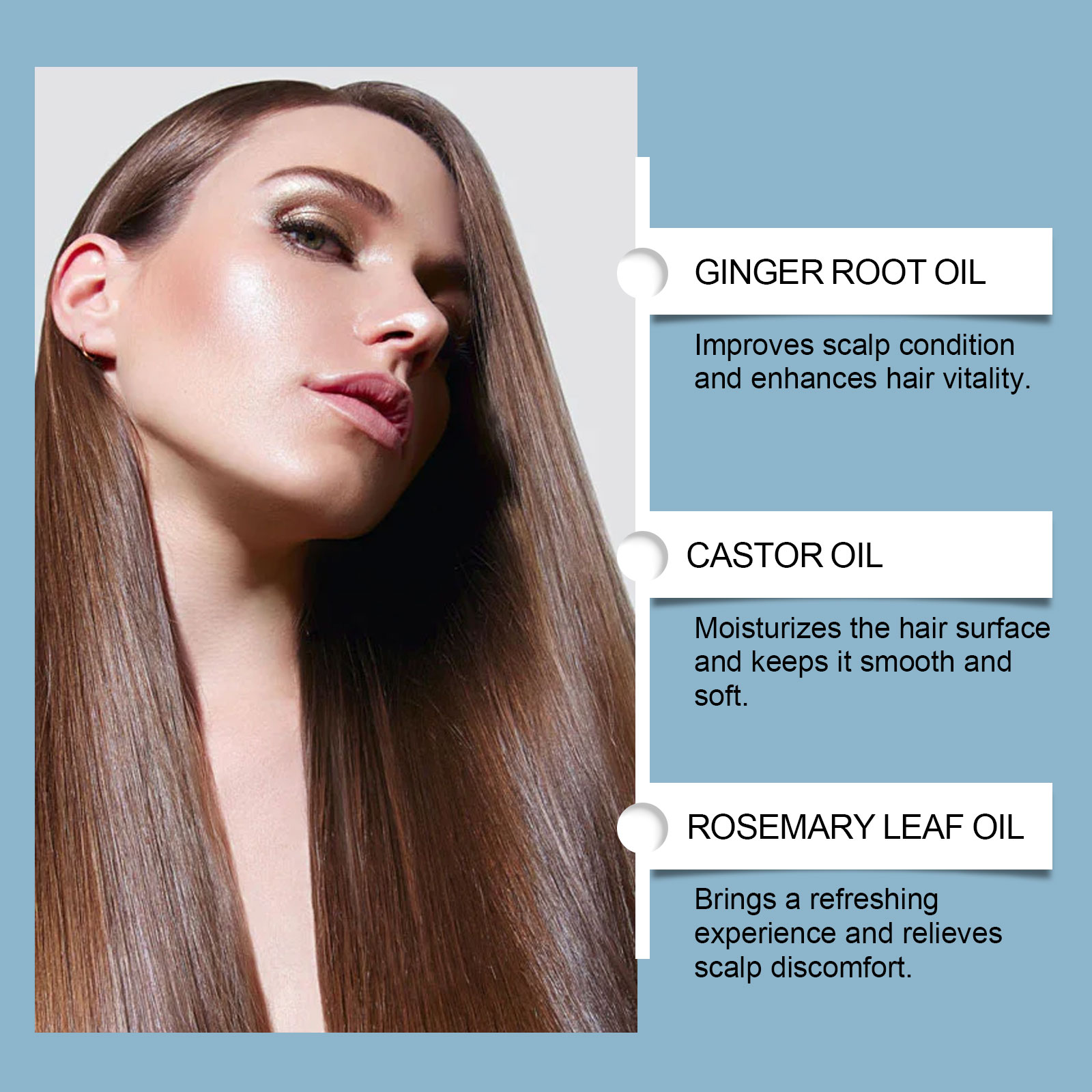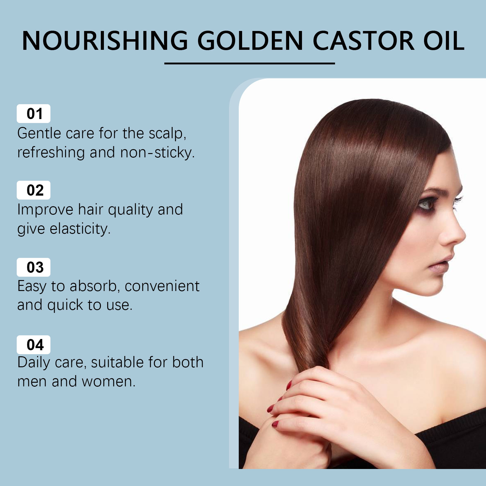 我们的滋润保湿护发精油,由姜根油、蓖麻油、迷迭香叶油精心调配而成。专为改善头皮状况并增强头发韧性设计。使用方法极为便捷:1.取适量精油在头皮上。2.用指尖按摩头皮2-3分钟,并涂抹少量精油于发尾。3.用浴帽或头巾将所有头发包裹,等待吸收。4.1小时后,用洗发水冲洗干净即可。并且适合日常使用,带来清爽体验。