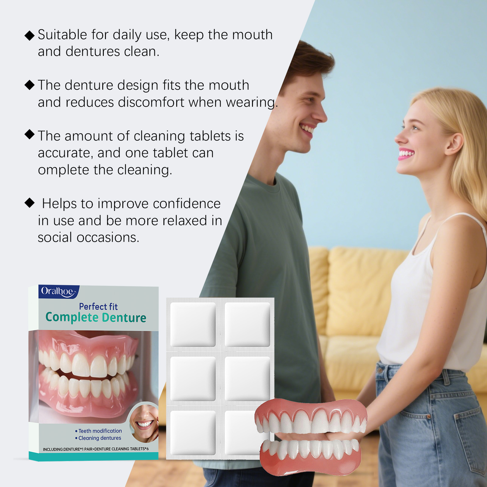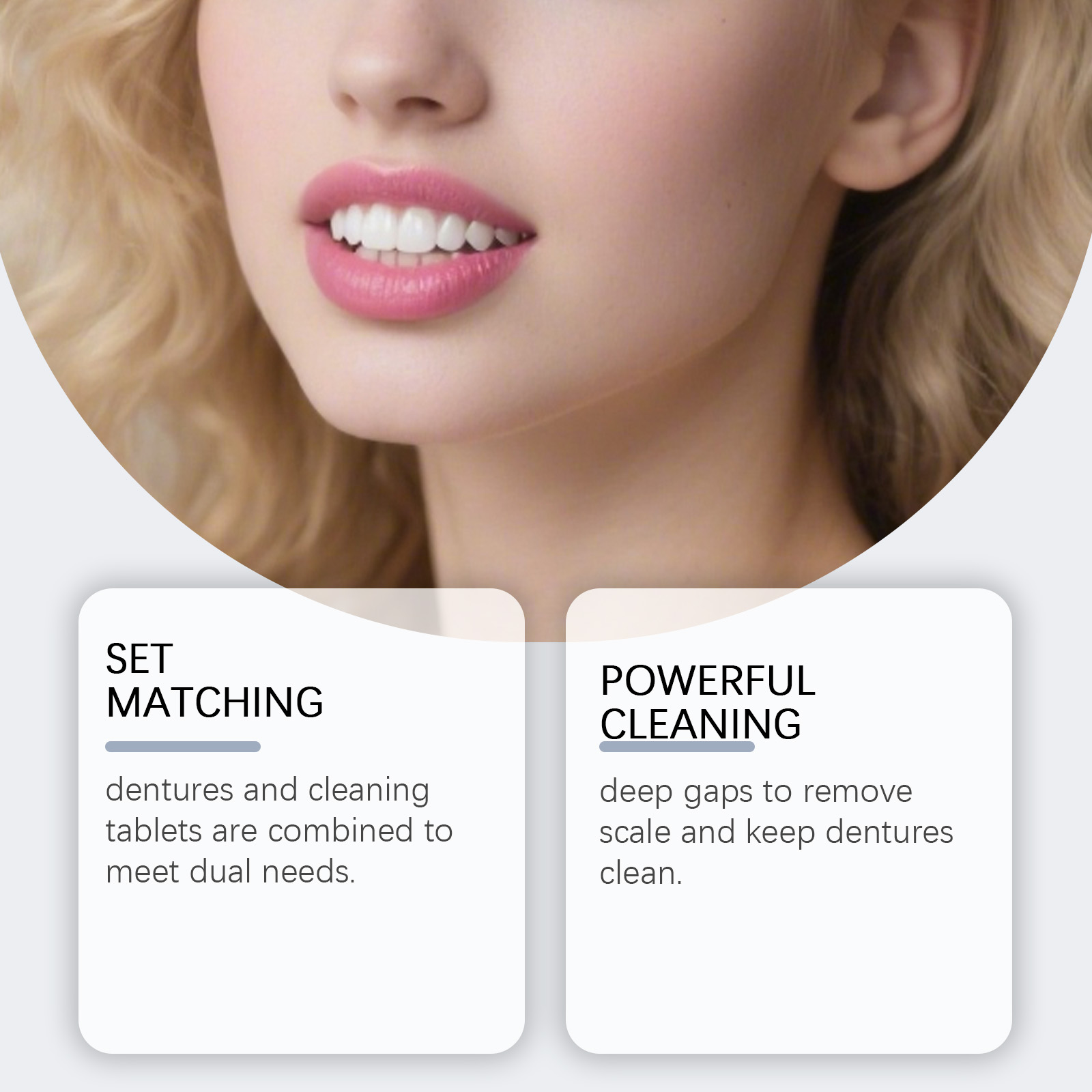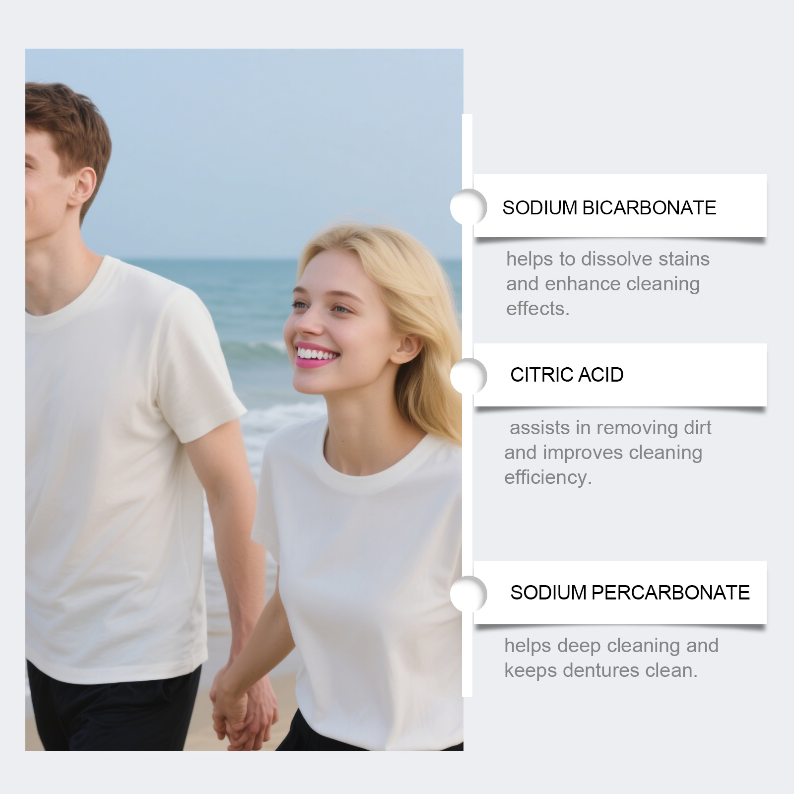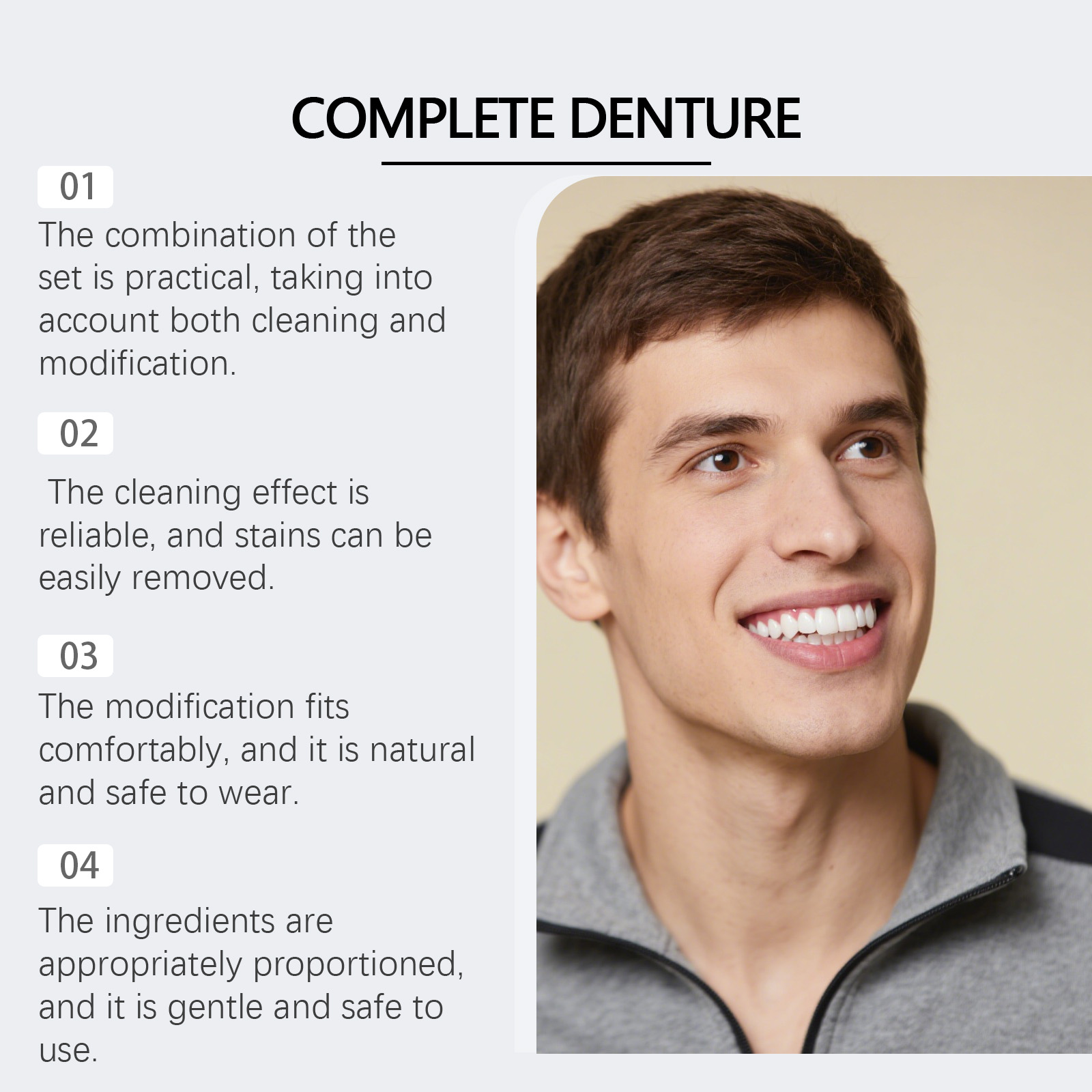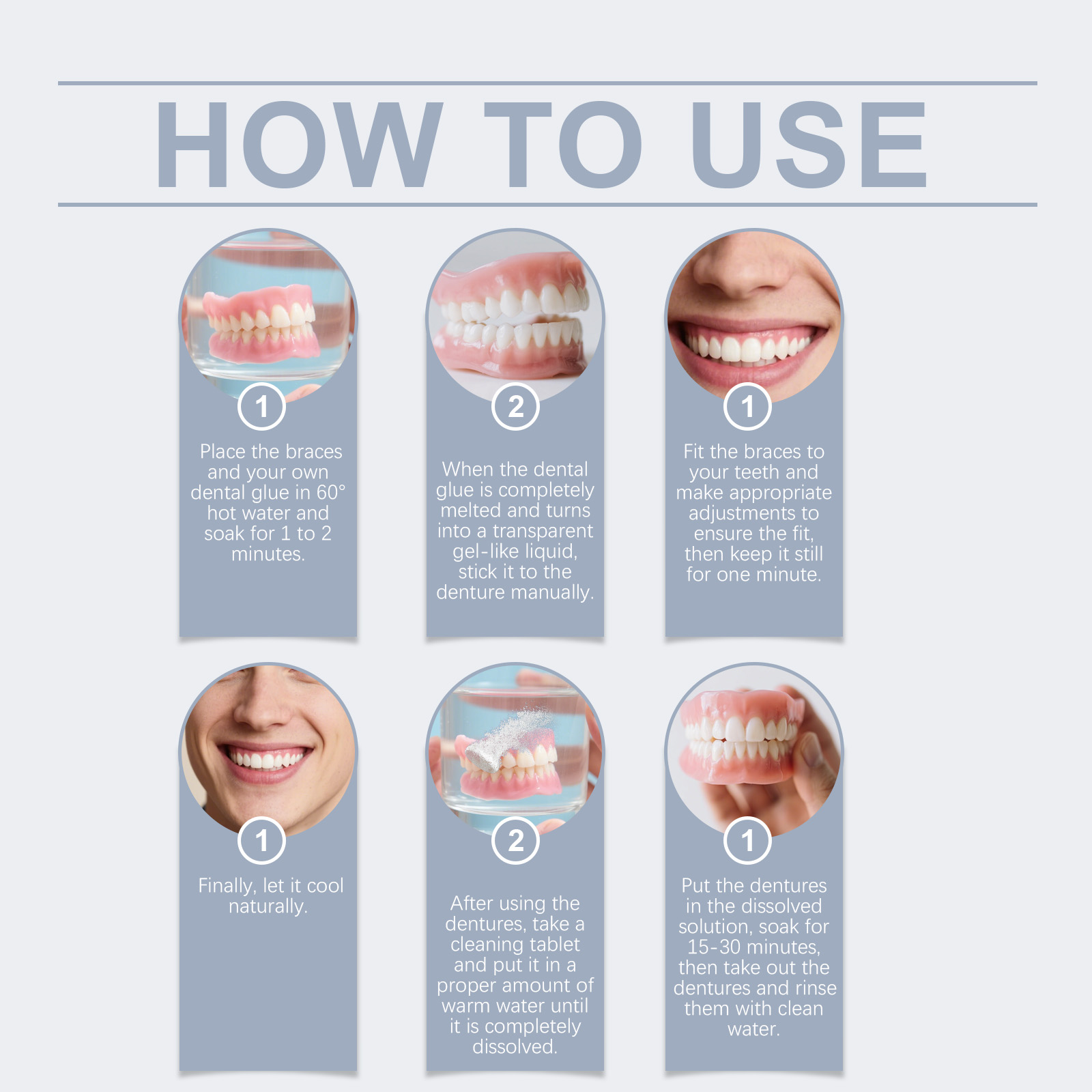 我们的假牙修饰清洁套装,由十二烷基硫酸钠、混合酶精心调配而成。专为去除牙垢并保持假牙清洁设计。使用方法极为便捷:1.将牙套与自备的牙胶一并置于60°的热水中,浸泡1至2分钟。2.当牙胶完全融化并转变为透明胶状液体状态时,将其手动粘到假牙上。3.将牙套贴合至您的牙齿上,并进行适当的调整,以确保适配度,随后请保持静止状态一分钟。4.最后待其自然冷却即可。5.每次假牙使用完毕,取一片清洁片放入适量温水中,待其完全溶解。6.将假牙放入溶解后的溶液中,浸泡 15-30 分钟后取出假牙,用清水冲洗干净。并且可以深入缝隙除垢,保持假牙洁净状态。