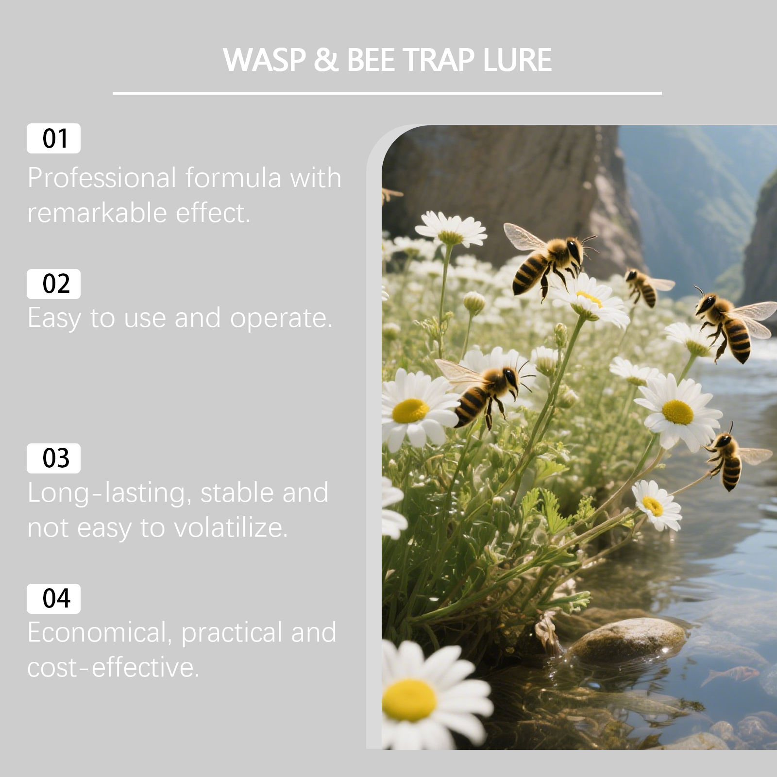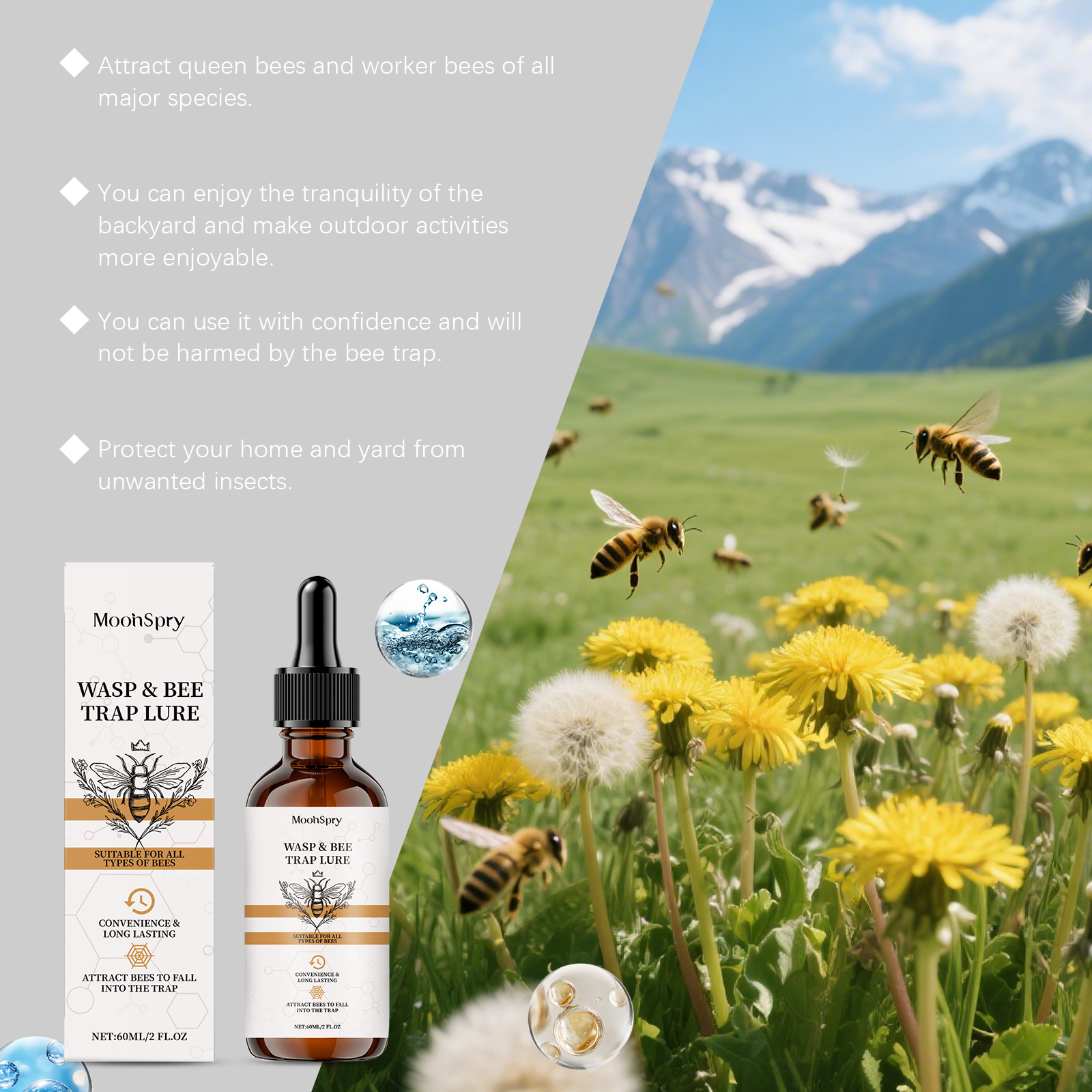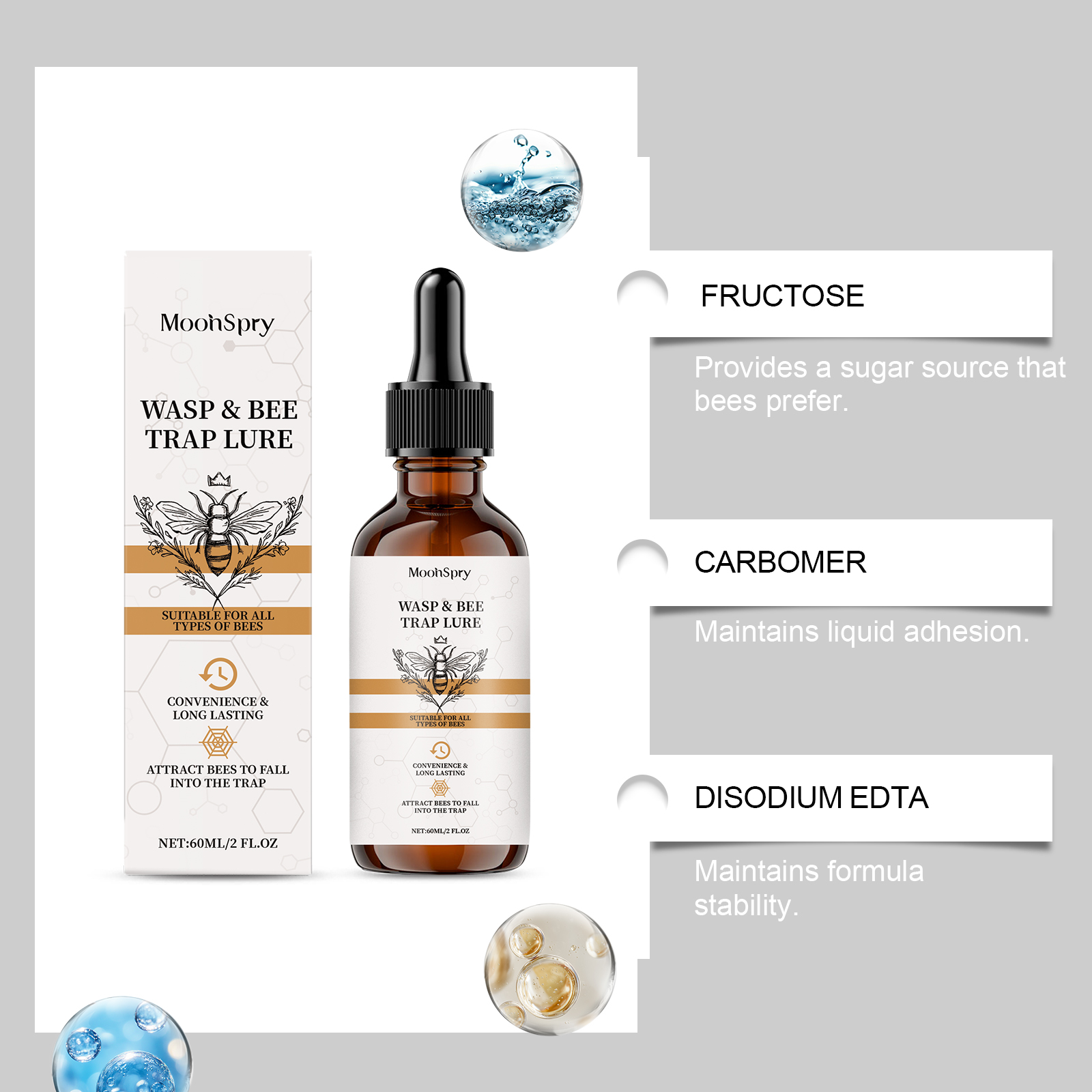 我们的蜜蜂引诱剂,由糖精钠、乙二胺四乙酸二钠精心调配而成。专为快速吸引蜜蜂聚集设计。使用方法极为便捷:只需将本产品放置在户外靠近大量蜜蜂的地方。并且可以保护您的家和院子免受不想要的昆虫侵害。